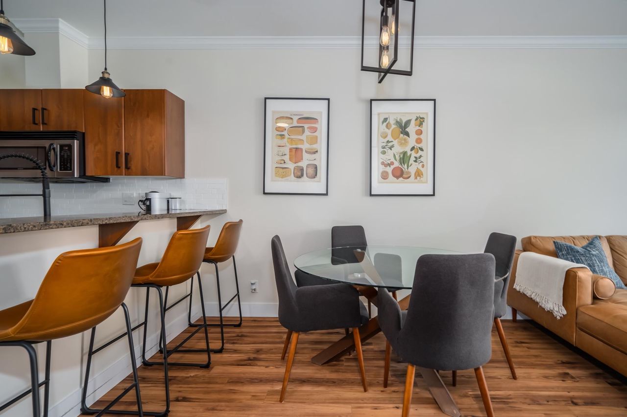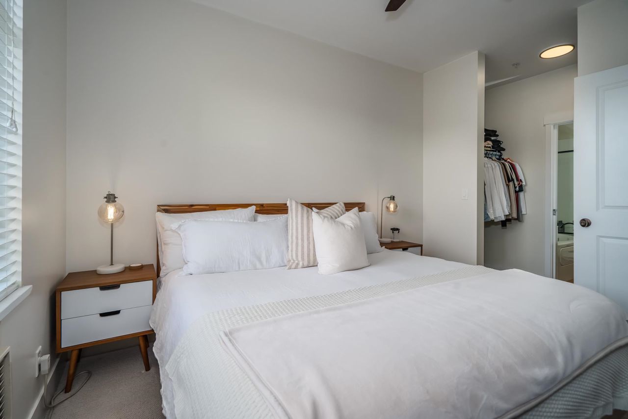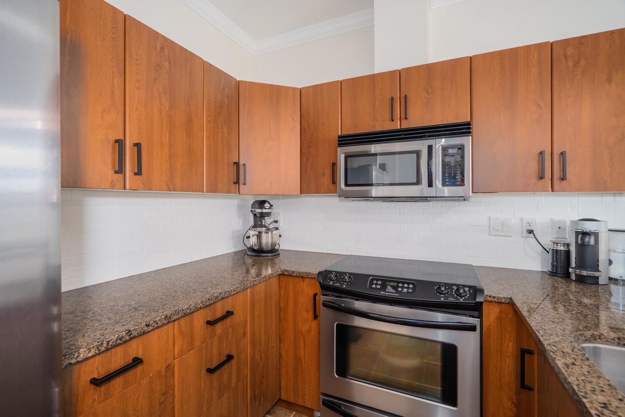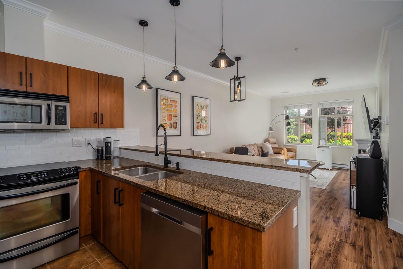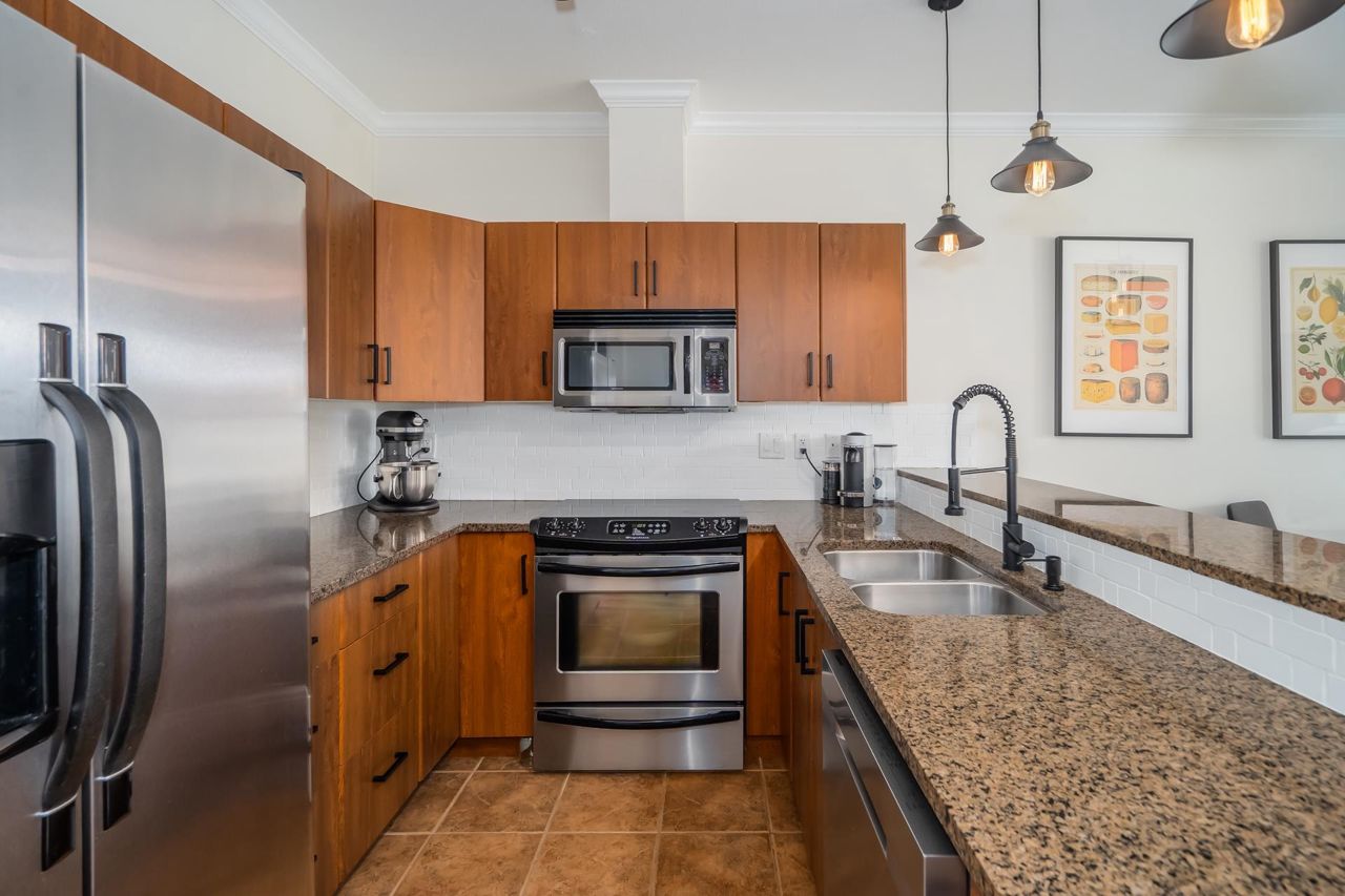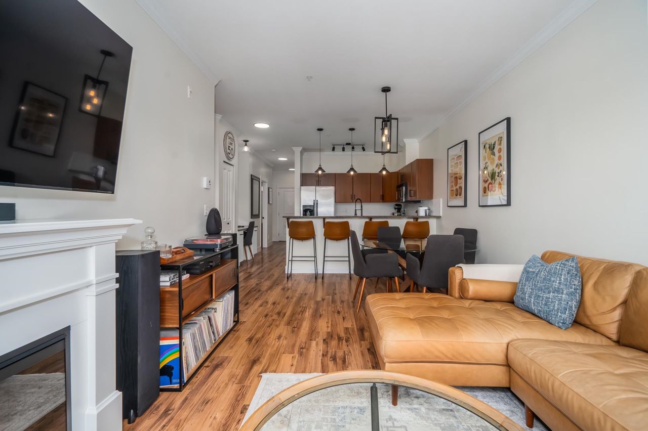Enjoy Historic Downtown Abbotsford living at Yale Crossing just steps from several cafes, restaurants and shopping. You will appreciate the level of detail found in this clean and updated two bedroom and two bathroom condo. Open kitchen, dining and living room areas. Primary bedroom has built-in A/C. Beautiful 5-piece ensuite plus full family bathroom. Large laundry with ample space for storage. Other features: granite, newer flooring and light fixtures, fresh paint and electric fireplace. Reasonable fee of $311/month and welcoming all ages, rentals and 2 dogs or cats. One secure underground parking stall, additional storage locker, ample visitor parking as well as street parking. Yale Crossing has onsite caretaker and two garage doors accessing underground parking. Open house June 17 2-4.