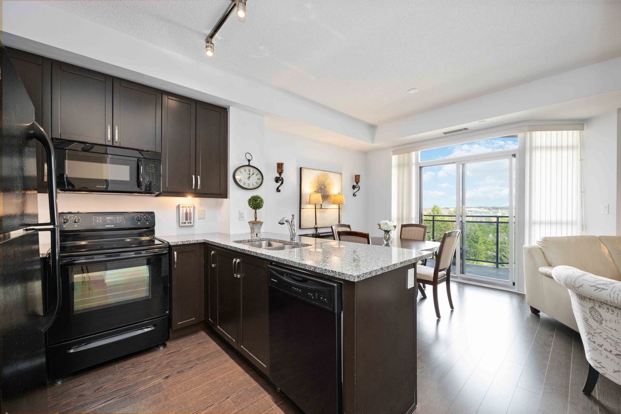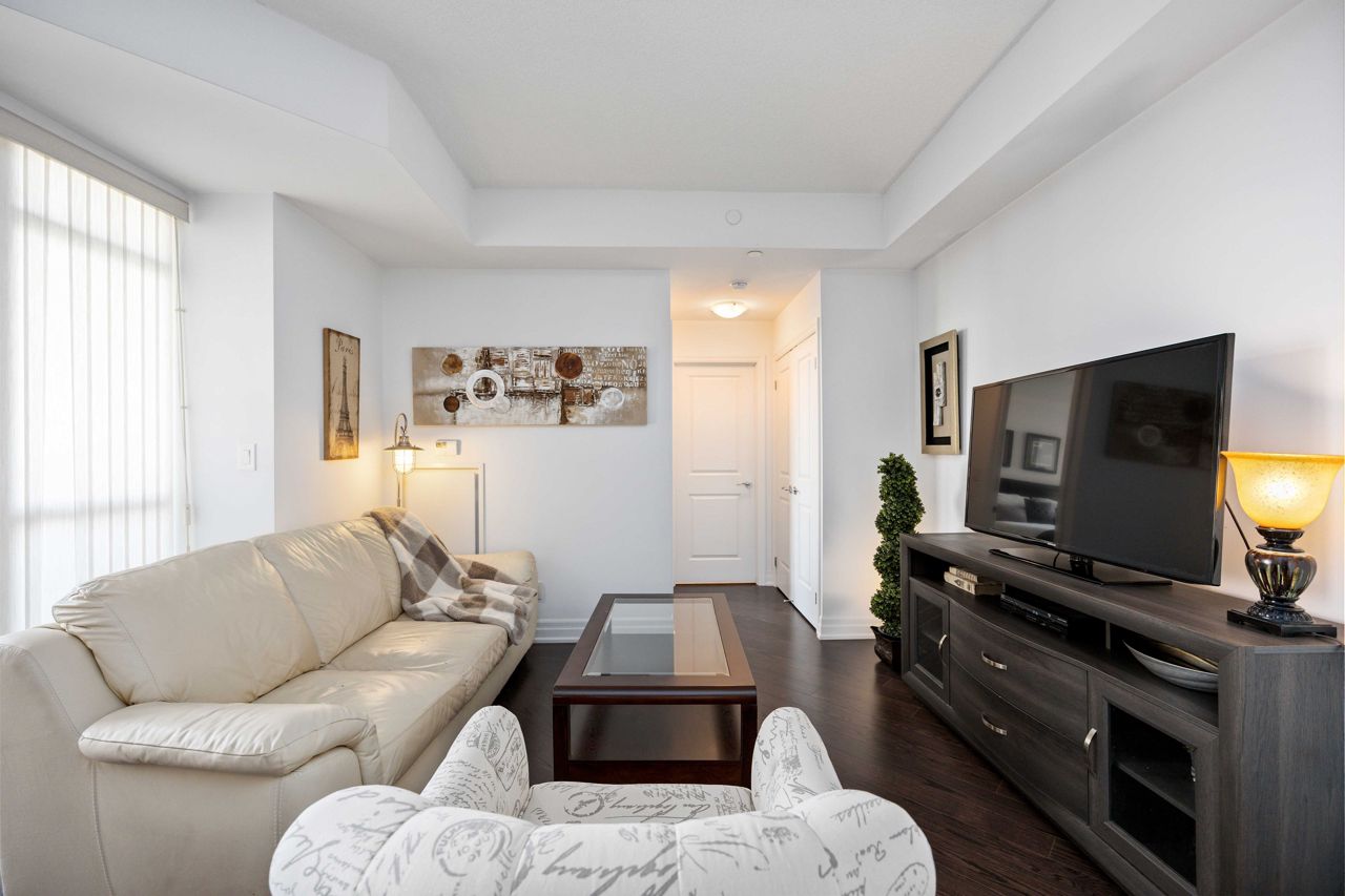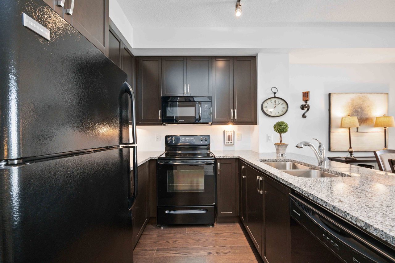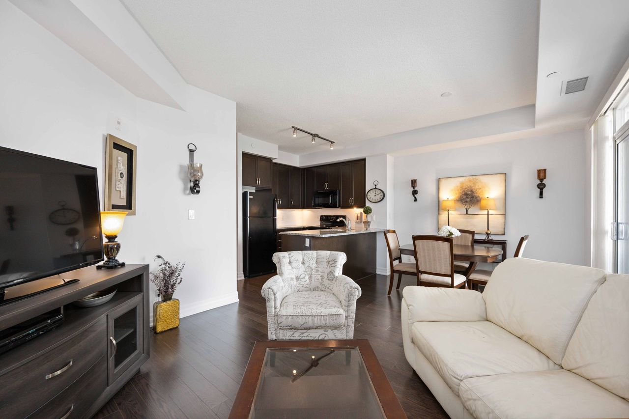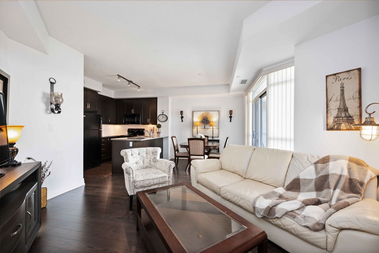 Welcome to the sought-after Ridgewood 2 Condos! Discover this beautiful, light-filled 1-bedroom plus den unit, complete with granite countertops and engineered hardwood floors. Enjoy the benefit of tandem parking for 2 cars and a large north-east facing balcony with unobstructed views. The unit boasts a spacious layout with room for a dining table and features 9-foot high ceilings. The desirable building, set next to a park, offers resort-like amenities such as an outdoor saltwater pool, fitness centre, party room, theatre, Guest suites, BBQ area, Concierge, bike storage, garden plot and a pet spa! Ideally located, it's just a short walk to stores, banks, a movie theatre, restaurants, and transportation including Aurora Go Station. Easy access to Hwy 404 is an added bonus. The unit comes with a conveniently located parking spot near the elevator and a full storage locker.Includes all appliances: Fridge, Stove, Dishwasher, Washer/Dryer. All Light Fixtures. All Window Coverings. Also Includes all Furniture and Finishings (Please see Schedule of Included Items).