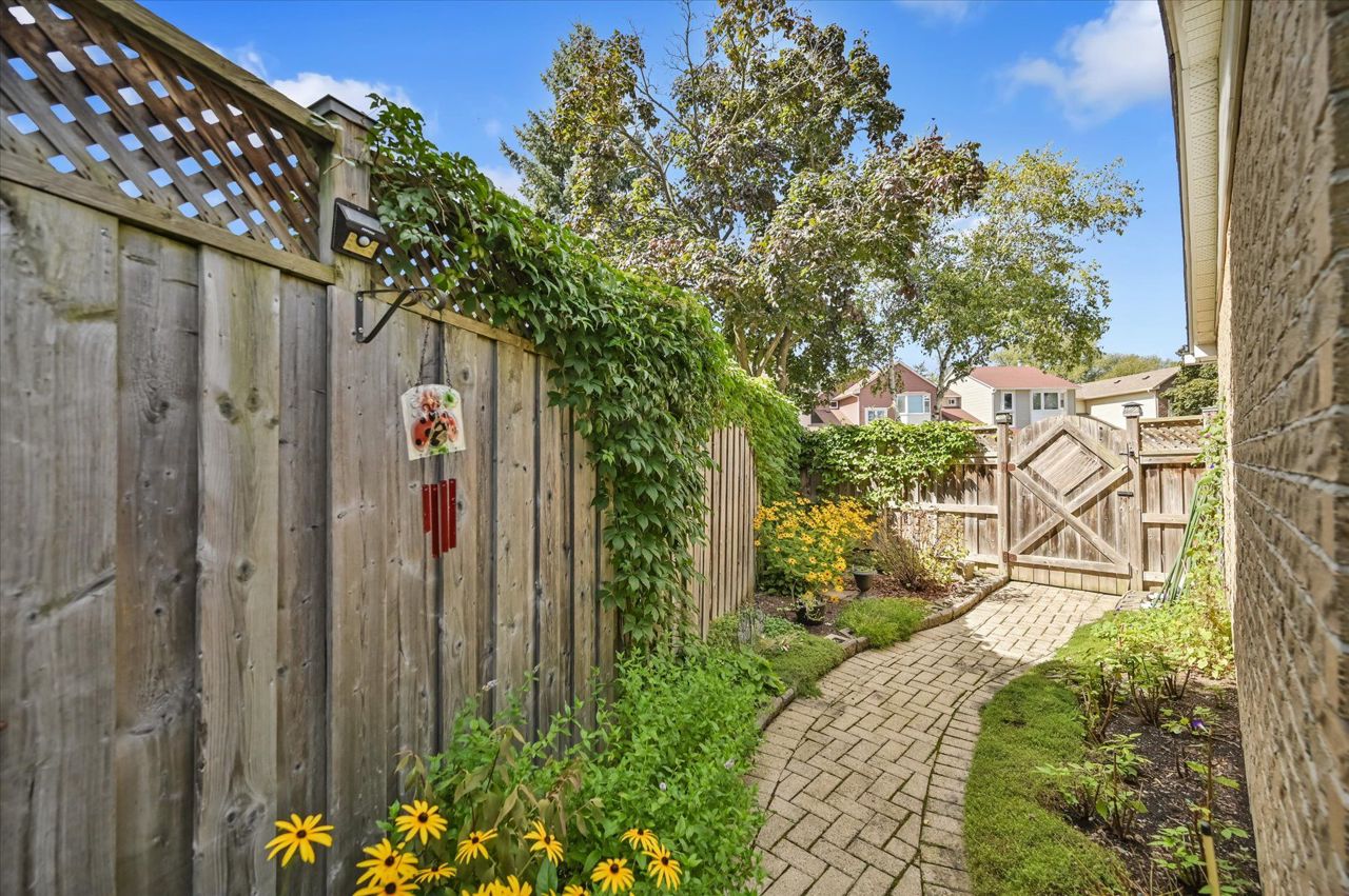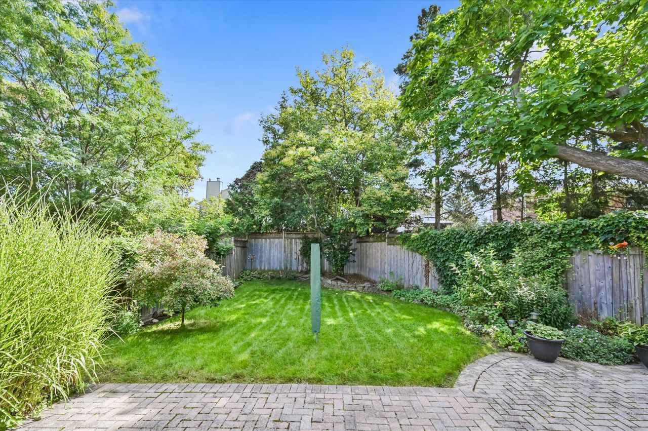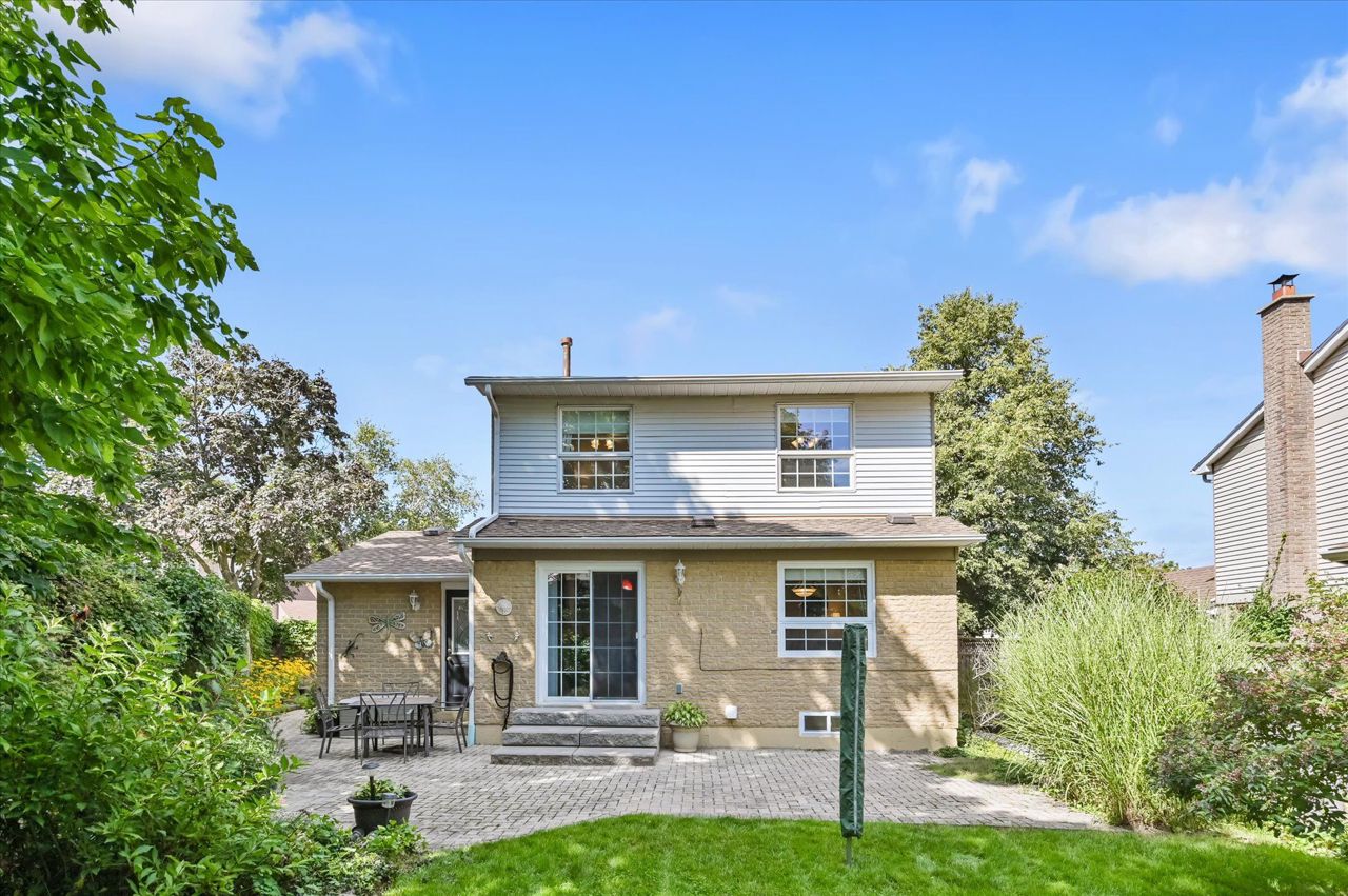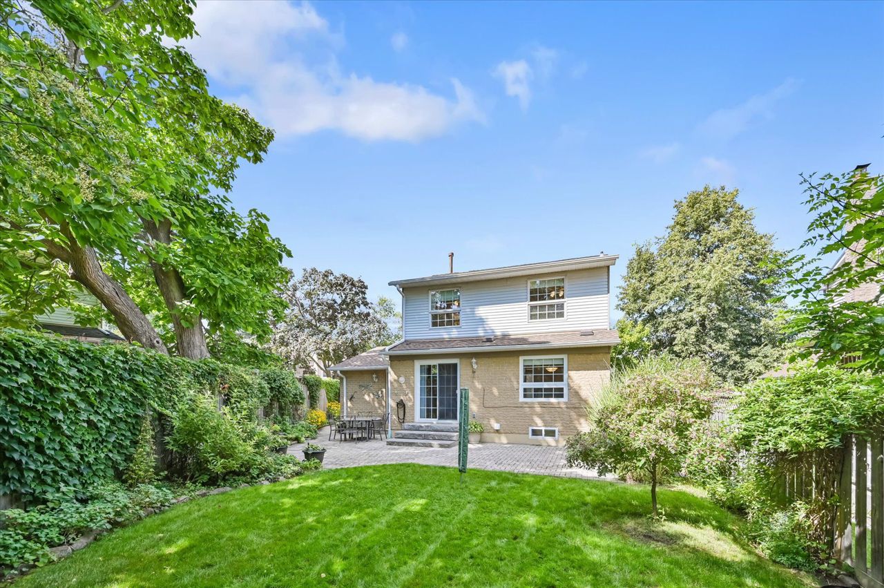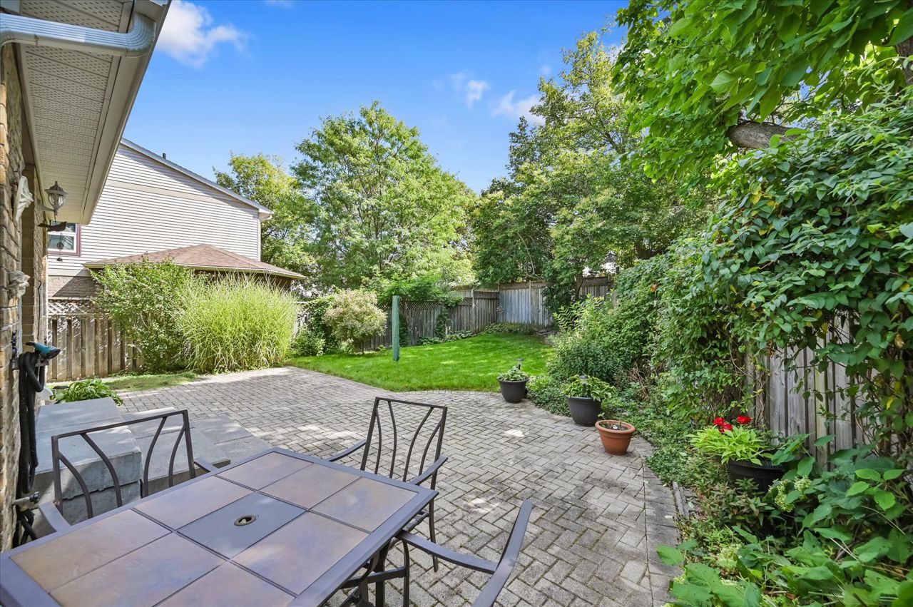 a gas fireplace, 4th bdrm in lower level has 3 piece ensuite & wall closet. This home boasts pot lights, wainscoting,, chair rail, crown mouldings,hardwood floors t/out. W/O from liv.rm to front Veranda and from kitchen to large and private interlocking patio and rear yard Oasis, with perennial gardens. Rear yard is fully fenced and has mature treed surround.Include: fridge, stove, b/in dishwasher, wash/dry, wine cooler "as is", stand up fridge freezer in