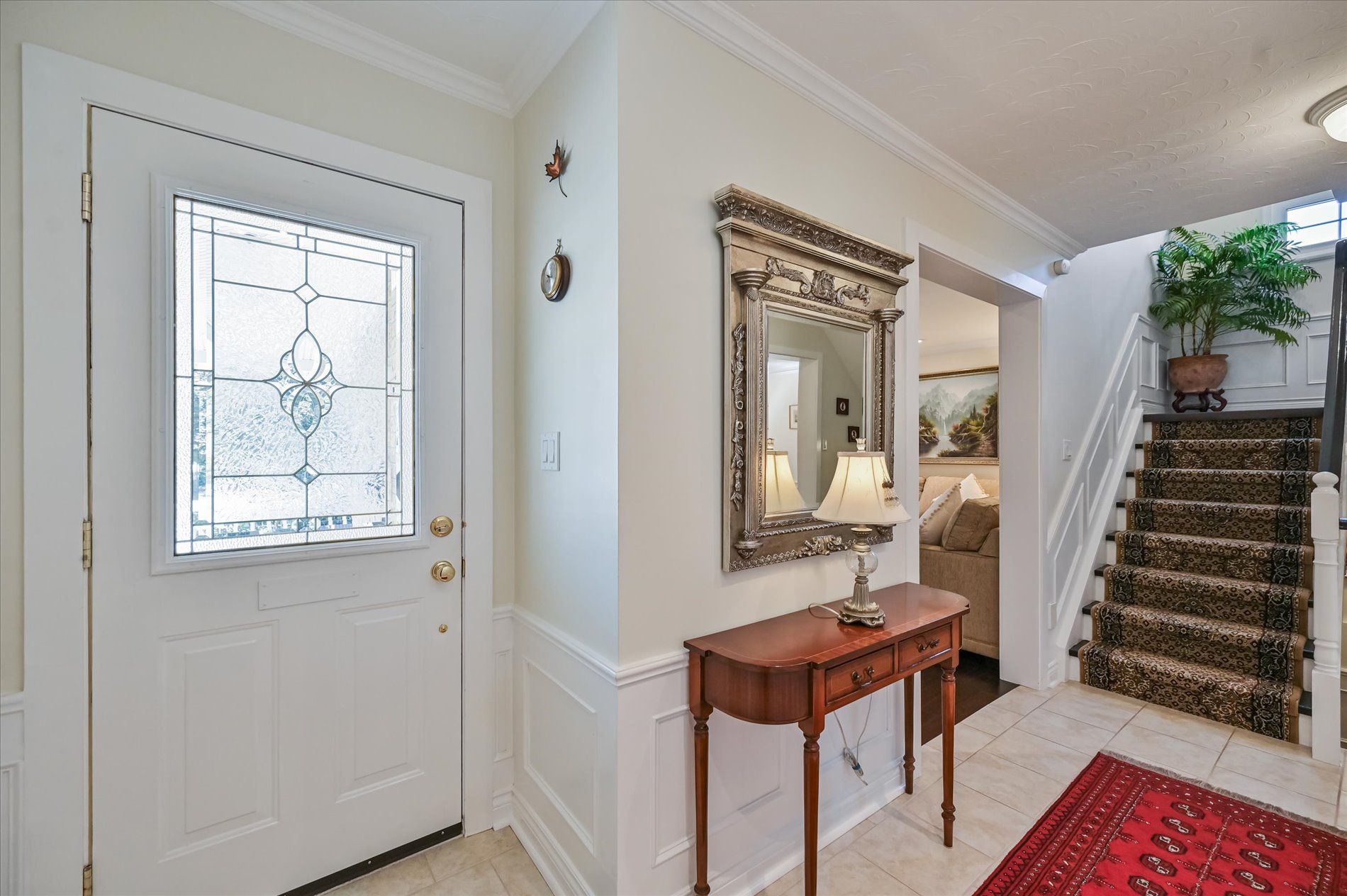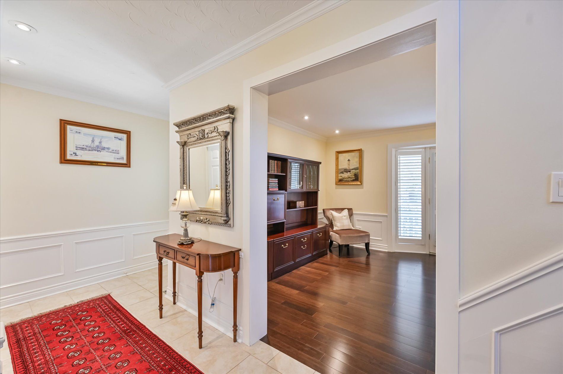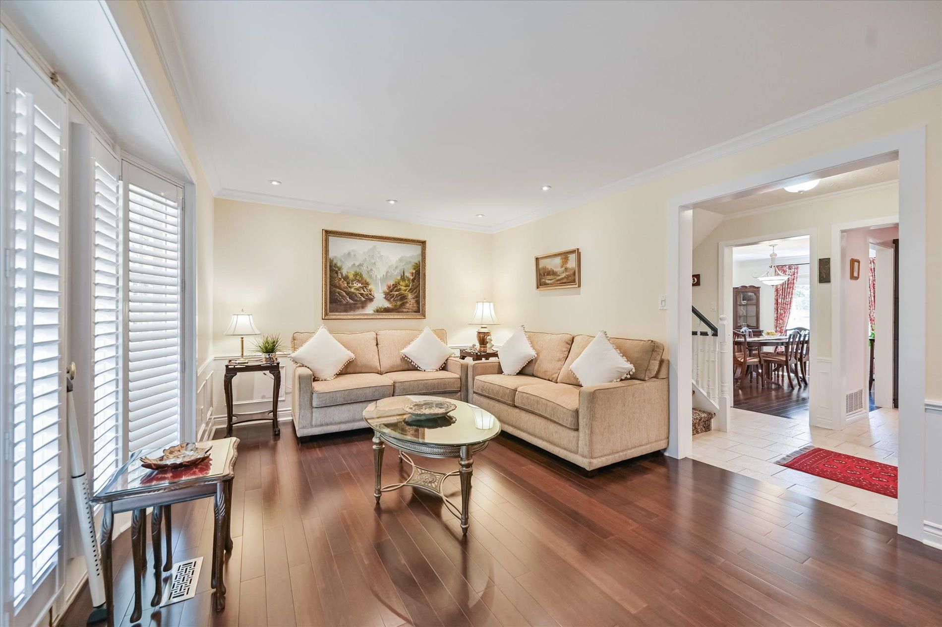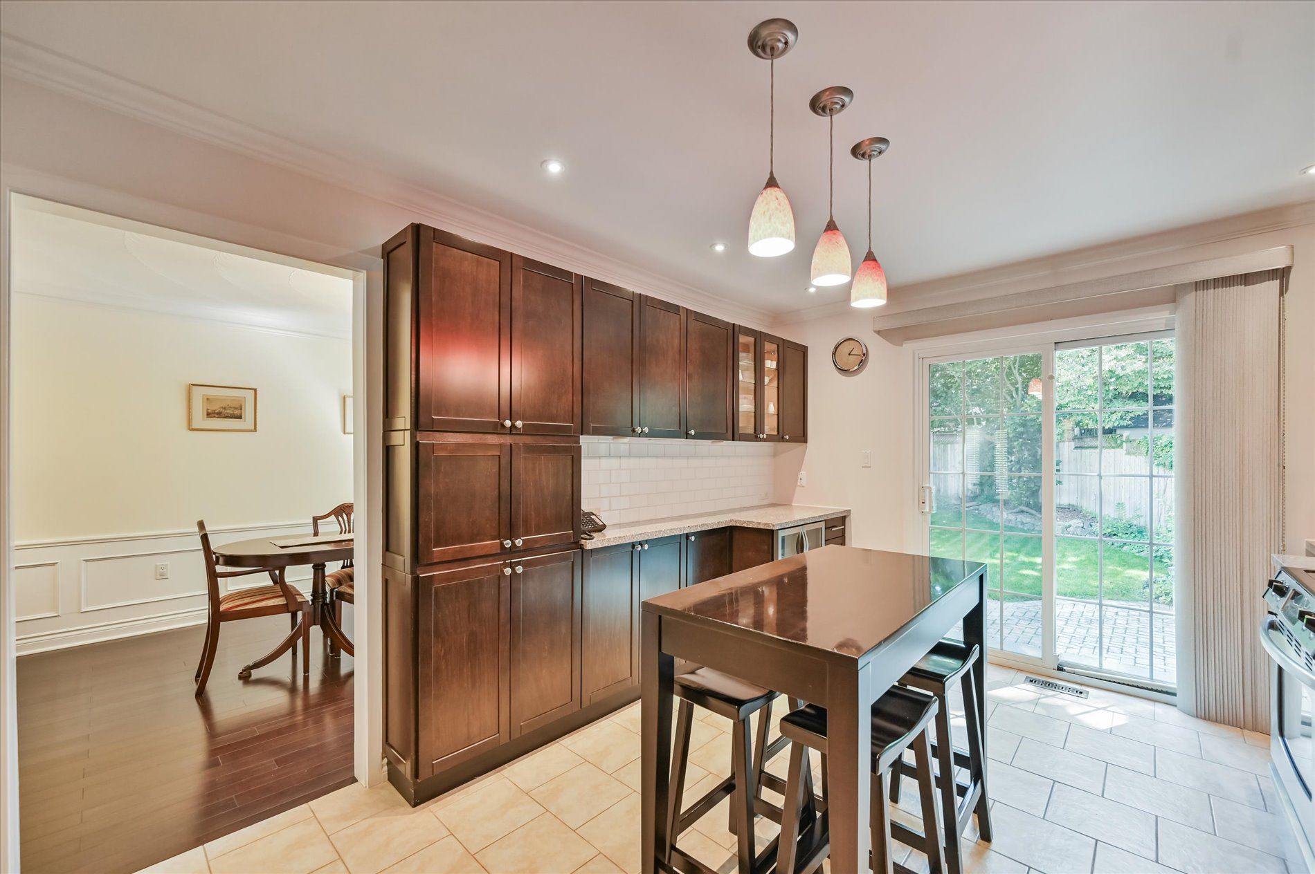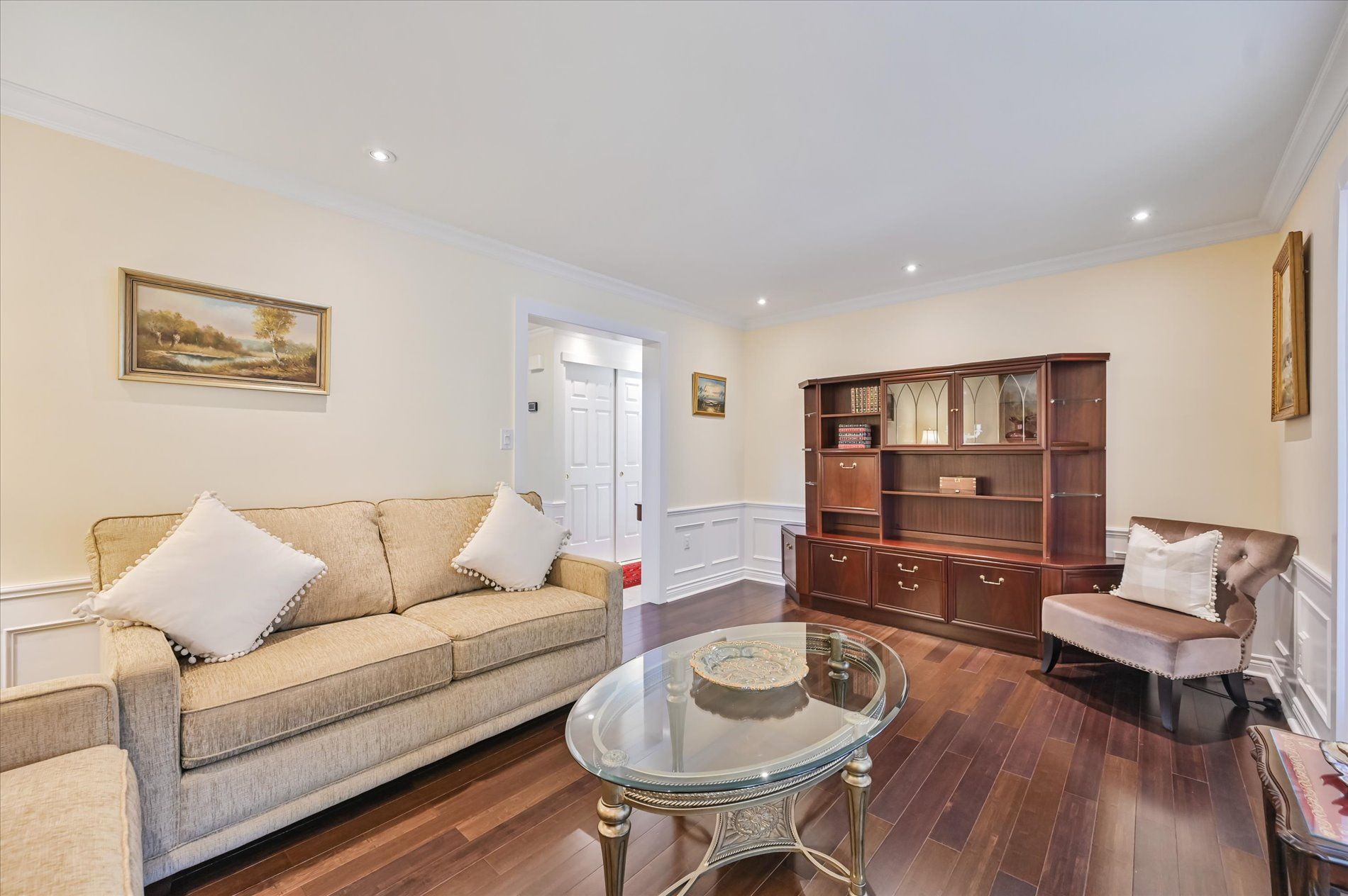 a gas fireplace, 4th bdrm in lower level has 3 piece ensuite & wall closet. This home boasts pot lights, wainscoting,, chair rail, crown mouldings,hardwood floors t/out. W/O from liv.rm to front Veranda and from kitchen to large and private interlocking patio and rear yard Oasis, with perennial gardens. Rear yard is fully fenced and has mature treed surround.Include: fridge, stove, b/in dishwasher, wash/dry, wine cooler "as is", stand up fridge freezer in