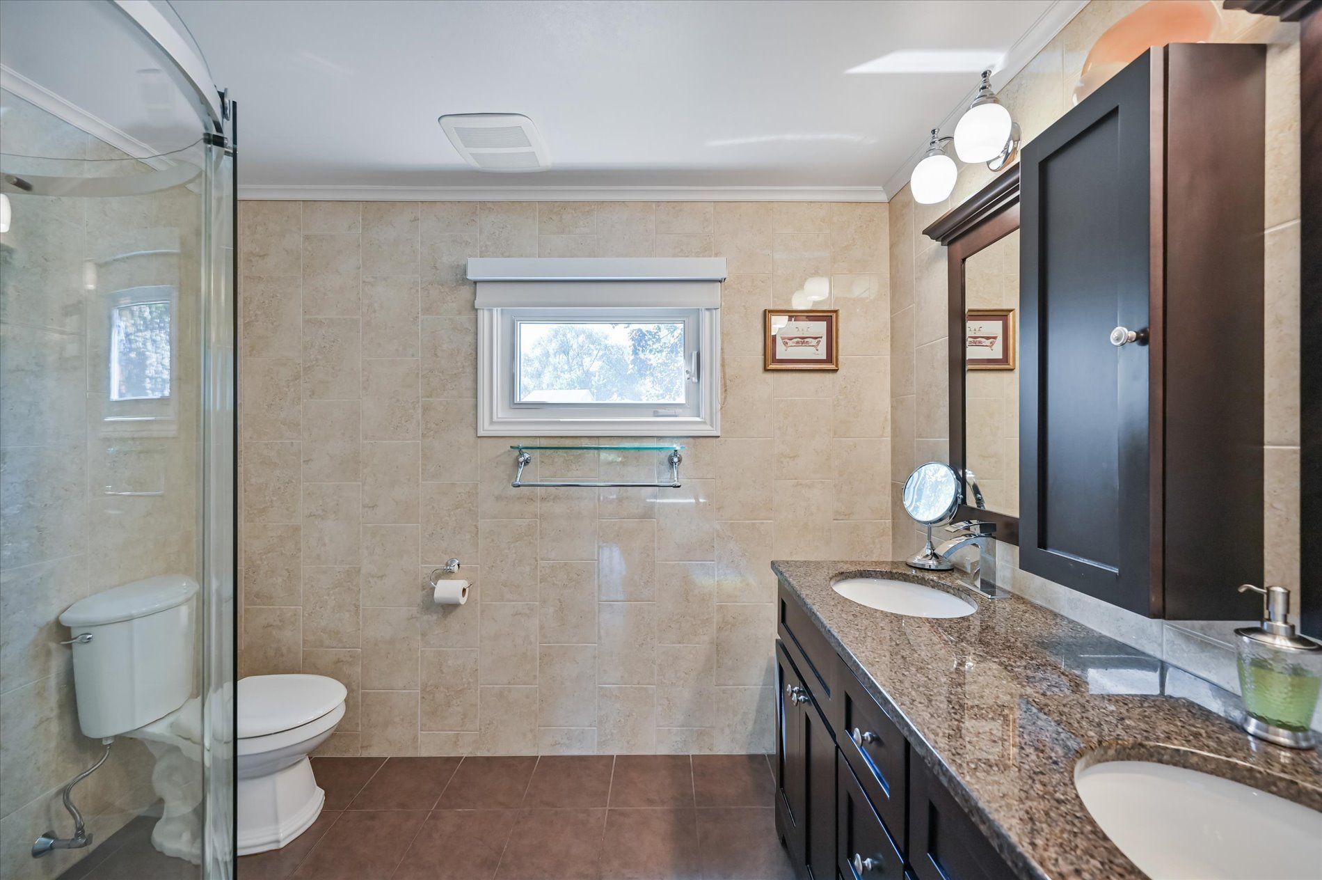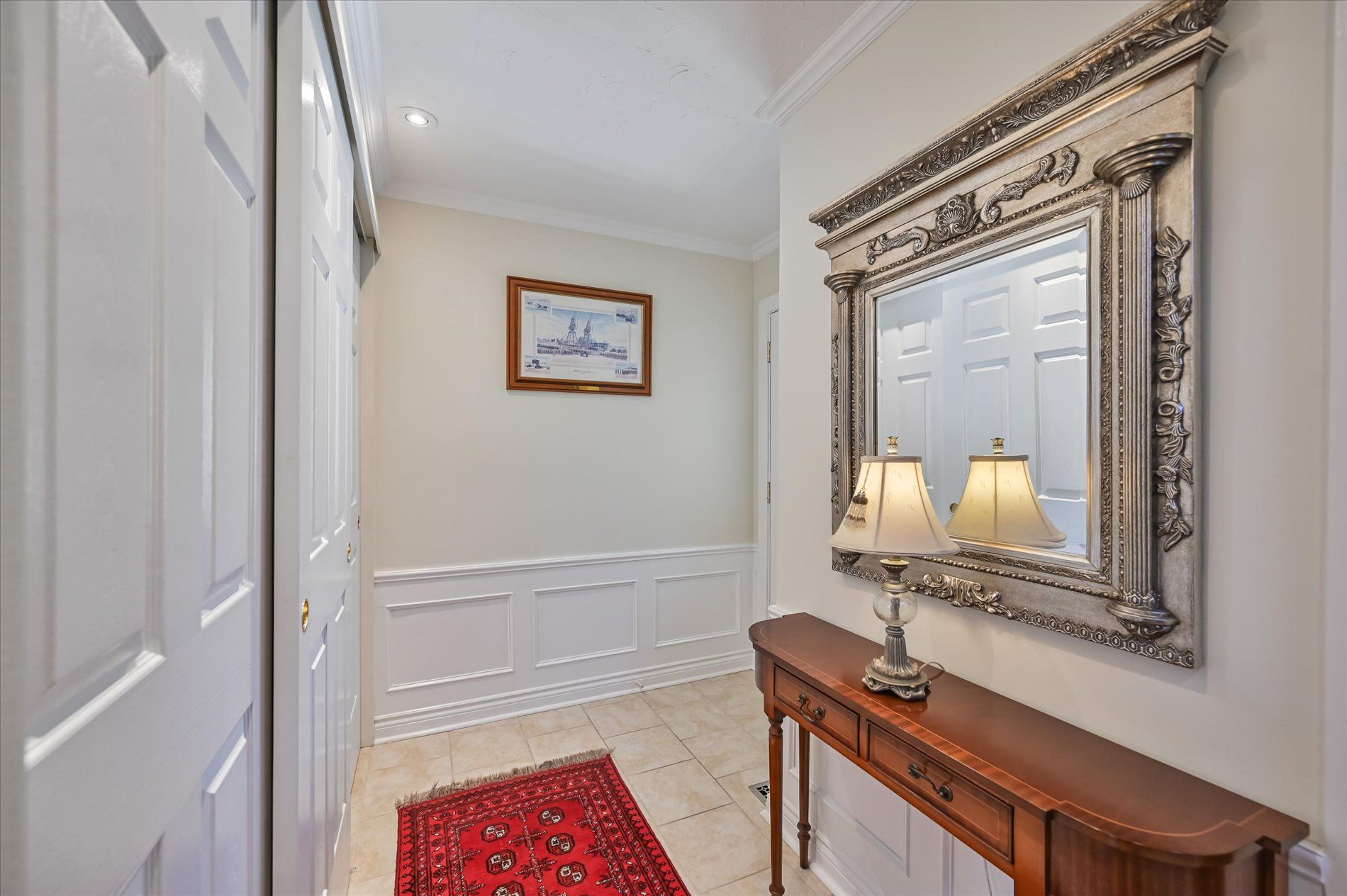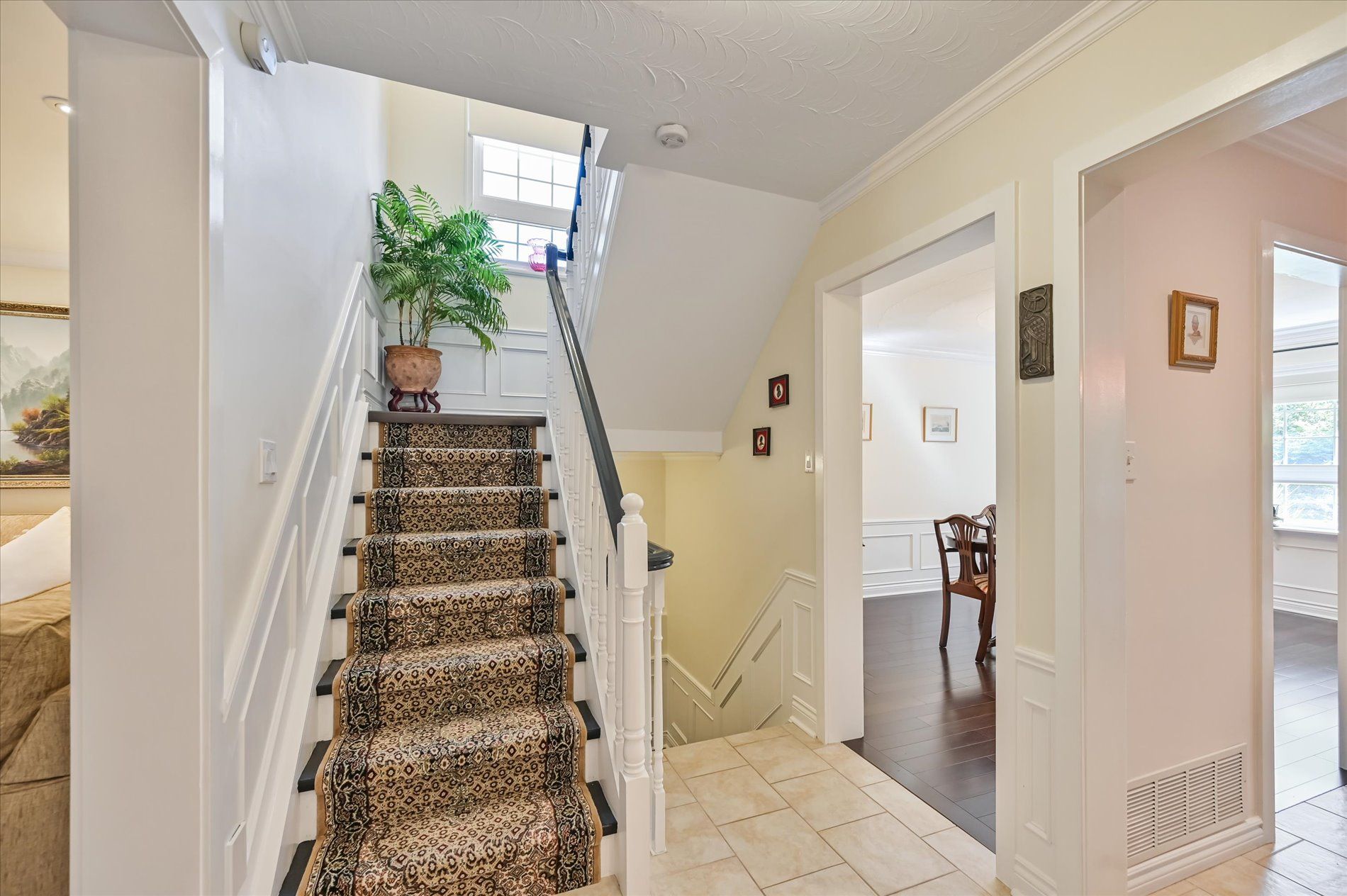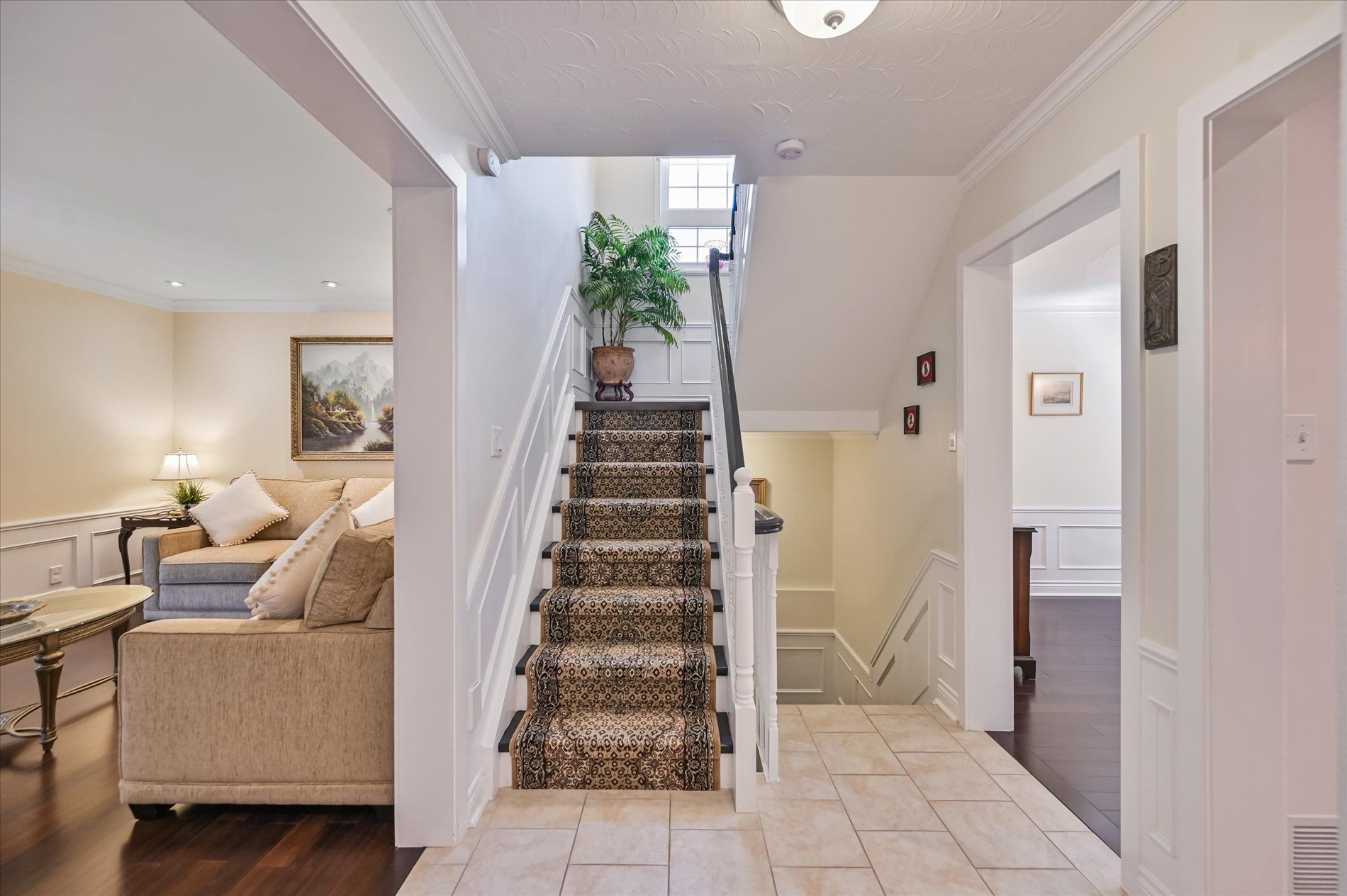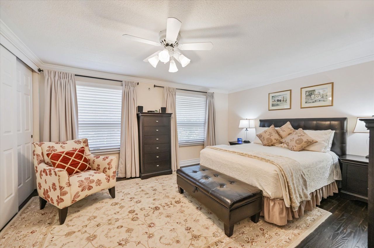 a gas fireplace, 4th bdrm in lower level has 3 piece ensuite & wall closet. This home boasts pot lights, wainscoting,, chair rail, crown mouldings,hardwood floors t/out. W/O from liv.rm to front Veranda and from kitchen to large and private interlocking patio and rear yard Oasis, with perennial gardens. Rear yard is fully fenced and has mature treed surround.Include: fridge, stove, b/in dishwasher, wash/dry, wine cooler "as is", stand up fridge freezer in