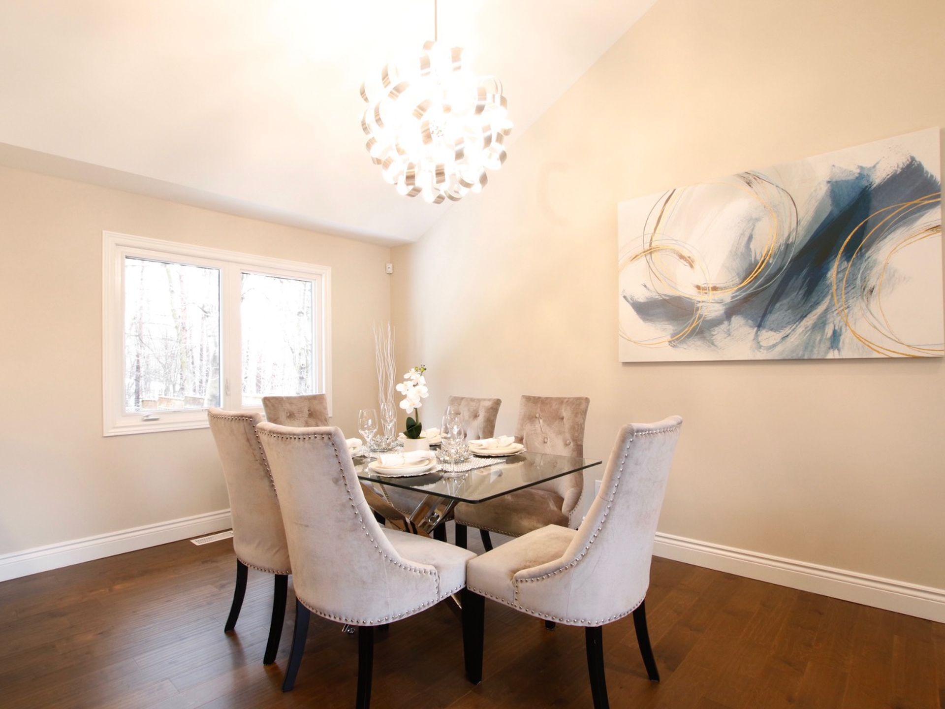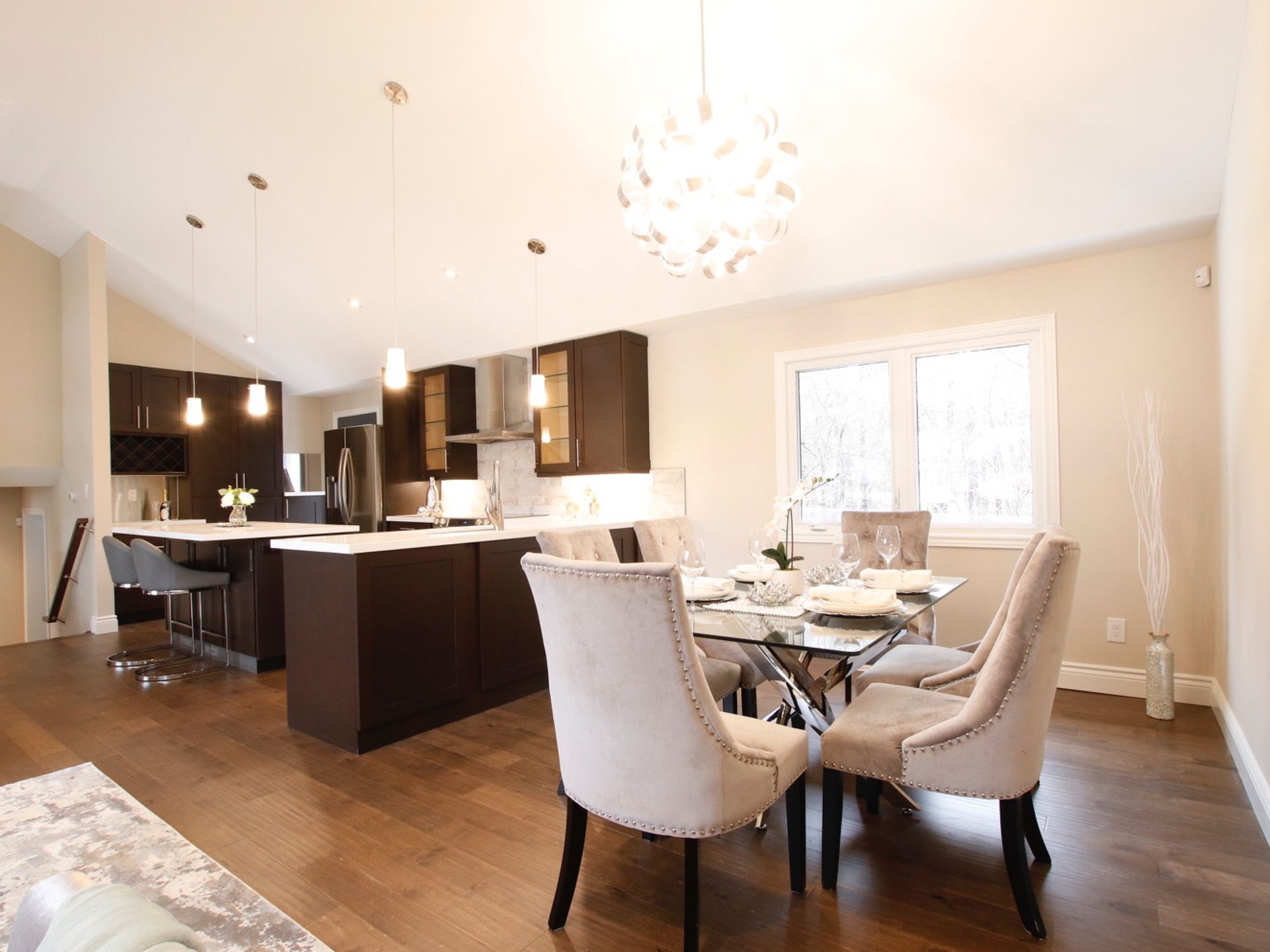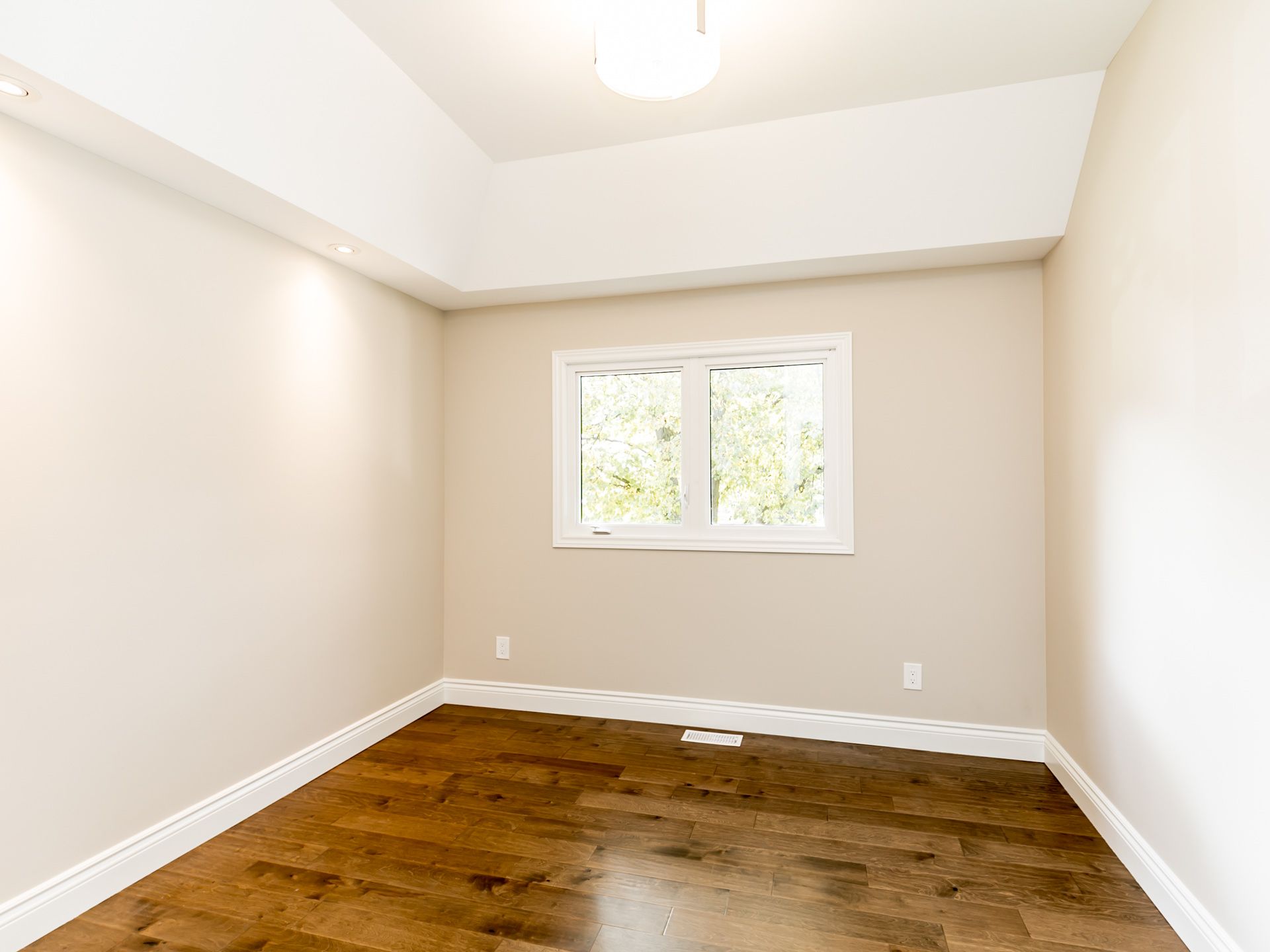 Hardwood Floor Picture Window Cathedral Ceiling