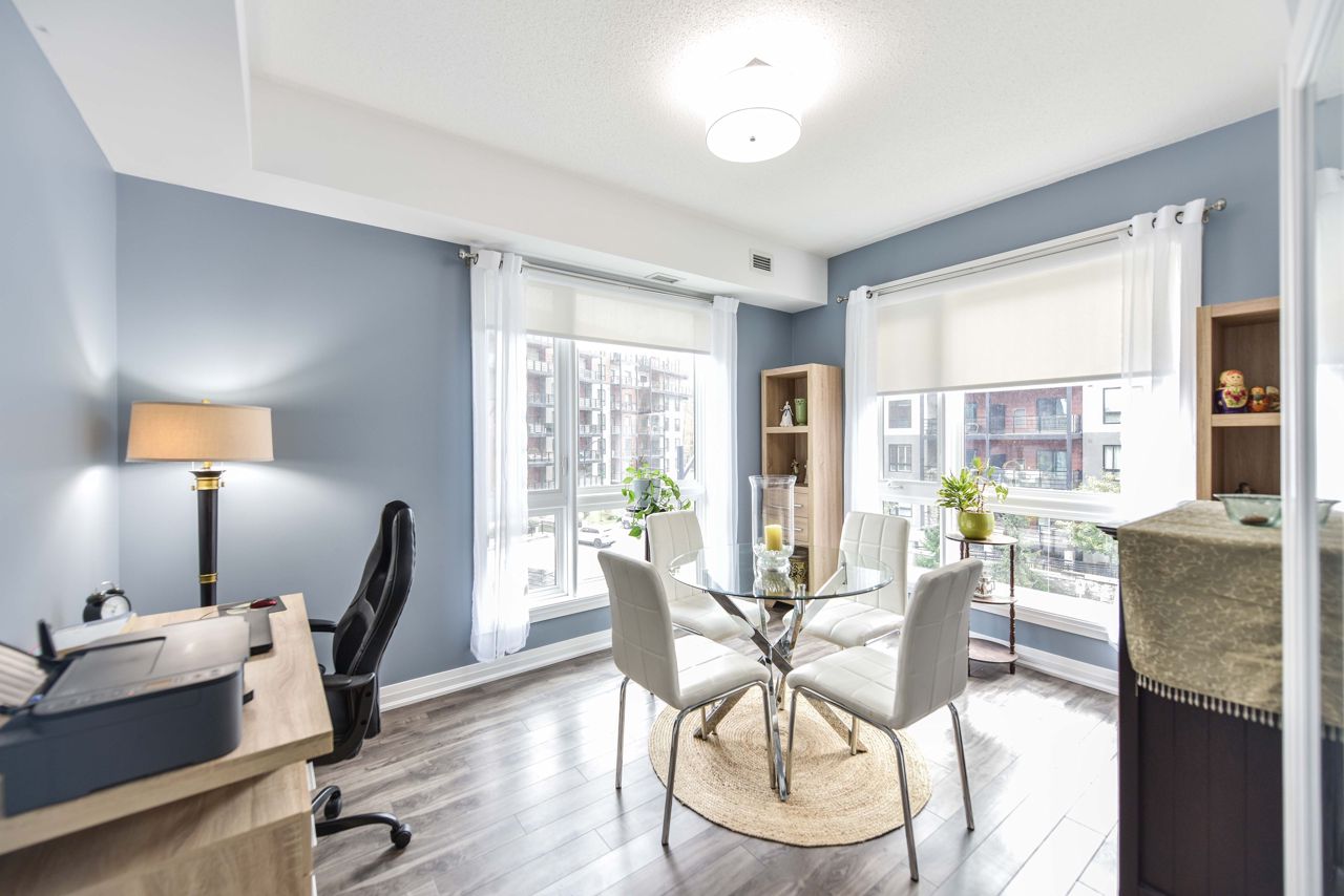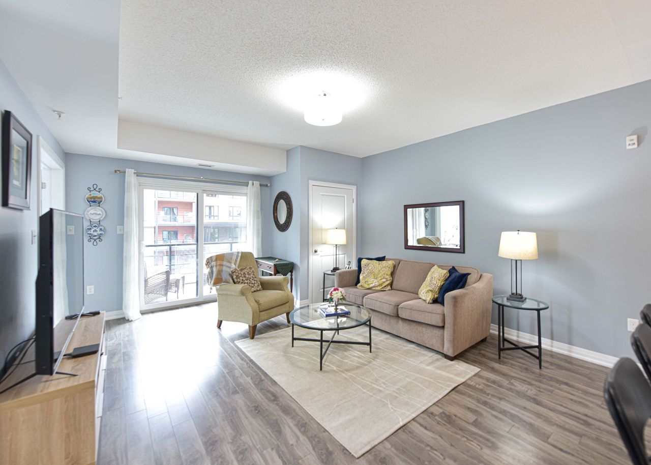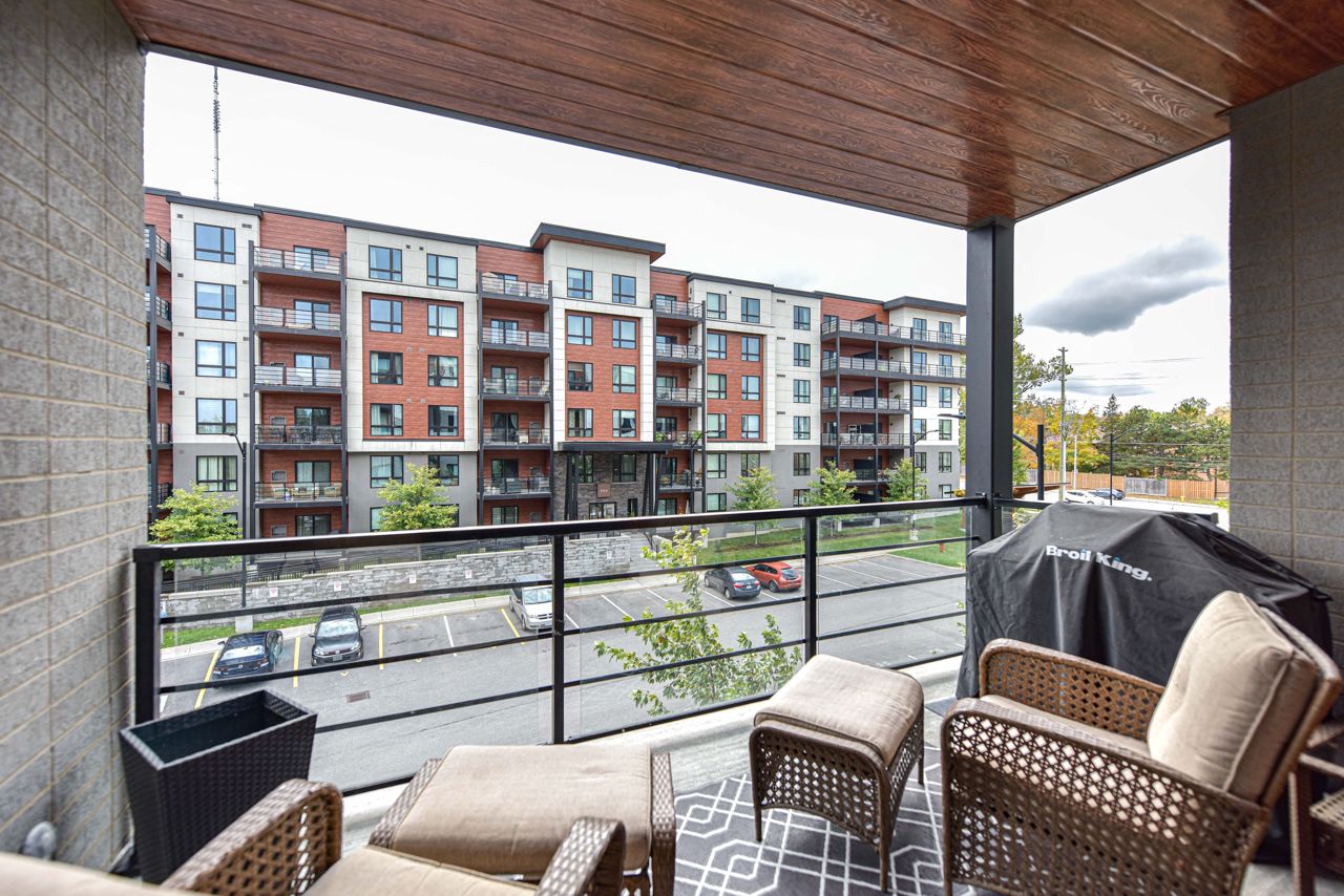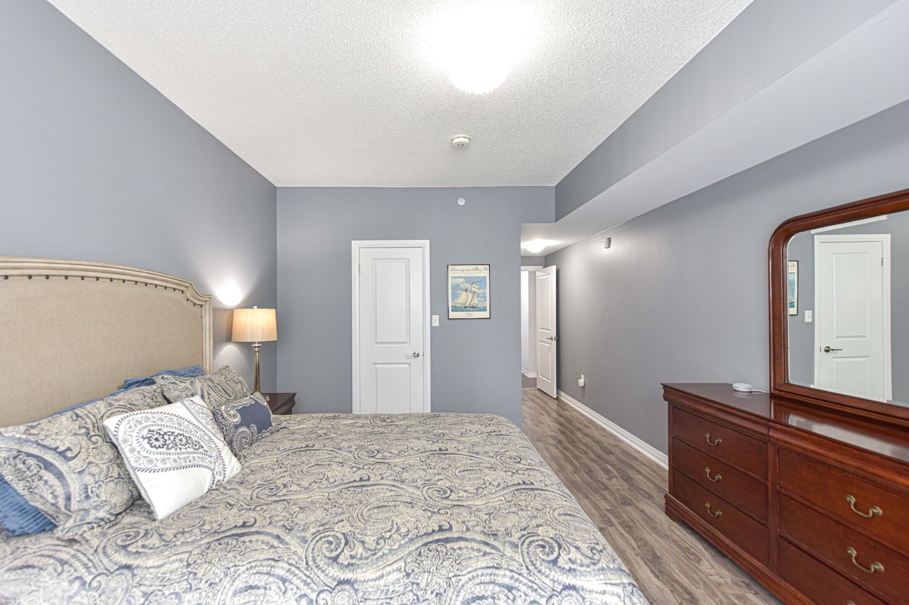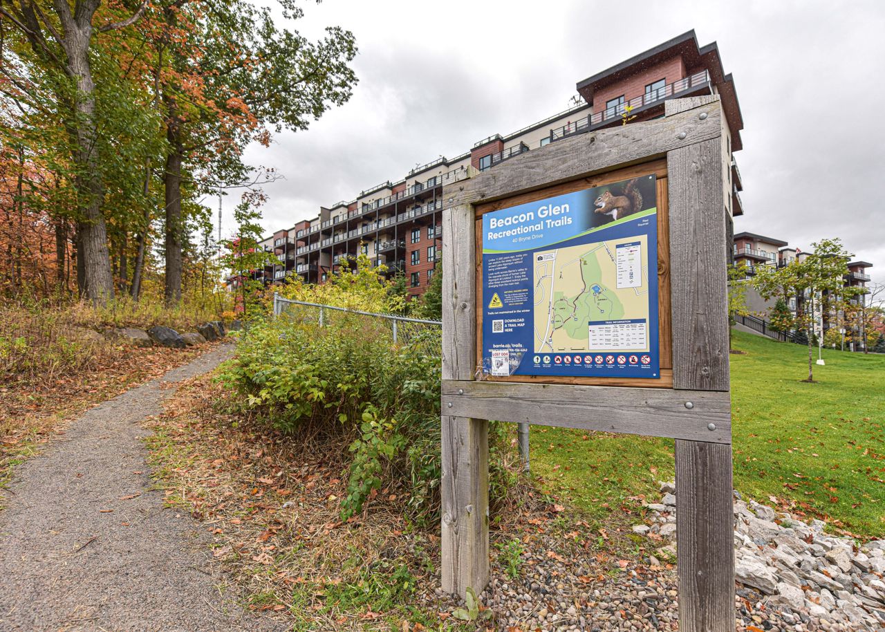 BEAUTIFUL, SPACIOUS & CENTRALLY LOCATED "THE GALLERY CONDOMINIUMS" IS THE RIGHT MOVE. LOCATION: For the commuter, Essa & Hwy 400 -10 minutes to Go Station. NEARBY: Zehrs & Rona within walking distance & minutes drive to major restaurants, coffee shops, downtown & waterfront. FOR THE OUTDOOR ENTHUSIAST: Start or end your day walking through a bonus 14 acres of environmentally protected land & trails adjacent to your home. FLOOR PLAN & FEATURES: Modern & spacious open concept 1244 sq. ft. corner unit is exceptionally bright owing to additional windows. 2 bedrooms + office/tv/dining or bedroom (you choose), 2 full baths (primary with ensuite) & large laundry with ample storage . The chef is always part of the action with an entertaining island, pantry, granite counters & stainless appliances. Carpet free = easy maintenance. Underground parking & storage. Also yours to enjoy is a gorgeous roof-top terrace overlooking the City & water views to read, soak in the sun or simply relax.