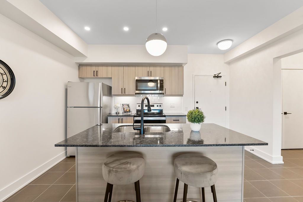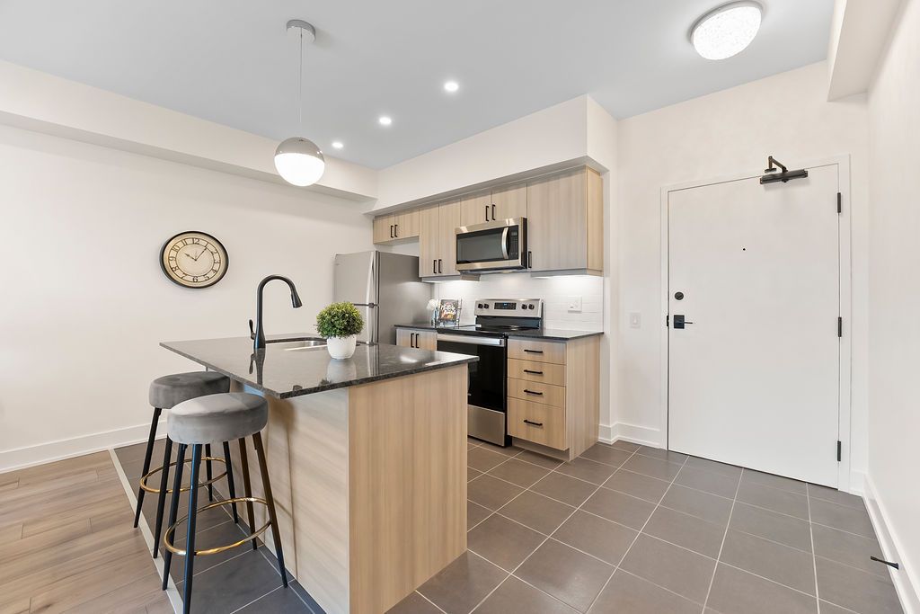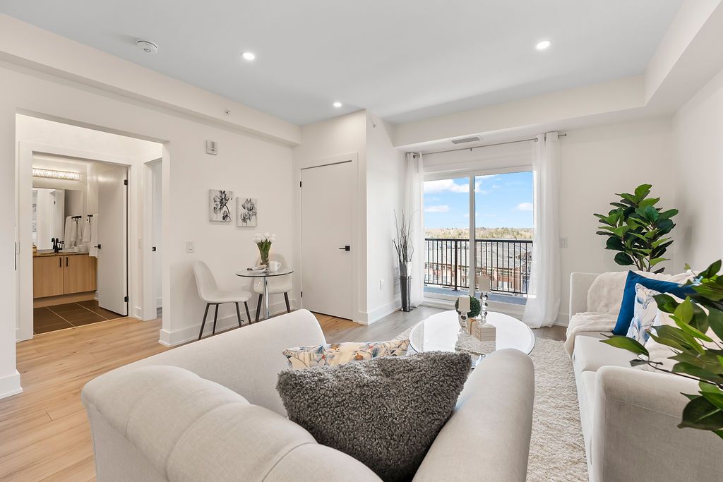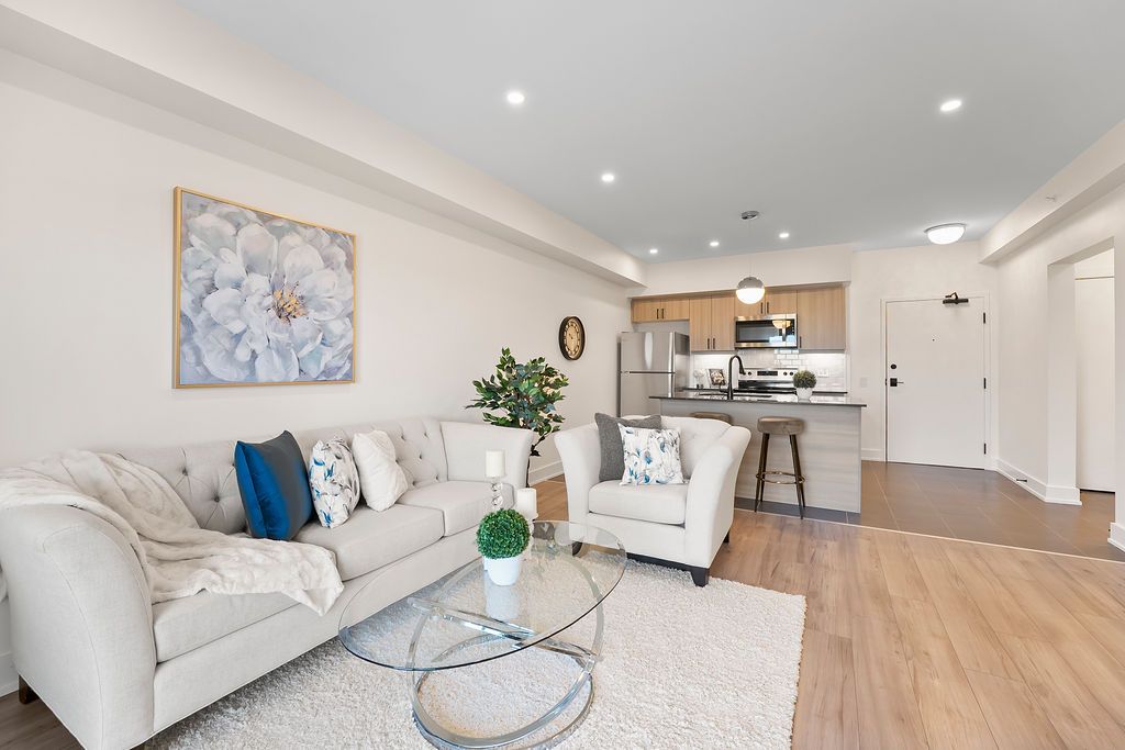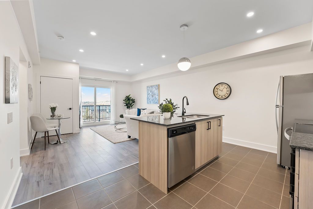 Stunning! This gorgeous condo suite, located in the coveted Bistro 6 community in southeast Barrie, combines the best of luxury and practical living. You'll fall in love with 800 sq. ft. of bright and open living space featuring a den that provides a versatile space a bedroom, an office, storage, or a walk-in closet, perhaps? Thoughtfully and extensively upgraded, this lovely suite boasts 9 smooth ceilings, premium flooring throughout, pot lights in kitchen and living area, sparkling light fixtures, and superior trim and doors. The bright, modern kitchen features an impressive island, backsplash, tri-colour valence lighting and stainless steel appliances including an over-the-range microwave. Indulge in granite countertops, soft-close cabinet hinges, brand new Moen fixtures, and chic finishes within the bathroom and kitchen. With in-suite laundry and a walkout to your private balcony with gas BBQ hook-up, convenience and relaxation await you. Imagine being steps away from exciting amenities such as the communal spice kitchen and BBQ area, fully equipped gym, and basketball court. You'll appreciate the quick walk to the GO Station, and minutes drive to shopping, restaurants and Hwy 400. Look no further to experience condo living at its absolute finest! Schedule a showing today.