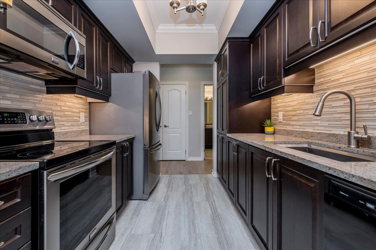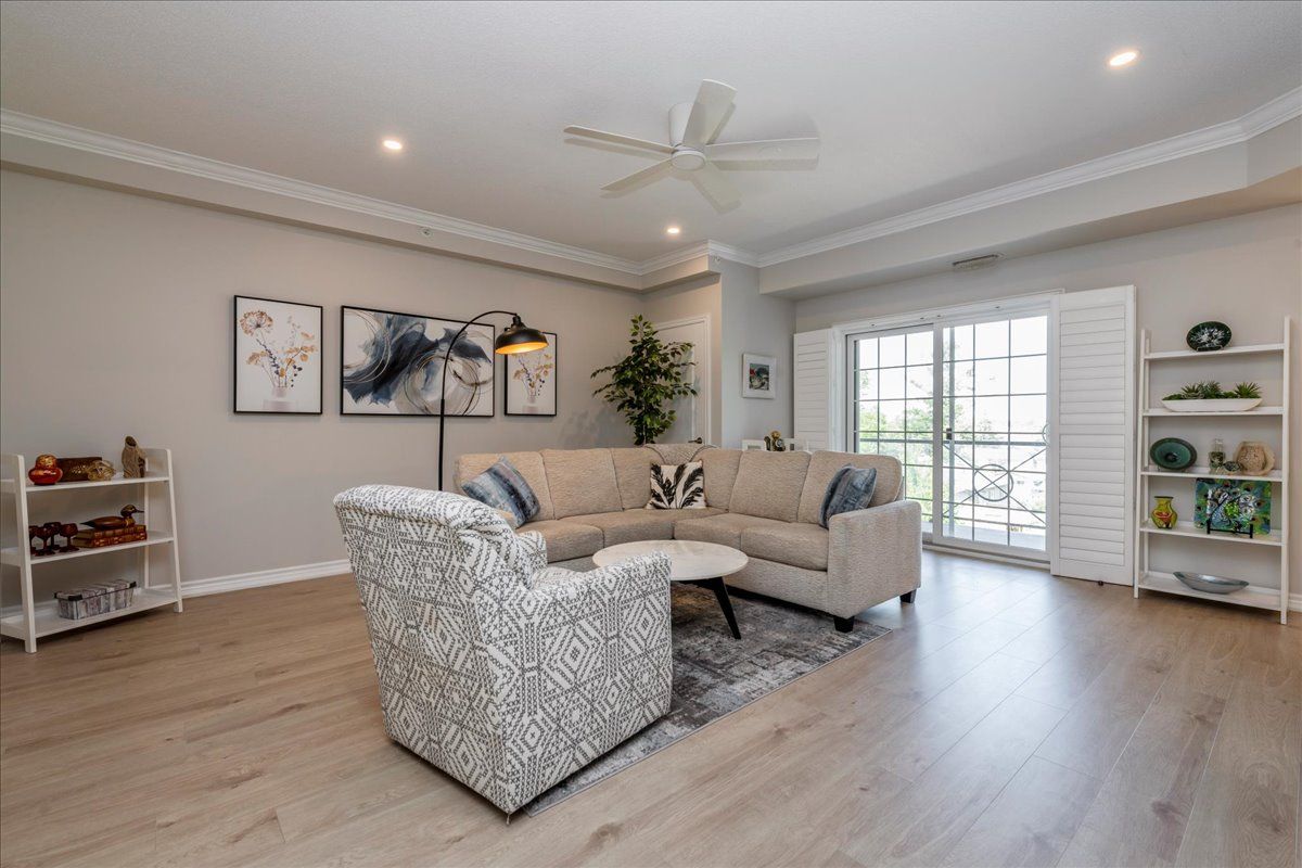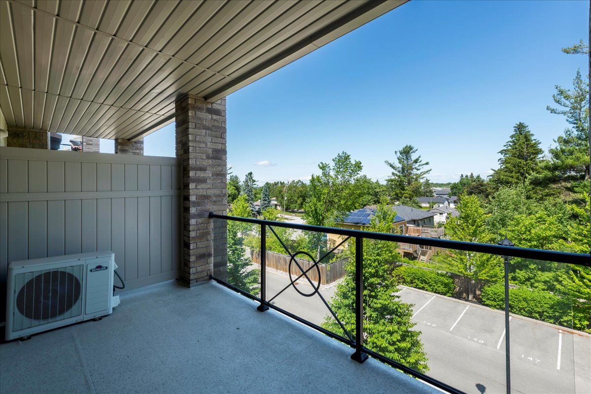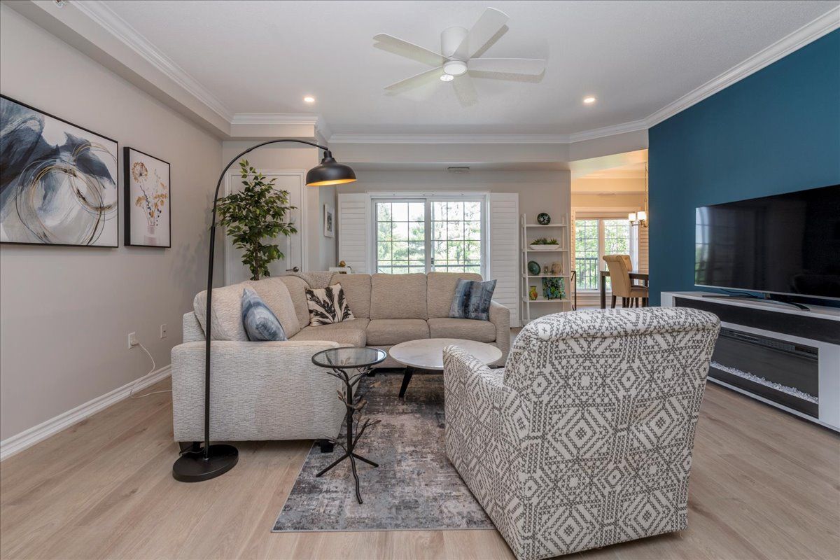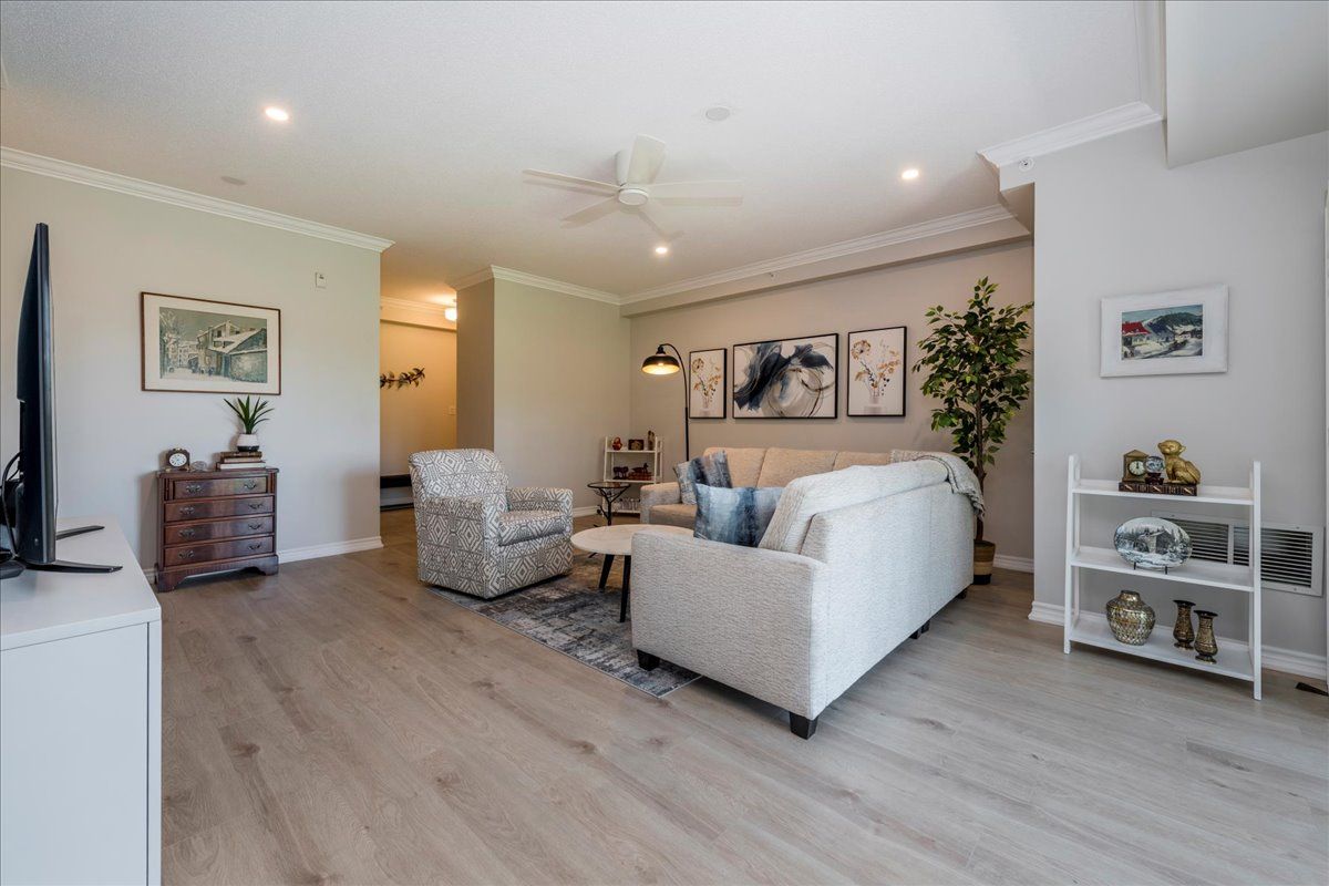 This stylish 3-bedroom, 2-bath corner unit condo is freshly painted throughout, including,Baseboards, ceilings and doors, and features luxury waterproof laminate flooring . Boasting over 1,400 square feet, this bright and spacious end unit allows for abundant natural light and offers added privacy. Modern updates include crown moulding and LED pot lights in the living room and hallway. California shutters and custom blinds adorn every window, adding a touch of elegance and functionality. The upgraded galley-style kitchen is both convenient and modern,featuring LED undermount lighting, large pantry with pullouts, pot drawers, tile backsplash with S/S appliances.Napoleon high efficiency Furnace and water softener. The primary bedrooms offers a generously sized walk-in closet with custom shelving for ample storage. Enjoy the convenience of underground parking and a large storage locker, along with proximity to schools,shops, parks, and restaurants. Step out onto the large balcony perfect for BBQs or quiet mornings with your coffee. Adjacent to Bear Creek Eco Park with ponds and multiple walking trails. Don't miss out on this must see family home.