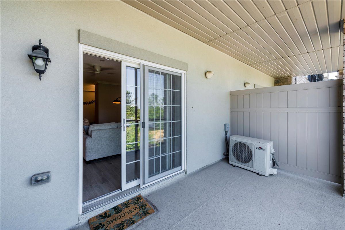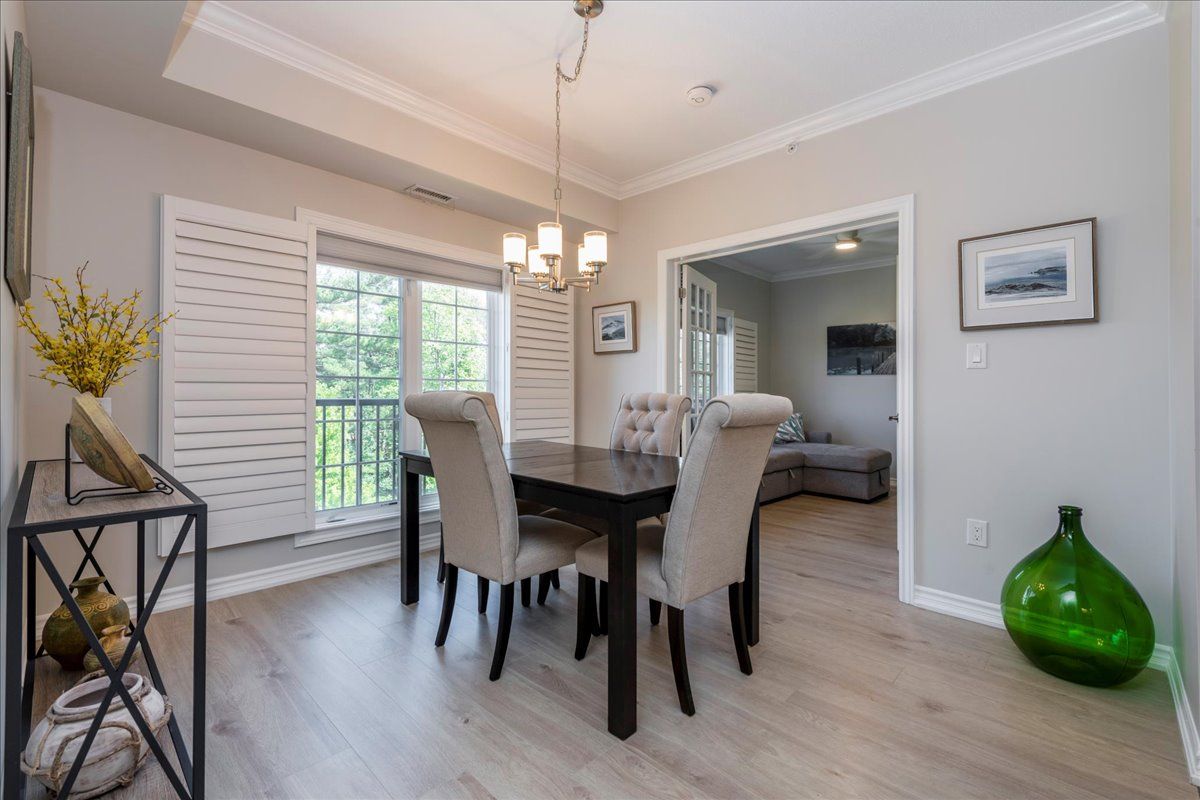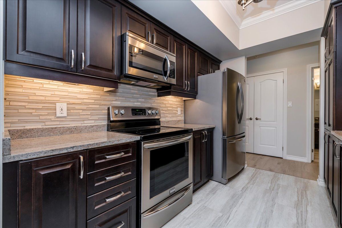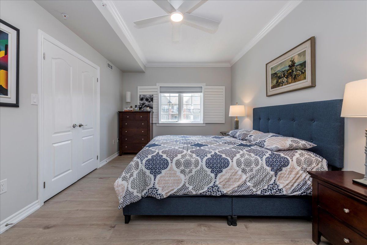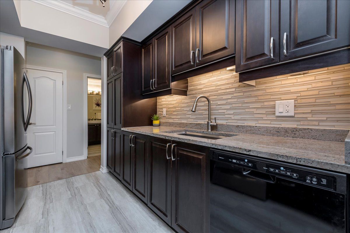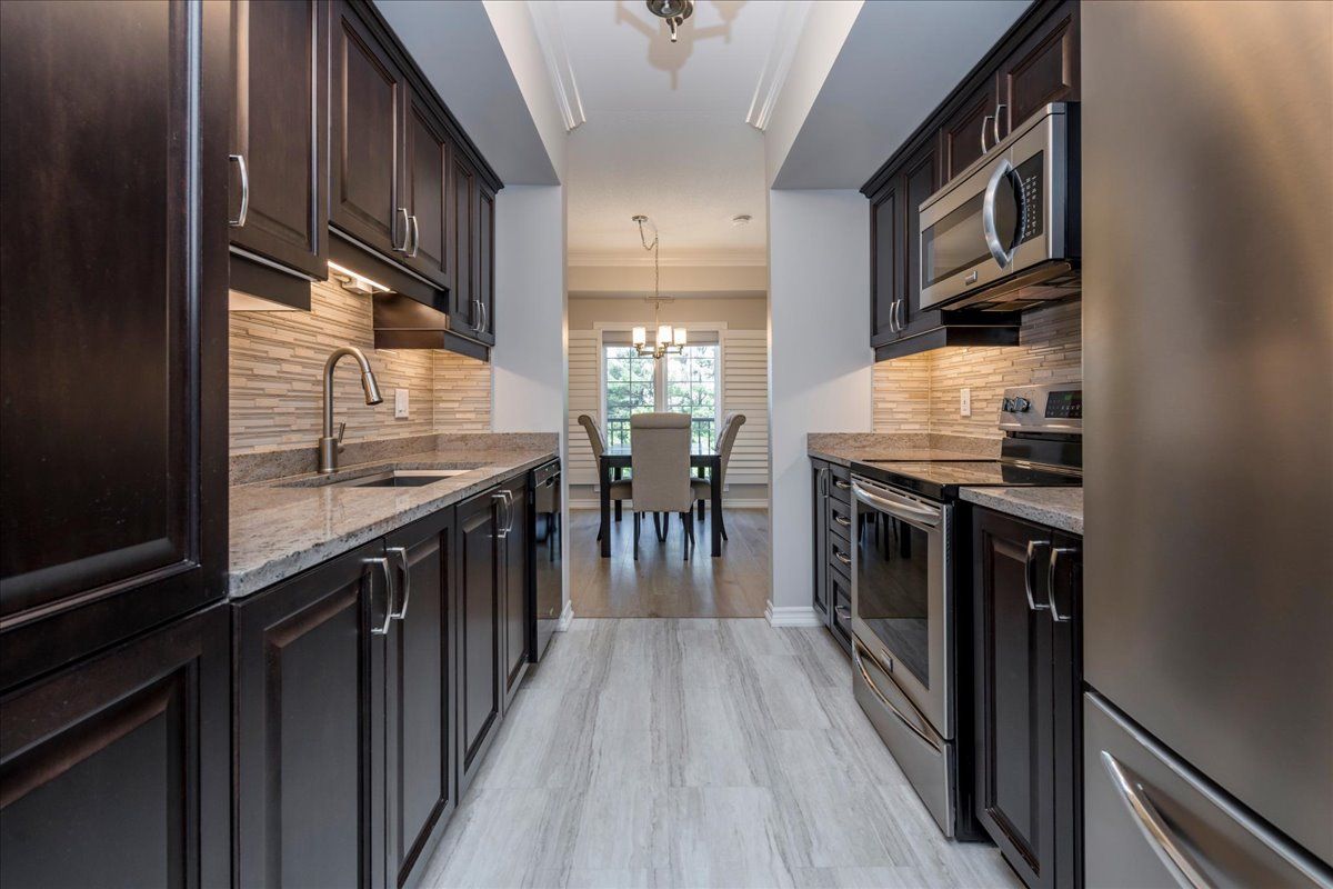 This stylish 3-bedroom, 2-bath corner unit condo is freshly painted throughout, including,Baseboards, ceilings and doors, and features luxury waterproof laminate flooring . Boasting over 1,400 square feet, this bright and spacious end unit allows for abundant natural light and offers added privacy. Modern updates include crown moulding and LED pot lights in the living room and hallway. California shutters and custom blinds adorn every window, adding a touch of elegance and functionality. The upgraded galley-style kitchen is both convenient and modern,featuring LED undermount lighting, large pantry with pullouts, pot drawers, tile backsplash with S/S appliances.Napoleon high efficiency Furnace and water softener. The primary bedrooms offers a generously sized walk-in closet with custom shelving for ample storage. Enjoy the convenience of underground parking and a large storage locker, along with proximity to schools,shops, parks, and restaurants. Step out onto the large balcony perfect for BBQs or quiet mornings with your coffee. Adjacent to Bear Creek Eco Park with ponds and multiple walking trails. Don't miss out on this must see family home.