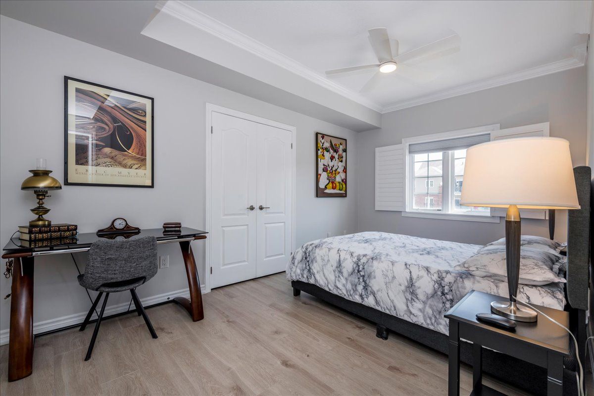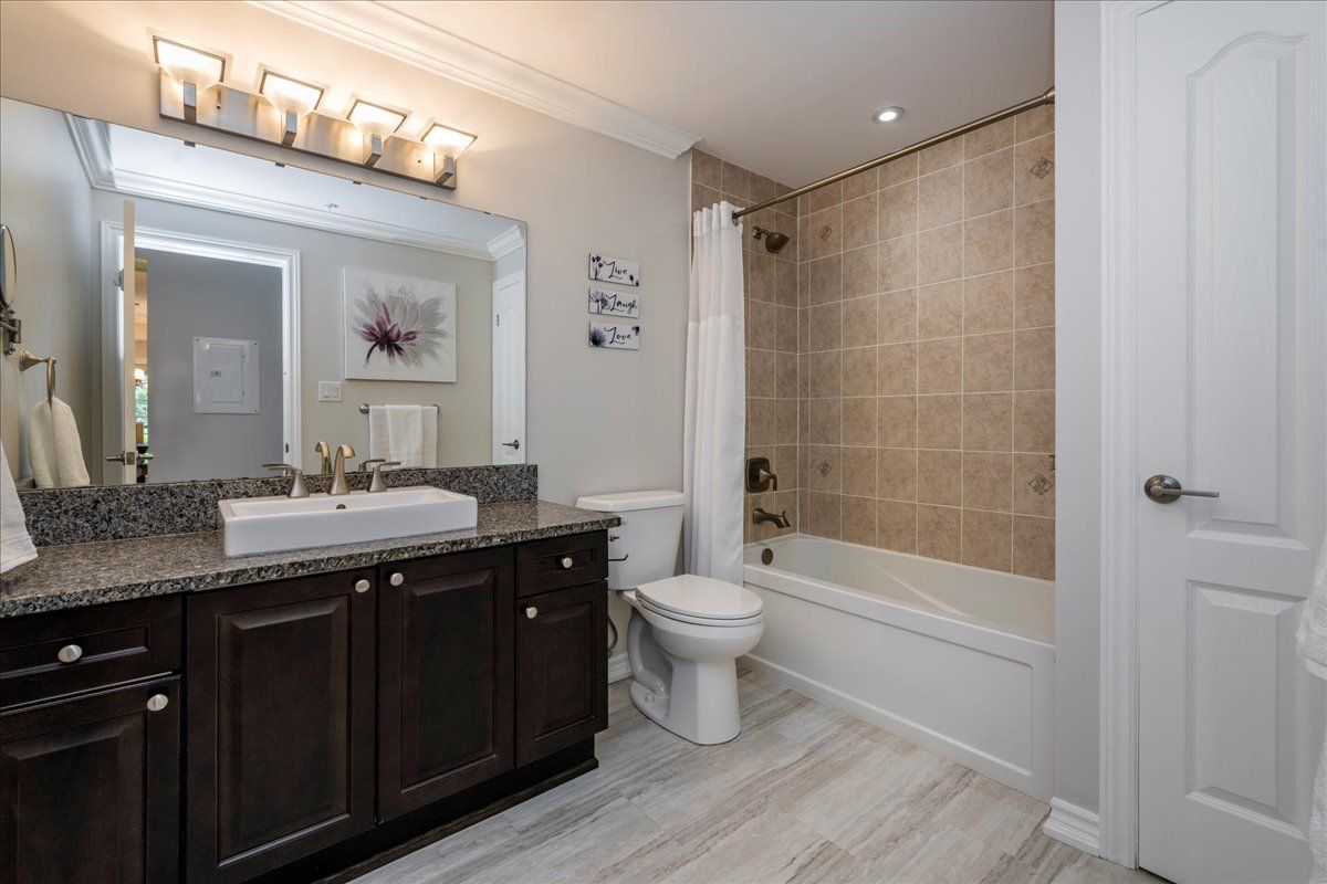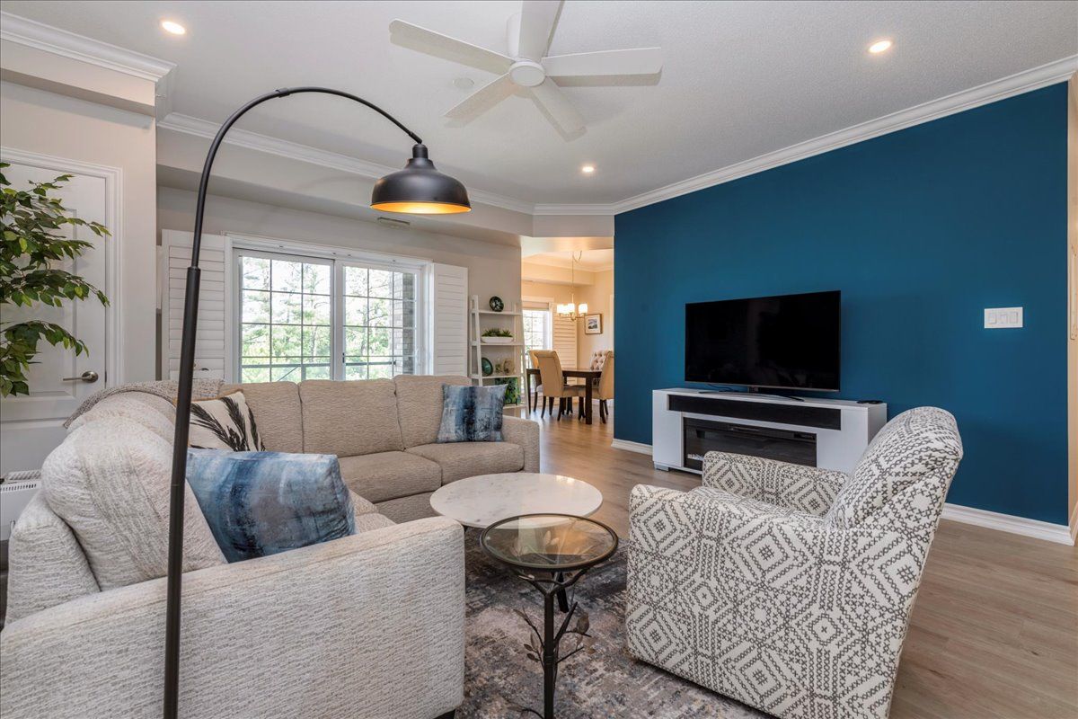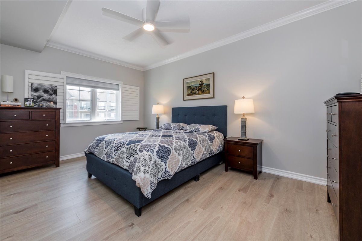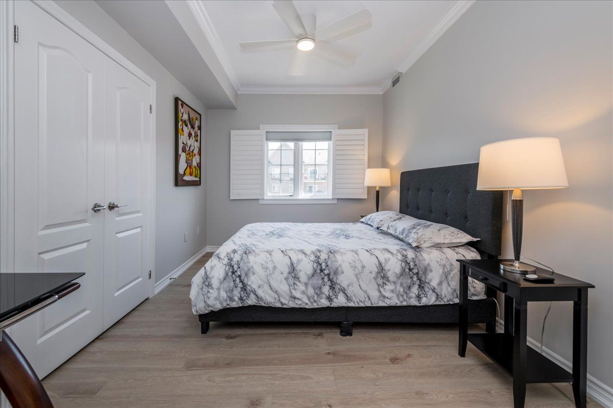 This stylish 3-bedroom, 2-bath corner unit condo is freshly painted throughout, including,Baseboards, ceilings and doors, and features luxury waterproof laminate flooring . Boasting over 1,400 square feet, this bright and spacious end unit allows for abundant natural light and offers added privacy. Modern updates include crown moulding and LED pot lights in the living room and hallway. California shutters and custom blinds adorn every window, adding a touch of elegance and functionality. The upgraded galley-style kitchen is both convenient and modern,featuring LED undermount lighting, large pantry with pullouts, pot drawers, tile backsplash with S/S appliances.Napoleon high efficiency Furnace and water softener. The primary bedrooms offers a generously sized walk-in closet with custom shelving for ample storage. Enjoy the convenience of underground parking and a large storage locker, along with proximity to schools,shops, parks, and restaurants. Step out onto the large balcony perfect for BBQs or quiet mornings with your coffee. Adjacent to Bear Creek Eco Park with ponds and multiple walking trails. Don't miss out on this must see family home.