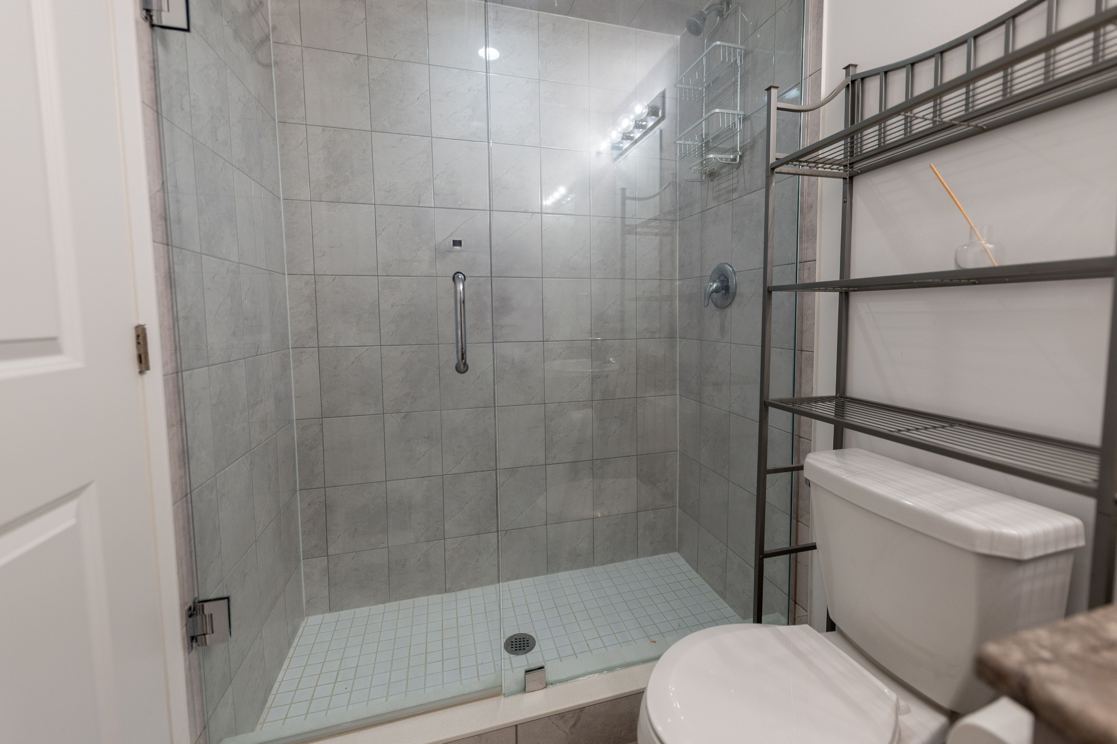 * 带玻璃步入式淋浴间的私人 3 件套浴室。