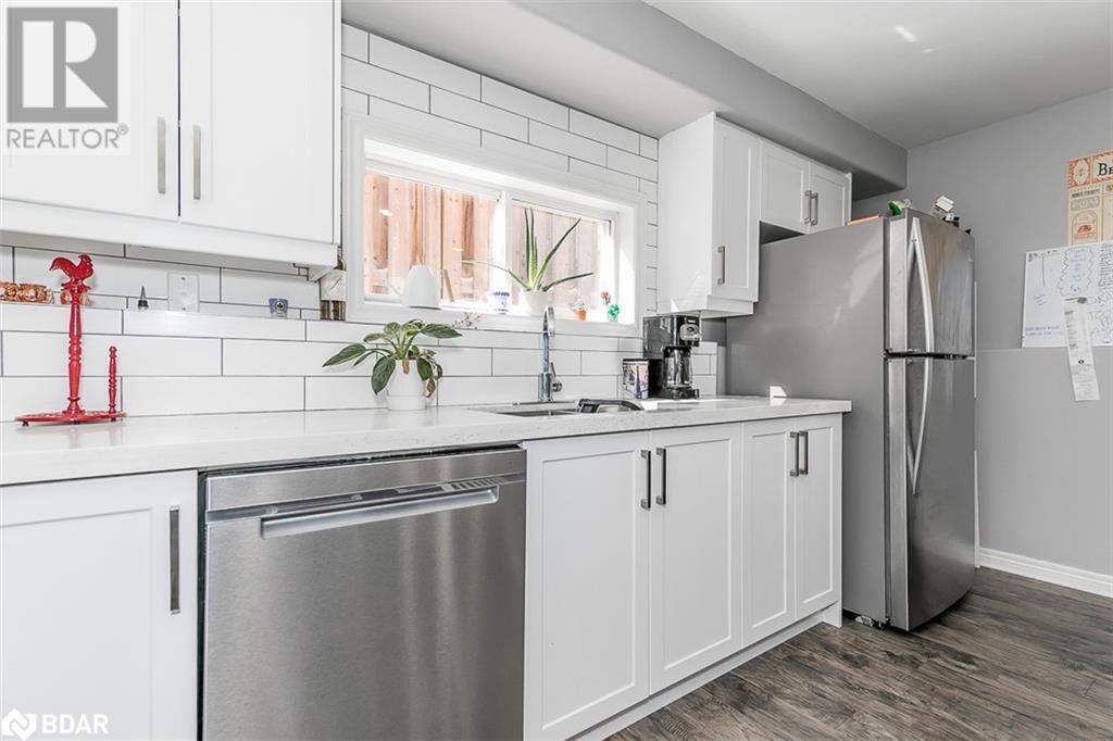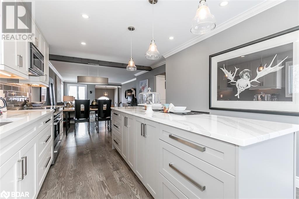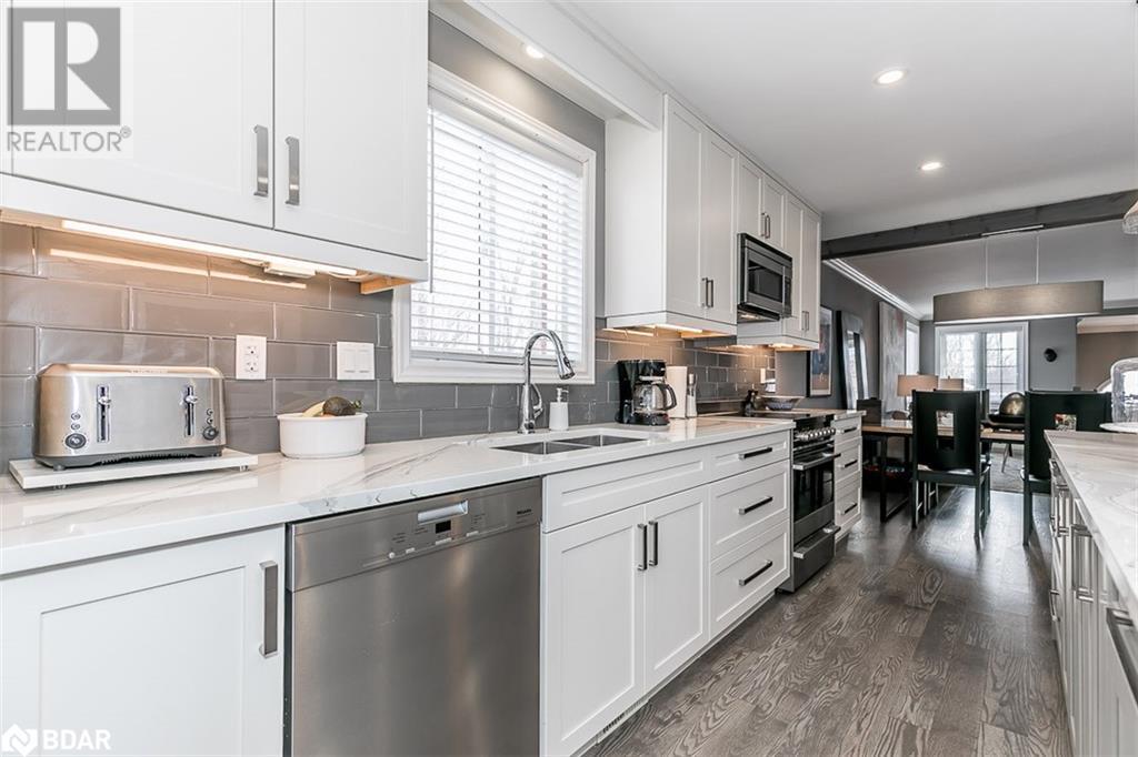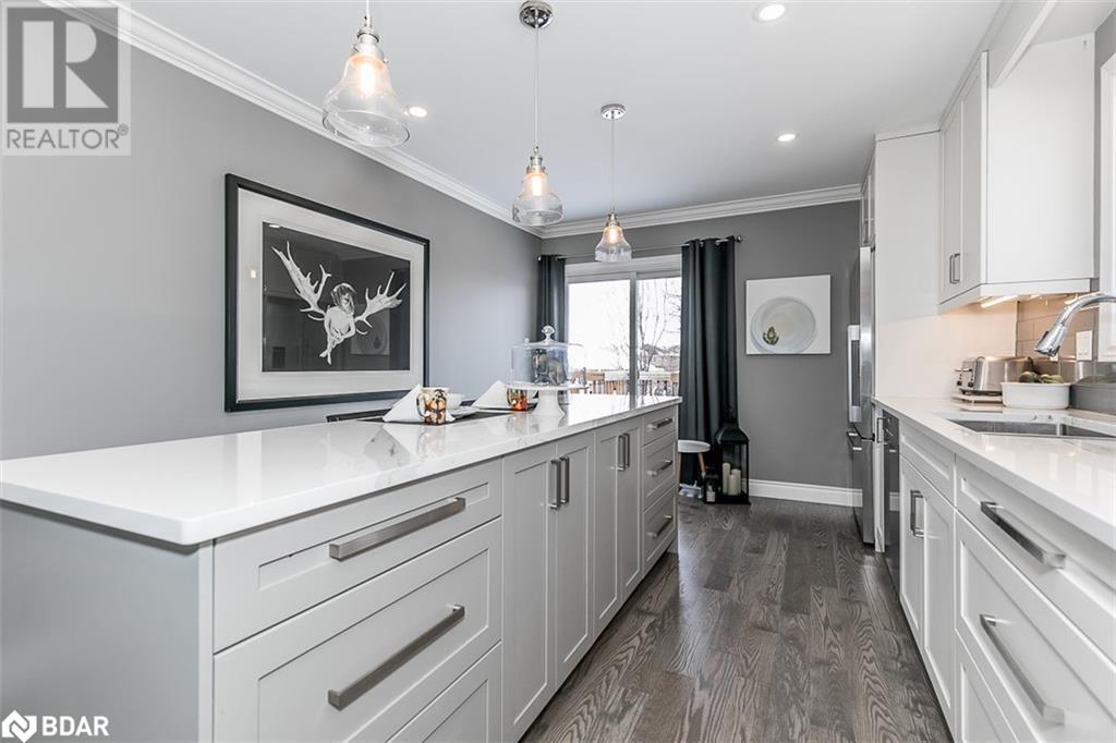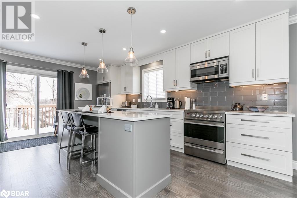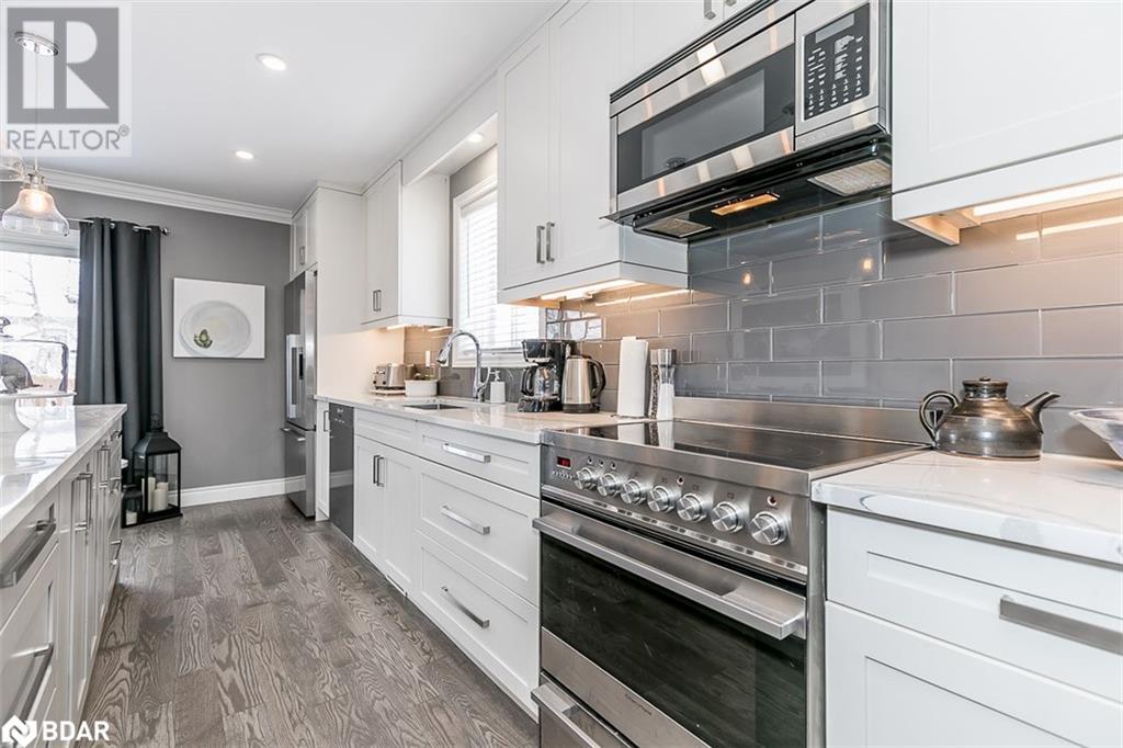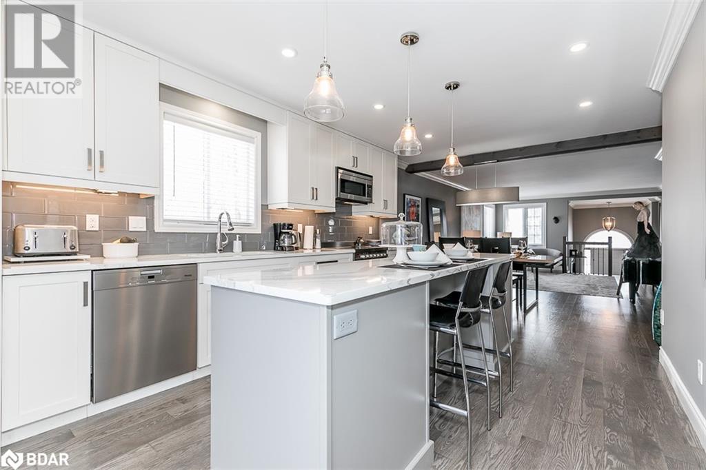 Stunning and updated 2274 sqft home with inlaw suite and separate entrance. Custom kitchen with quartz countertops, high end stainless steel appliances, and large island with bar stools. Open concept living and dining area create a bright and inviting entertainment space. Exquisite finishings include over-sized baseboards, engineered hardwood flooring, pot lights, and exposed beam. 2 bedrooms including a large primary suite with updated ensuite. Renovated basement is ideal for in-laws with separate kitchen, bathroom, bedroom, and laundry. Large deck off kitchen o/looking fully fenced yard with newer landscaping. A Private Oasis in the City. Shingles (2018) with 50 year warranty. Sought after location close to schools, Barrie Country Club, Sports Dome, Community Centre, Georgian Mall, Georgian College, RVH, and quick access to highway 400. (id:22211)