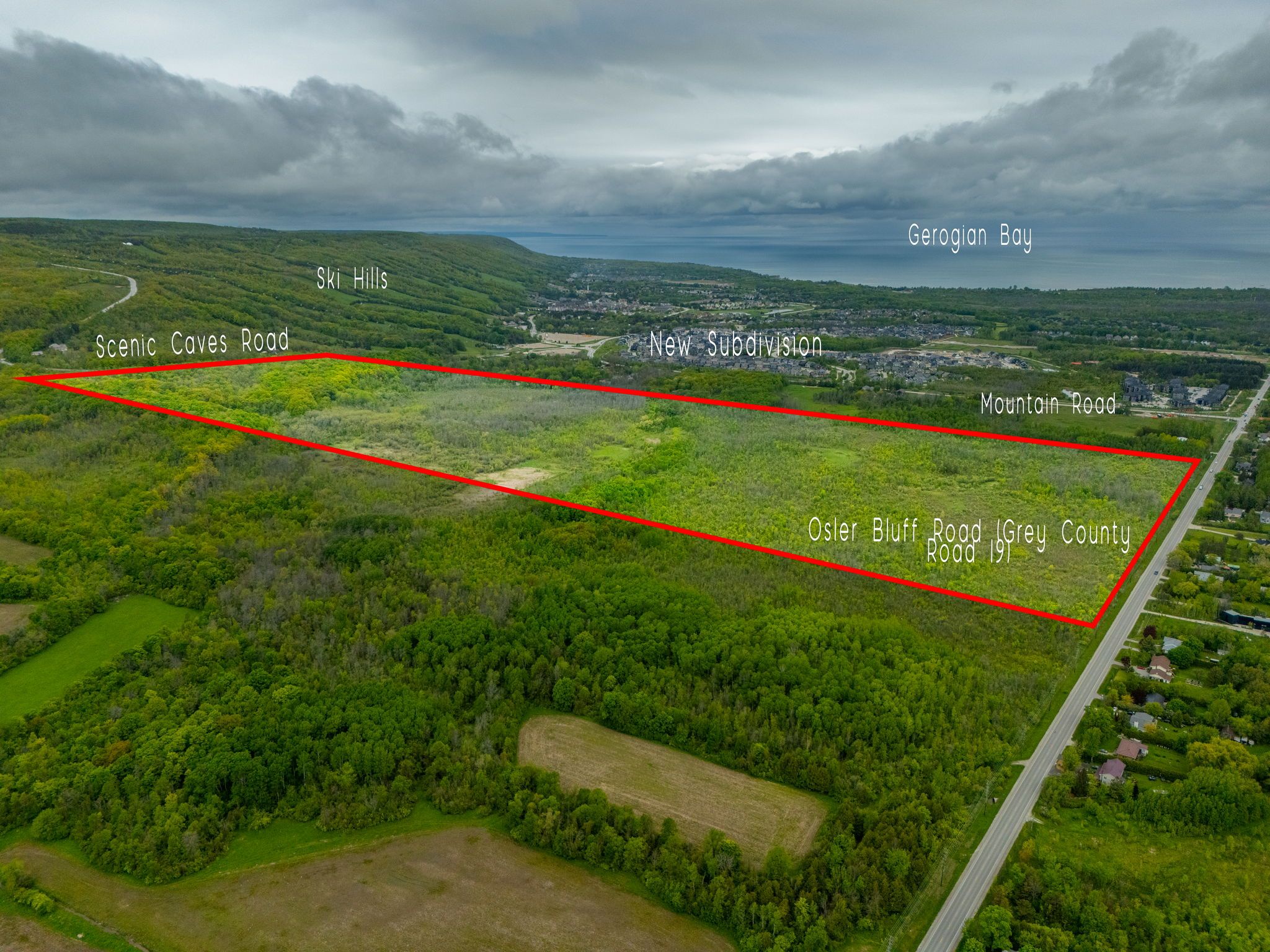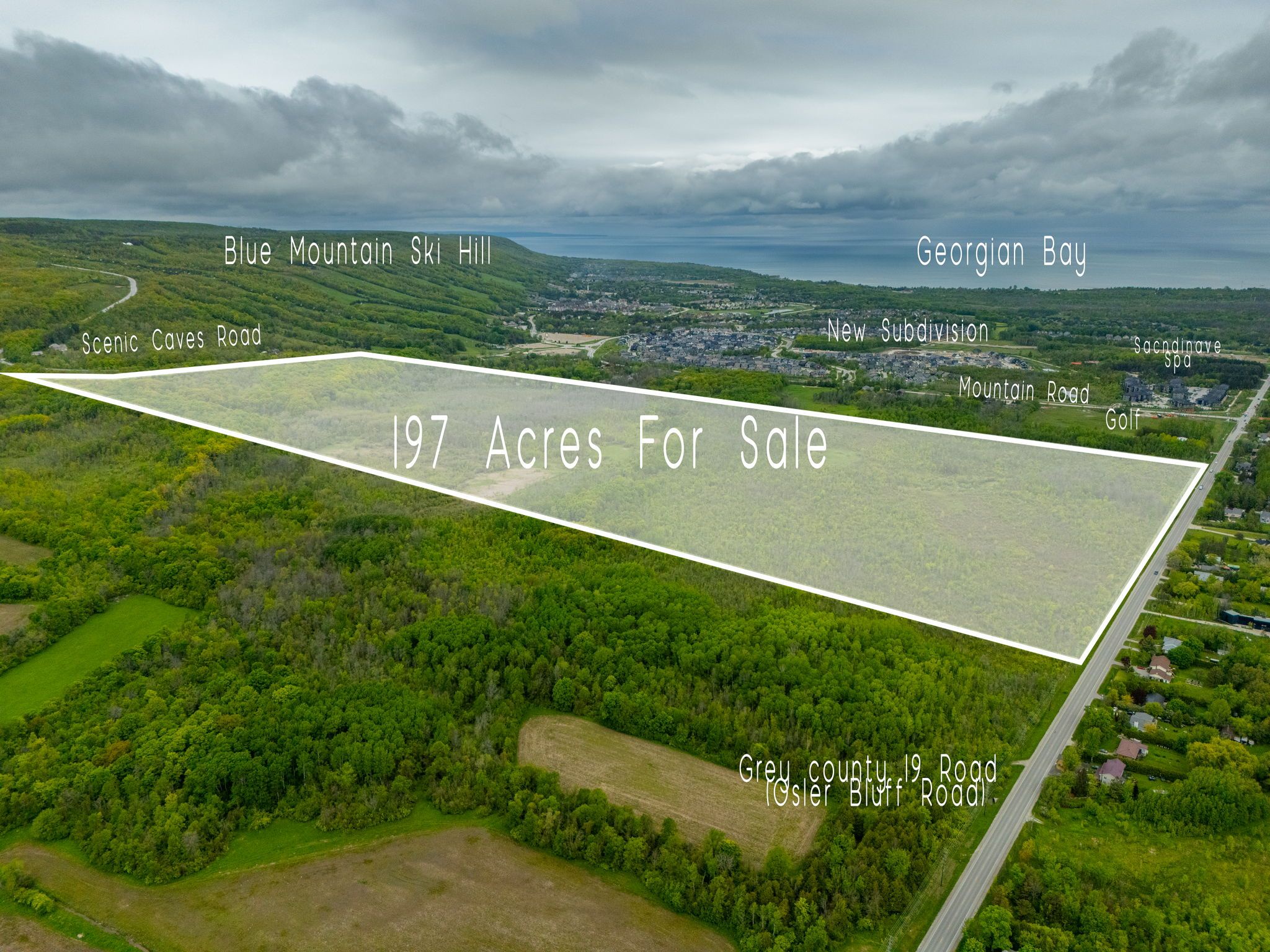 Rare opportunity for investors & developers alike! 197 Acres +/- of four seasons adventures at the base of blue mountain, AAA+ Location! This expansive parcel of land is situated within the towns Future Secondary Plan (FSA). Fronting on both Scenic caves road, and Grey county 19 road (Osler Bluff). This parcel of land has the Potential to develop into a subdivision once the town infrastructure permits, or a great land-bank opportunity for the future. Currently it is permitted to: build a single detached luxurious dwelling or hobby farm. With breath-taking views of Blue Mountain and a rich history as a apple orchard, this property is sure to be a valuable asset for anyone looking to invest in this rapidly developing area. Perfectly situated on the other side of the street from Blue Mountain Ski Resort. Official Plan: "Future Secondary Plan Areas" (Fsa); Town Zoning : "Deferred Development" MPAC :"Residential Development Land" Both the Buyer And Buyers Agent are To Perform their Own Due Diligence To Satisfy Themselves With The Current Use, and Future Potential Of This Property. Here is your opportunity, Discover the great Canadian Outdoors and get ready for your chance, to be a part of Blue Mountain's future.