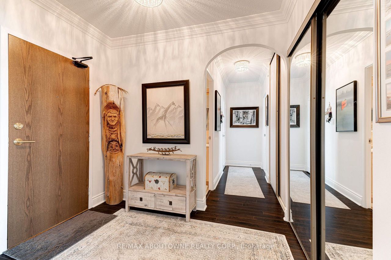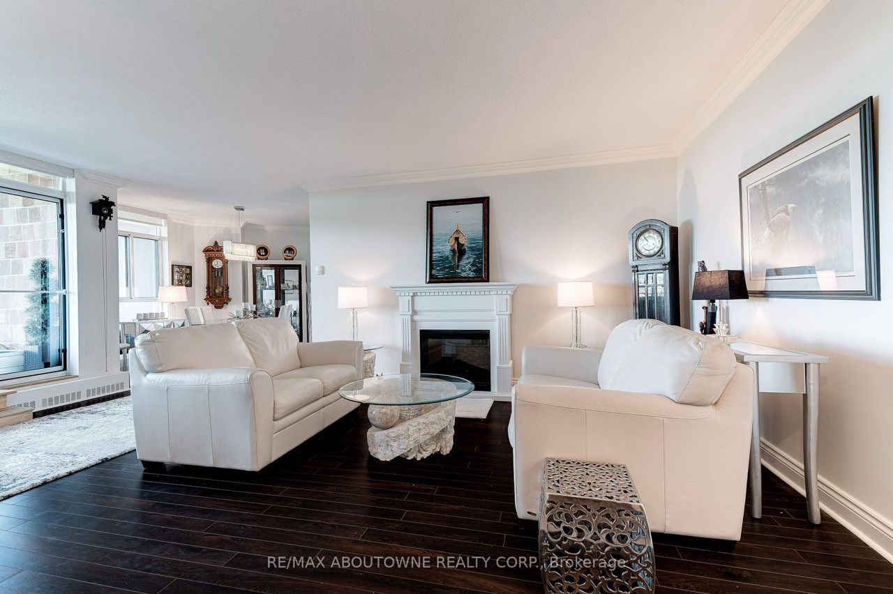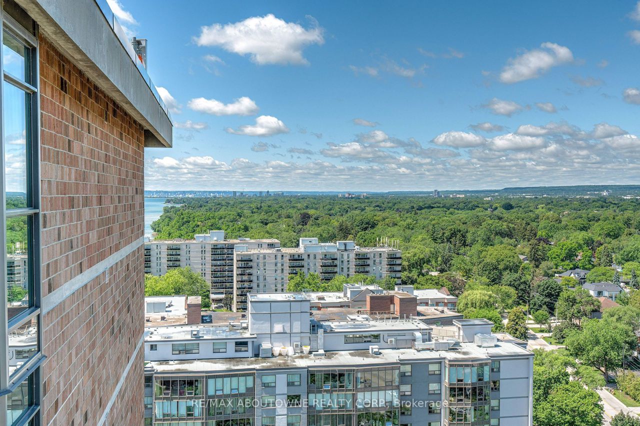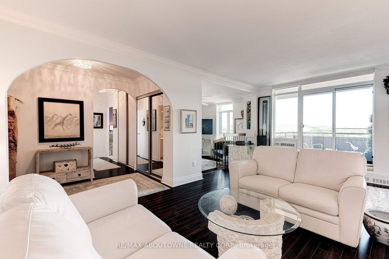 Beautifully upgraded penthouse with panoramic unobstructed view! Approx. 1185 sq ft. DEN FITS LARGE SOFA BED OR COULD BE CONVERTED TO 2ND BEDROOM. Enjoy the view of the mesmerizing sunsets that descend over the picturesque escarpment. Nestled on the shores of Lake Ontario, you can relax by the outdoor pool taking in the lake views. Fabulous new renovations are in progress at Admirals Walk! Elegant new hallways and decor, & the lobby will also soon be refreshed. This fabulous condo has quality upgrades including upgraded white kitchen, hardwood floors, ensuite laundry, and more. Custom built-ins and closet organizers are strategically incorporated throughout the unit, ensuring that every inch of space is optimized to its fullest potential. Plenty of amenities to utilize. Fabulous location with easy access to highways, shopping and Bronte Harbour to the east and downtown Burlington to the west. Move in ready!