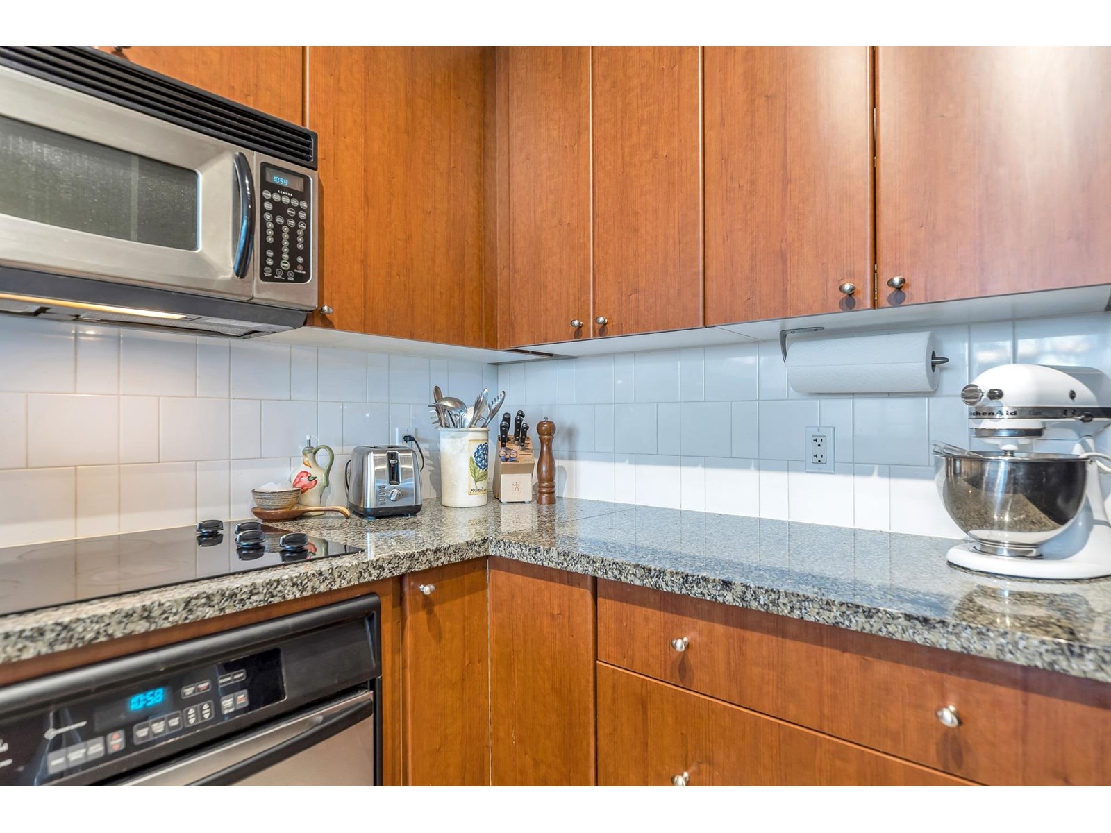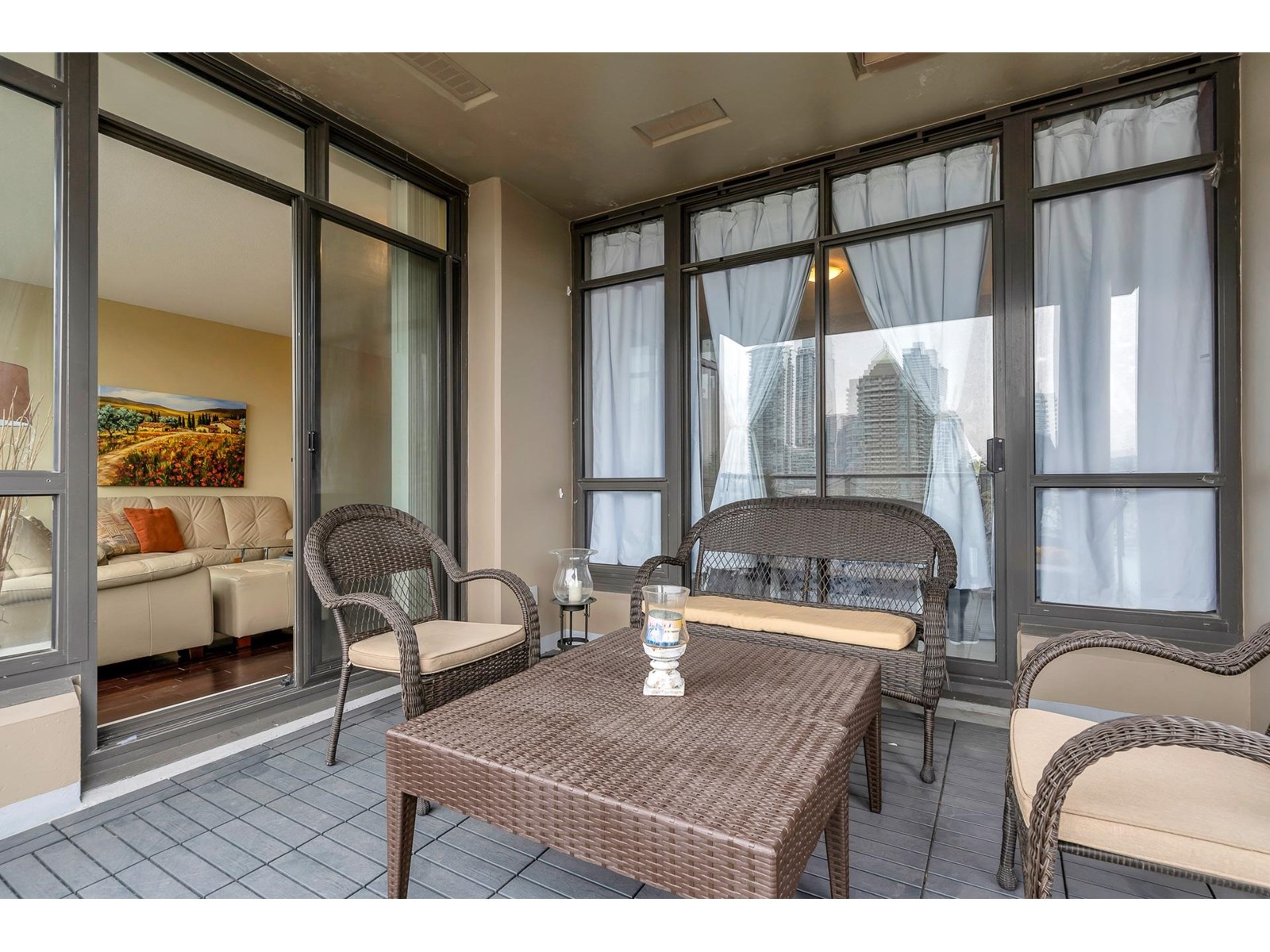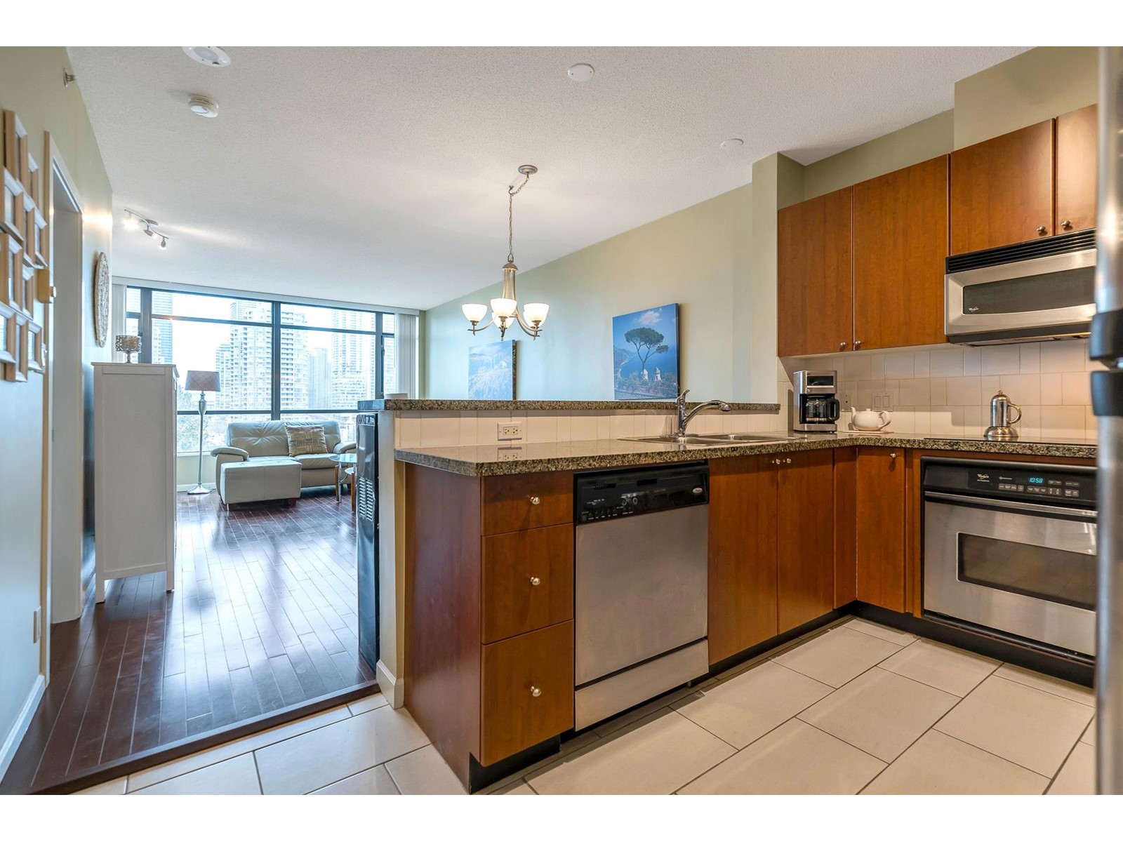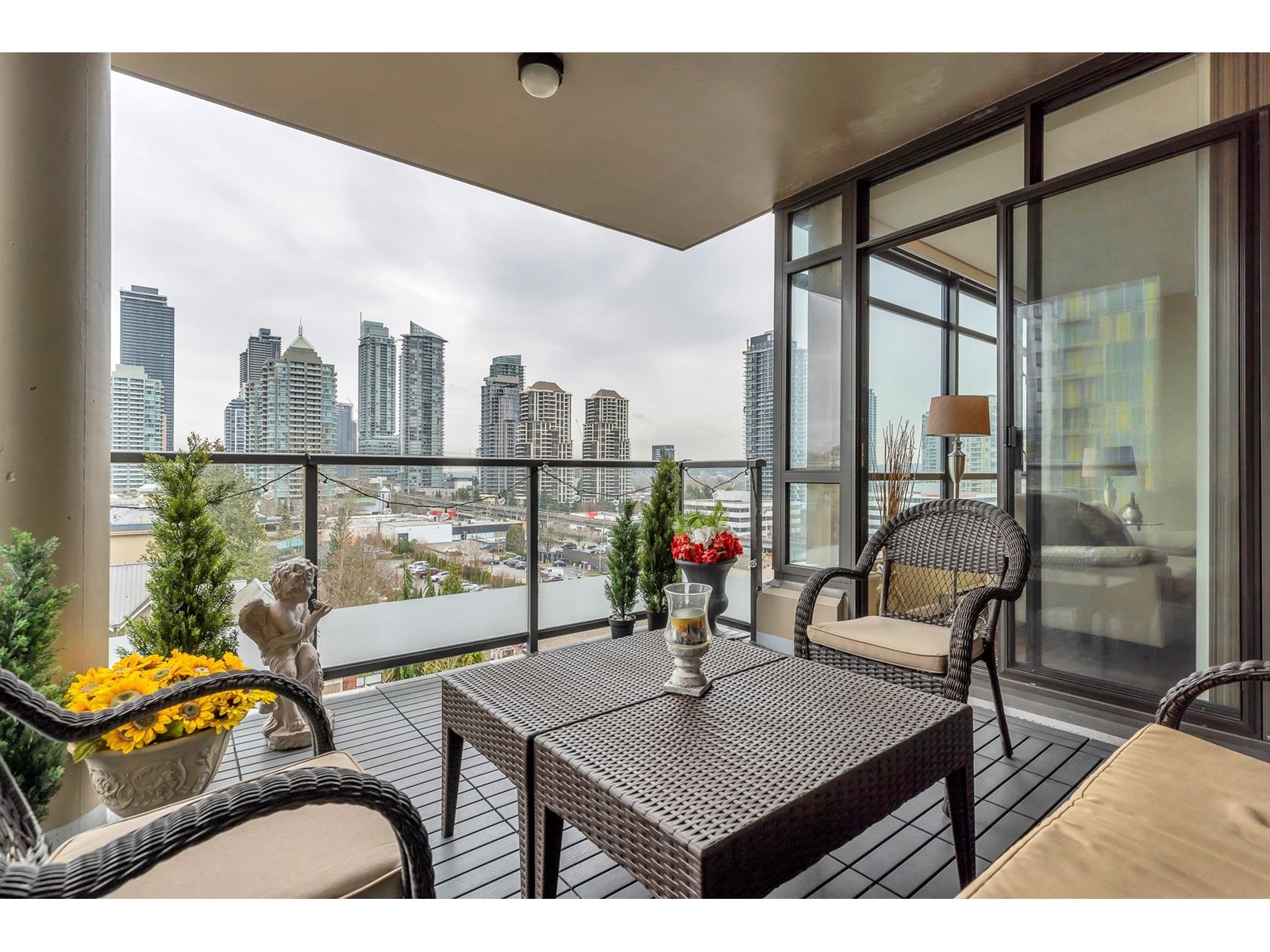 Come home to this STUNNING 1 Bdrm suite at the Marquis Grande.Enjoy the FABULOUS VIEWS from this functional floorplan one of the best layouts in all of Brentwood. Fantastic interior finishings: 9ft ceilings; imported granite counters, stainless steel appliances, new blinds ,newer washer and dryer, and a large island bar. The spacious bedroom features a walk-in closet and extra built in storage; in-suite laundry and locker storage; entertainer's dream 128 sqft large balcony with new deck flooring. Great facilities include:outdoor pool,sauna, gym; media, party & meeting rooms; resident caretaker, 2 guest suites. Convenient location, steps away from Brentwood,Save-on-Foods, Gilmore Skytrain station, wonderful restaurants and cafes.1 parking and storage locker. (id:22211)