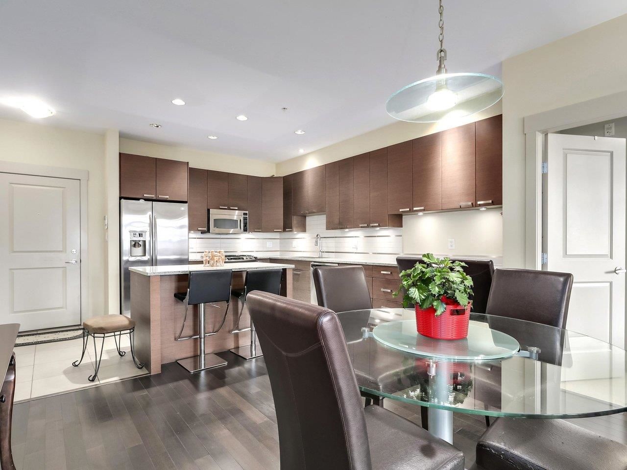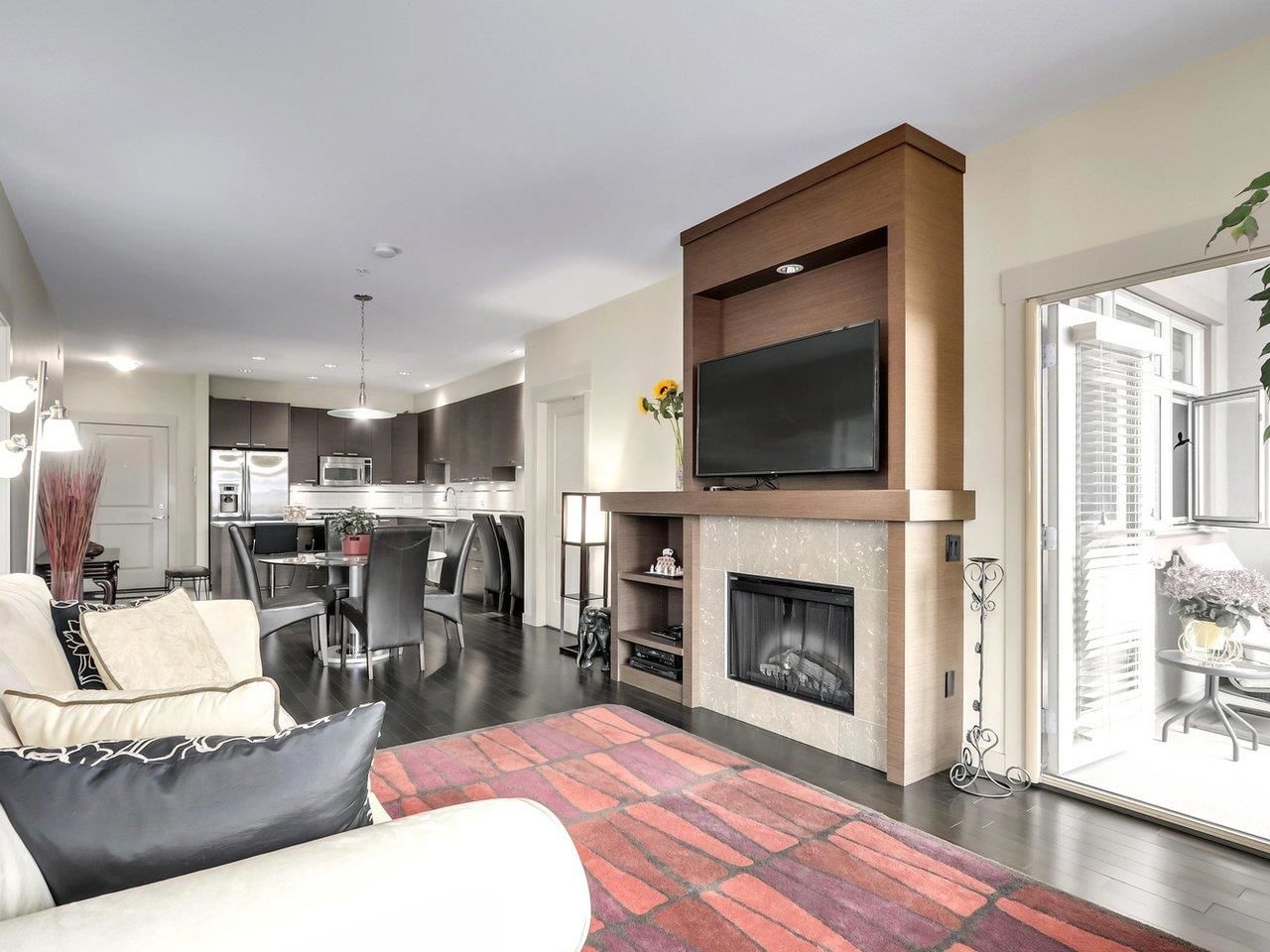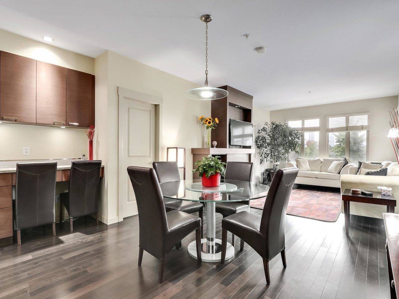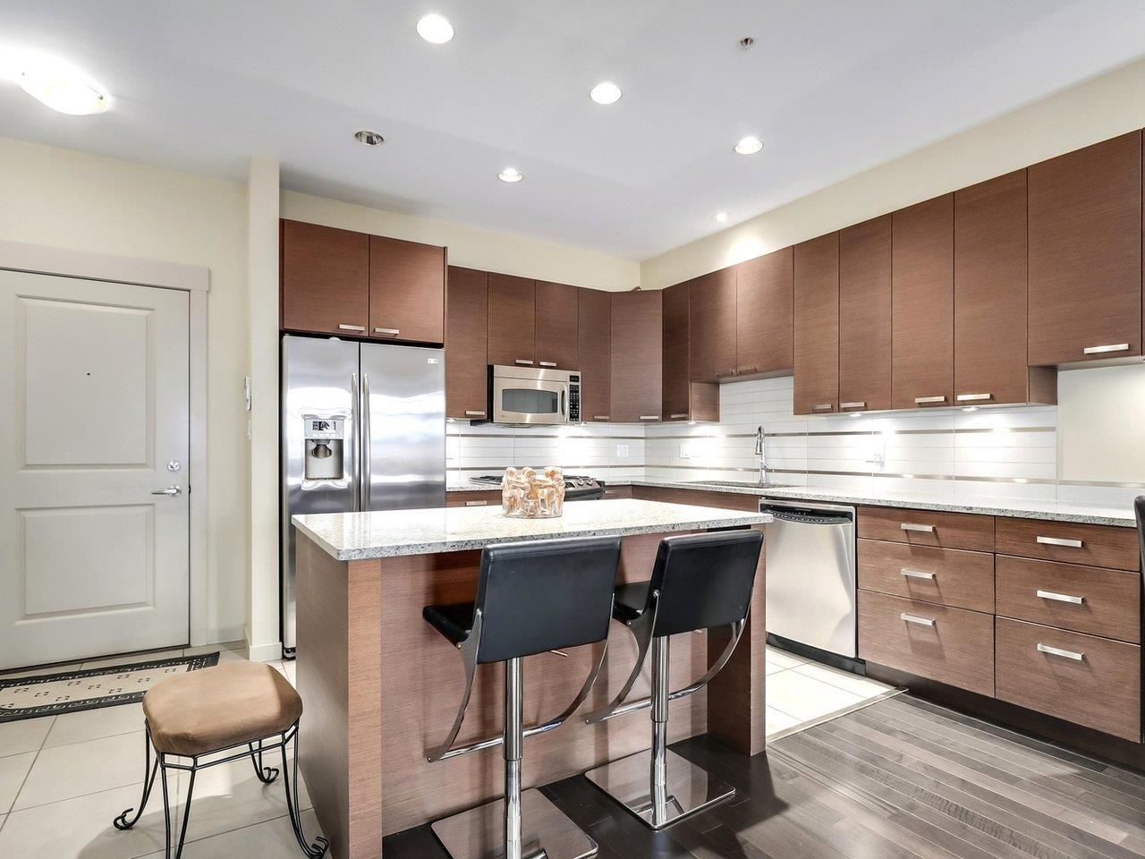 TRAMANTO in the "Heights" North Burnaby's most sought after address! This Boffo built development is sharp and stylish with a touch of European Flair! This large 2bdrm-1bath boasts a well appointed open plan with hardwood floors, a gourmet kitchen w/ granite counters, maple cabinets, GE Profile stainless steel appliances, gas range w/convection oven, built-in wine fridge in kitchen island, high end fixtures, gas fireplace, front load washer/dryer, high speed wiring & cable, patio, parking & storage. This location offers all amenities at your doorstep; Safeway, Royal Bank, Eileen Daley, Produce/Deli's/Coffee Shops & Restaurants within Transit outside your front door. Call Today!