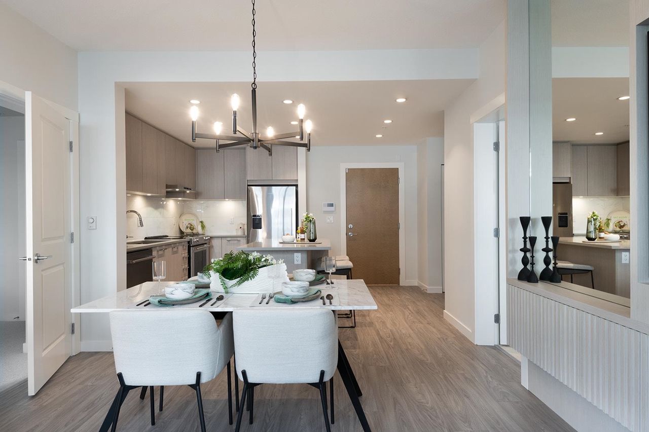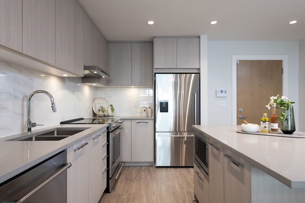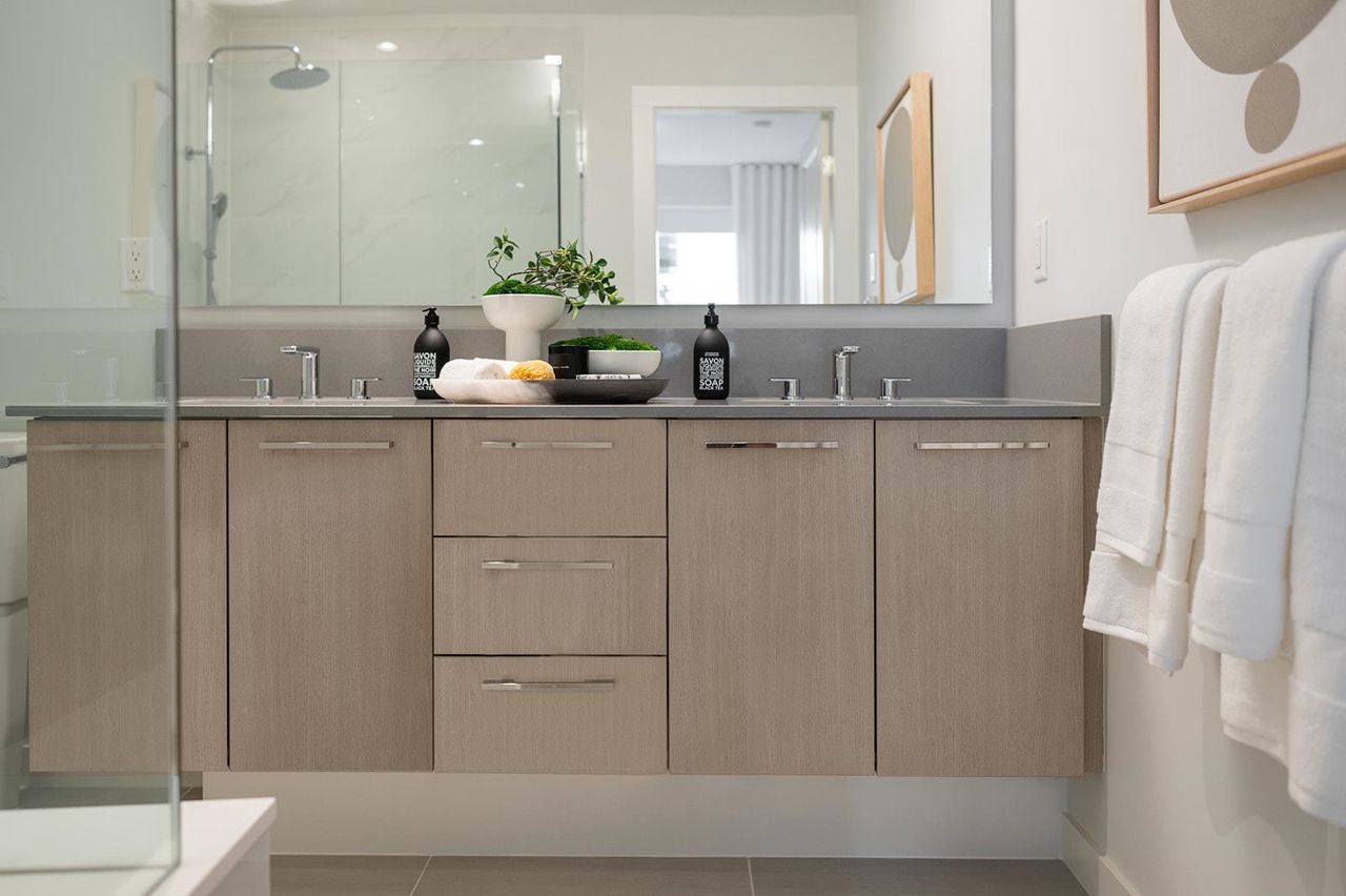 Come home to this new 2 bed 2 bath mingle-layout home at Polygon's Byrnepark. This home belongs to a collection of parkside residences in the heart of South Burnaby. Enjoy 861 sq. ft of living space with an open main living area with overheight ceilings, laminate wood-style flooring, expansive windows, and your own deck. The kitchen boasts custom cabinetry, sleek appliances, engineered stone countertops, full-height marble tile backsplash, and an island. The main ensuite features a spa shower with built in bench. Plus, enjoy the added bonus of a walk-in closet! Visit our sales office and two display homes at 6438 Byrnepark Drive, open noon - 6pm daily (except Friday), to learn more.