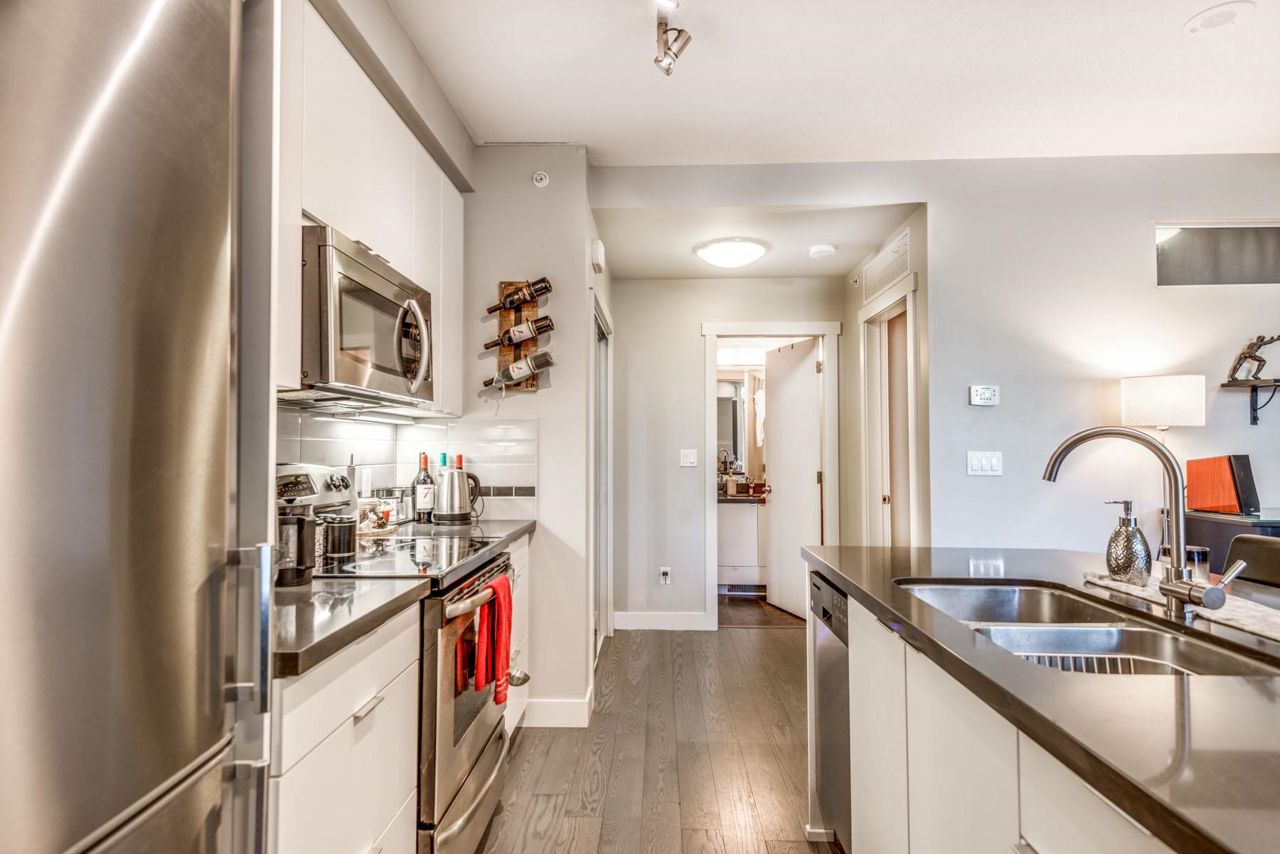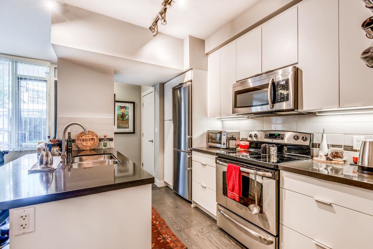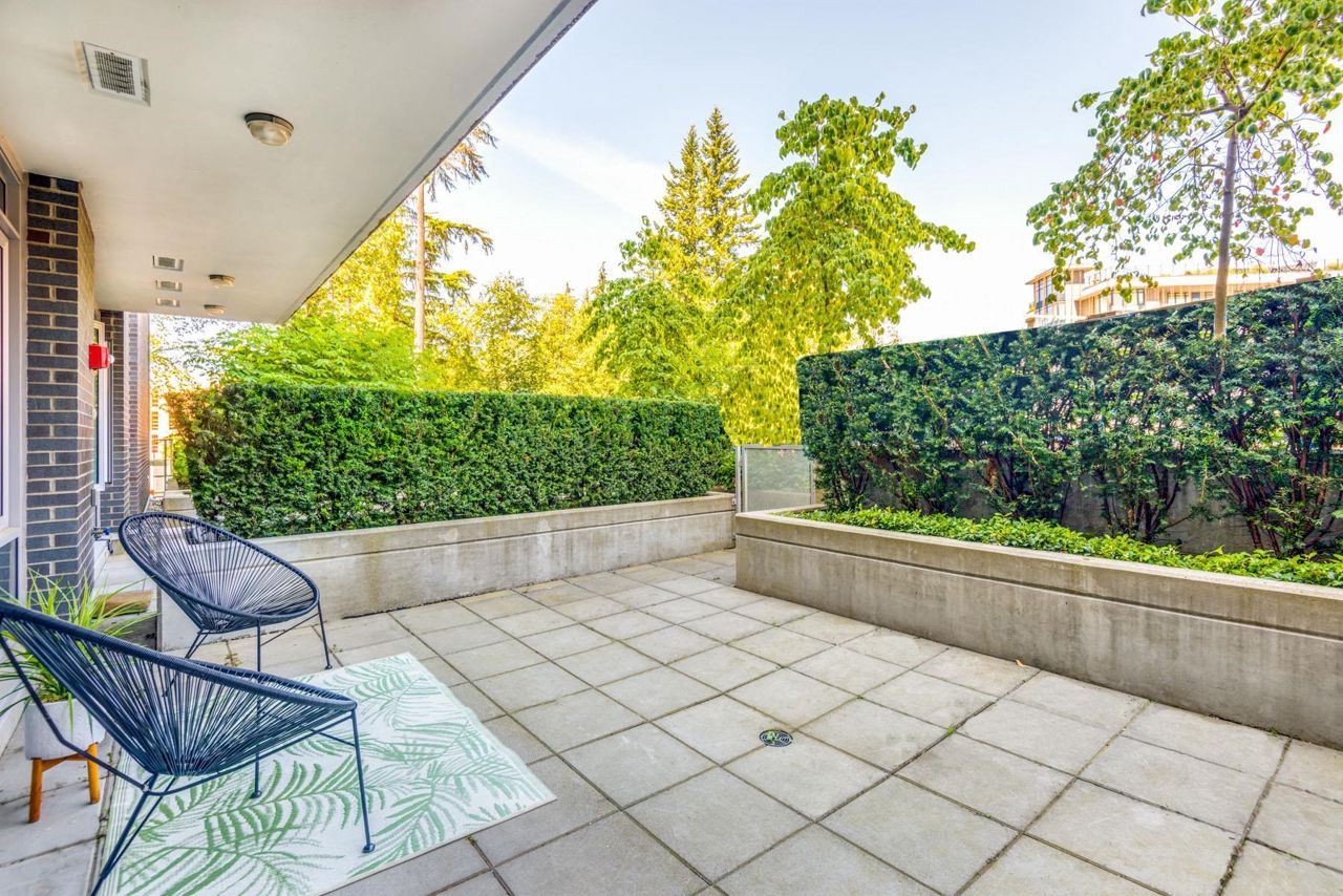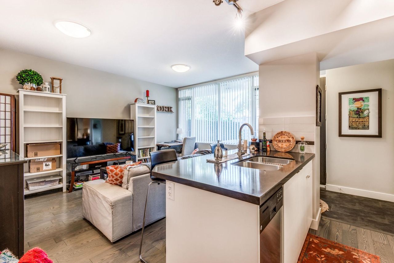 Soar above the clouds to be at the heart of the UniverCity Community. Welcome to "Highland House", a 12-storey concrete tower, built by one of the most reputable builders - Liberty Homes. An opportunity to buy into a beautifully-sustainable building and PERFECT investment property for consistent rental income. This one bedroom ground floor unit includes: S/S appliances, high-end flooring, under cabinet lights, kitchen island and a HUGE 299 sqft outdoor patio surrounded with lush greenery. Bonus - this unit has a private entrance from the patio! Spacious & bright with open-contemp design and in great condition. The unit comes with one parking and one storage locker. Perfectly placed among the trees, trails & streams & walking distance to shops, restaurants, Nesters and Transit.