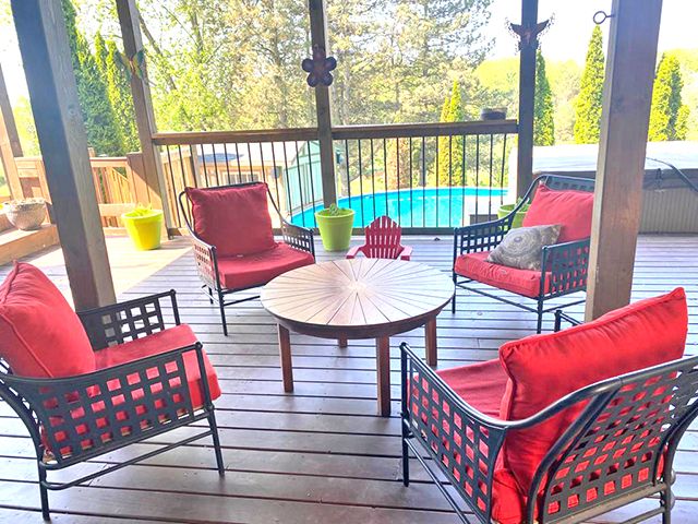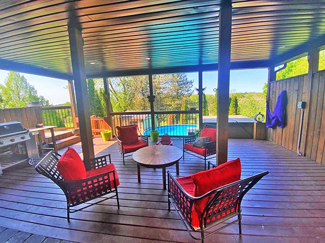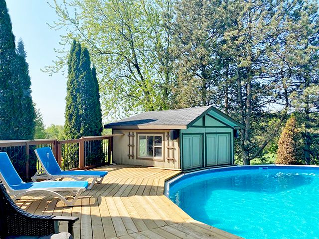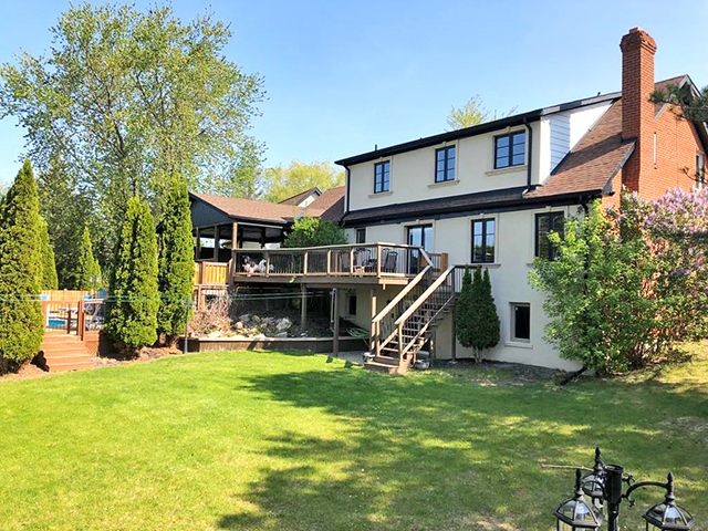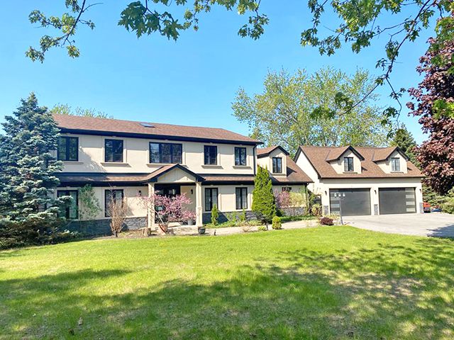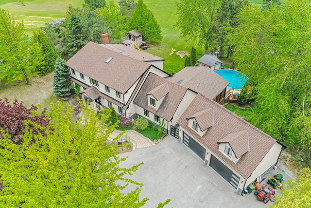 Enjoy the very best of country living yet only 30 Min from the airport. This 2+ acre ravine lot offers great views from your spectacular large terrace overlooking the pool and the sunsets. You can also watch your joyful children at the playhouse from your Outlooking deck in the backyard. Besides several decks and walk-outs from the home, you also have a newly added 4 car garage with and empty attic that could be finished to your wishes. A huge gourmet dream kitchen with coffered ceilings, pot lighting, centre island and top of the line appliances...It Is the heart of the home and opens to the covered terrace. Upgrades galore, Carpentry at its best, many built-in closets, showcase shelving, decorative wood wall, large baseboard, crown molding, new flooring...and every washroom was redone and upgraded. Butler space and bar were added near the Dining room. Even the laundry that works also as a mud room was upgraded. Please look at attached upgrades list, too large to mention all.This large home could well serve the extended family. The finished walk-out basement has a 2nd kitchen an old family room that could be used as a bedroom. A full 3 piece washroom and sauna are nearby. Another room is now used as a gym.