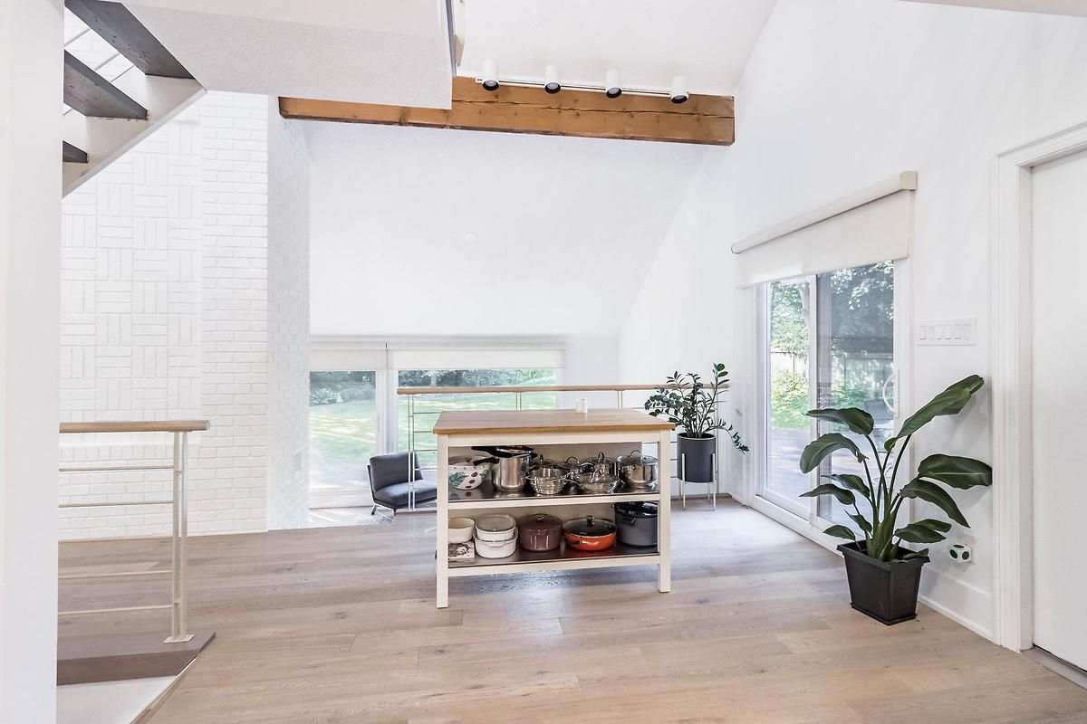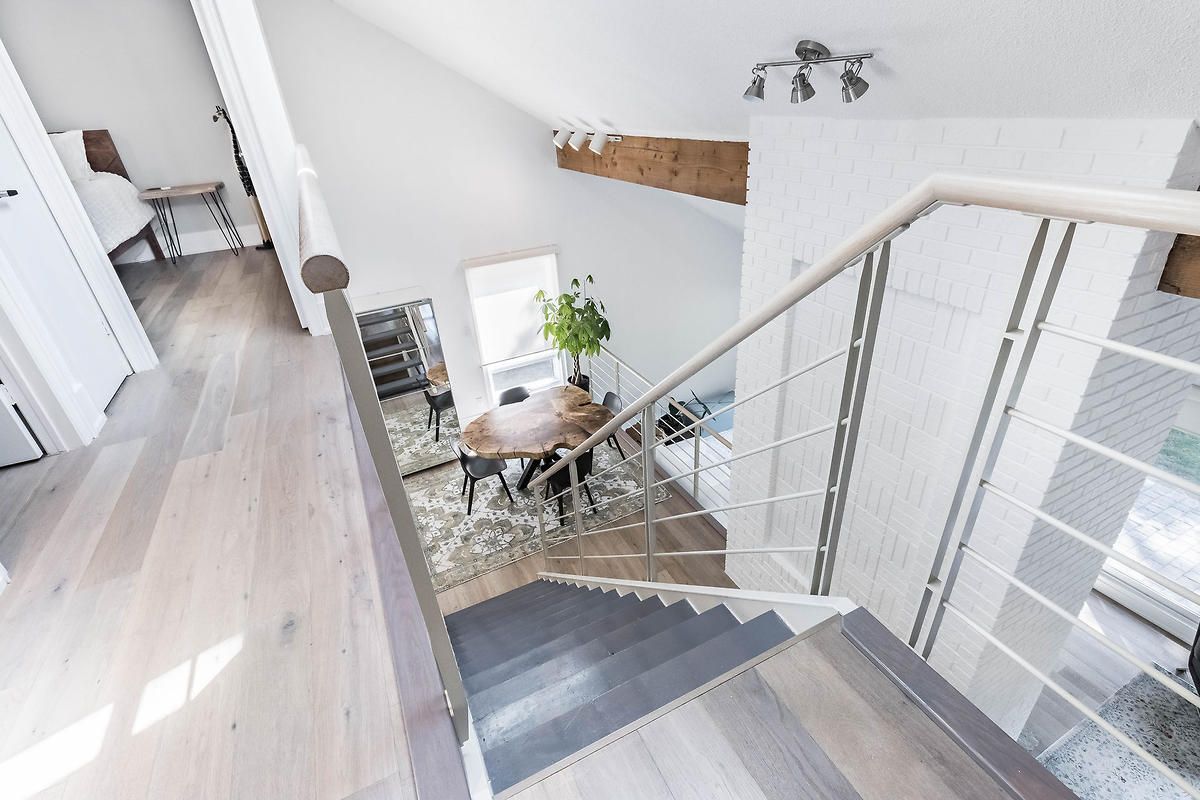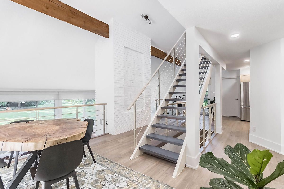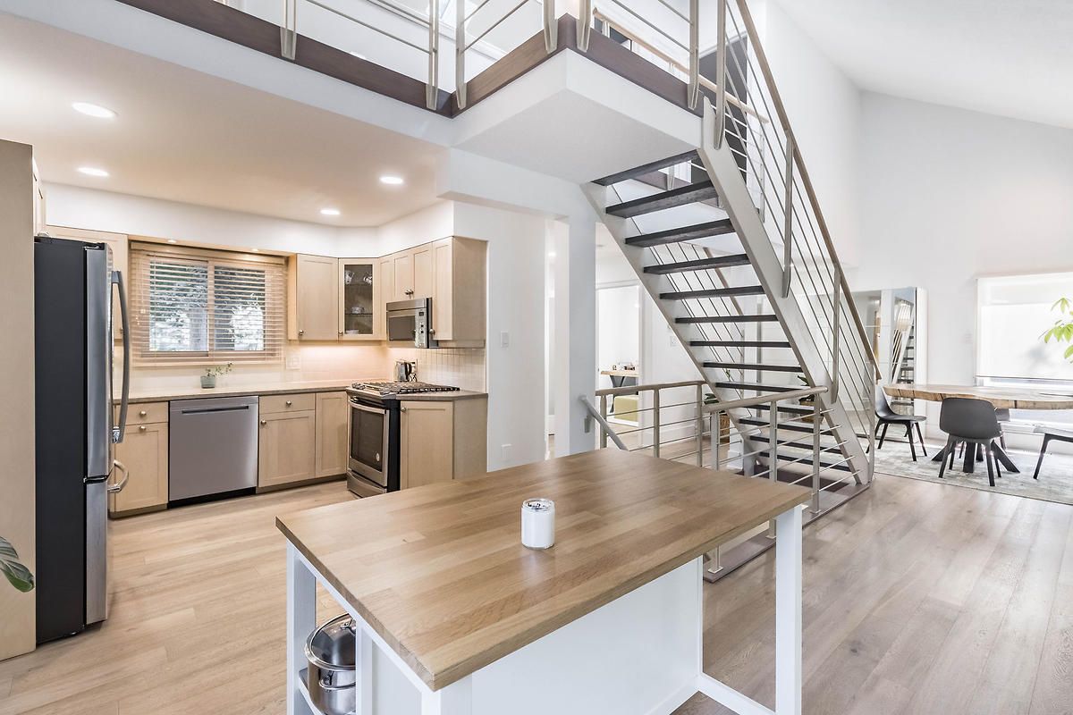 kitchen with eat in area and center island. Hardwood flooring, Open riser Staircase W/custom metal tube railing, Floor to ceiling