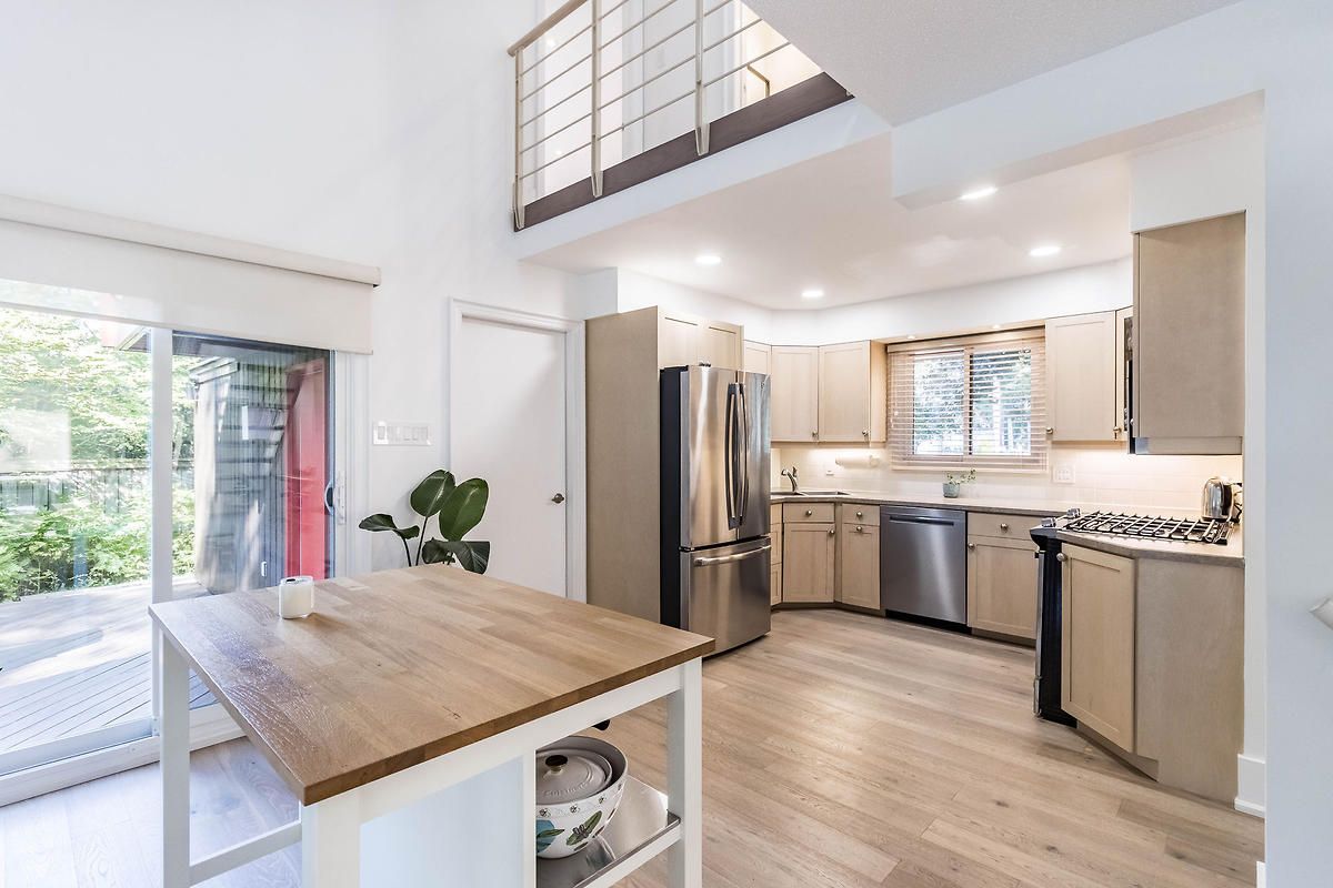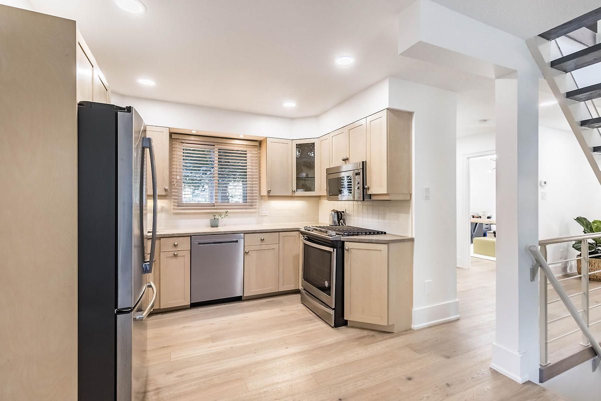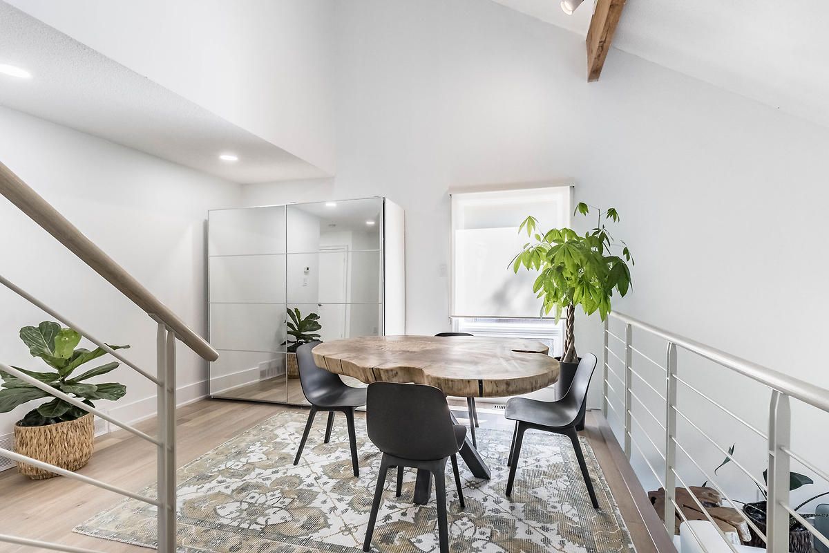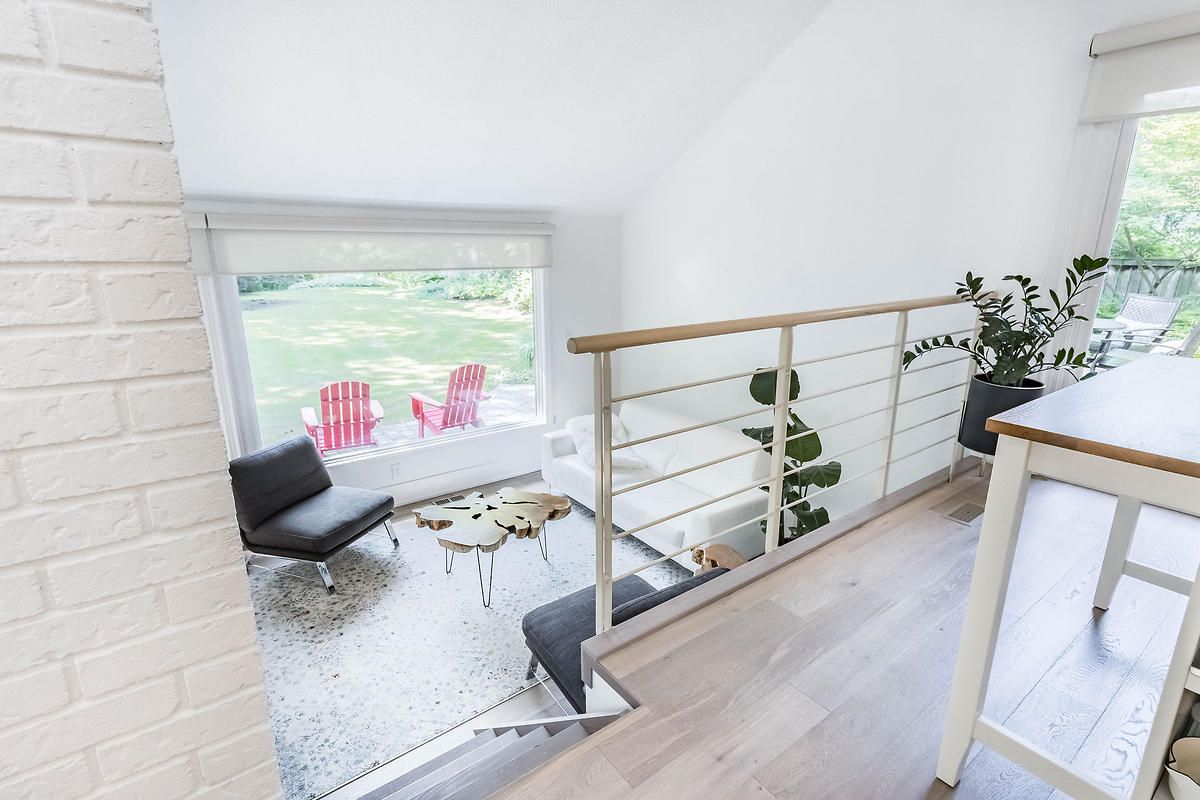 kitchen with eat in area and center island. Hardwood flooring, Open riser Staircase W/custom metal tube railing, Floor to ceiling