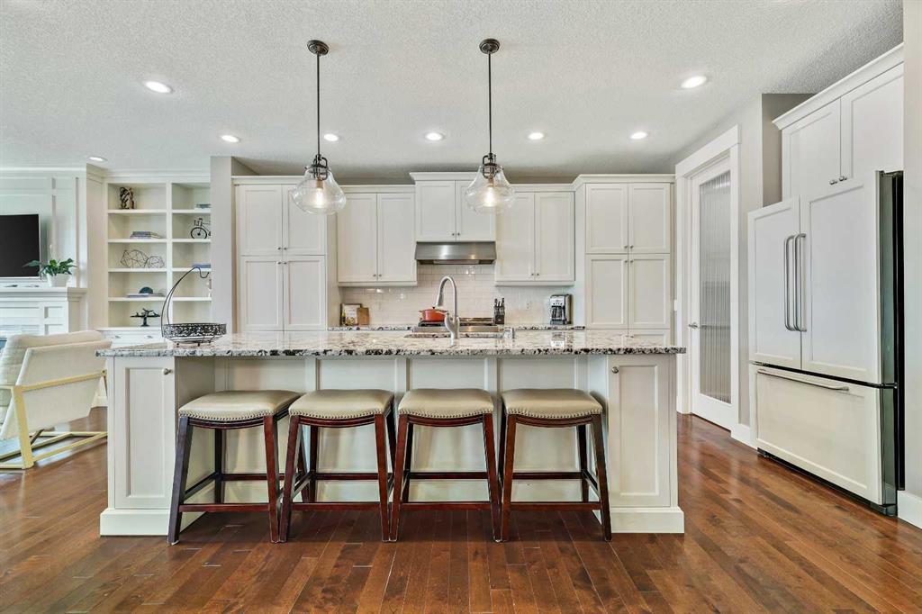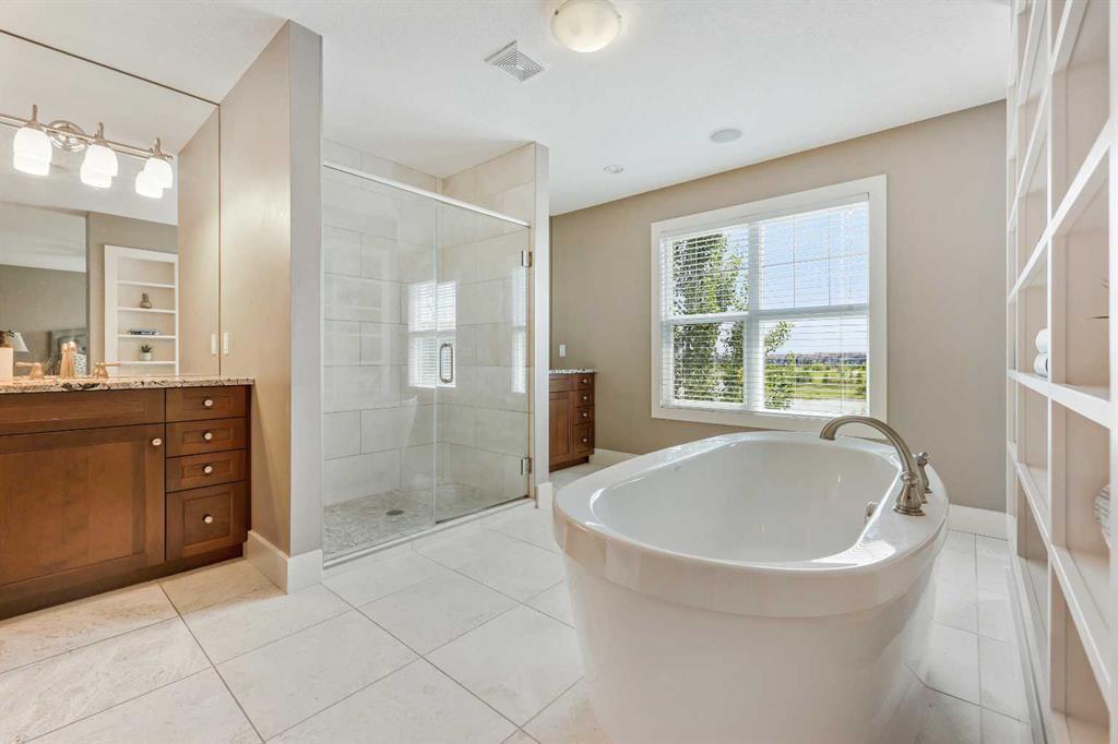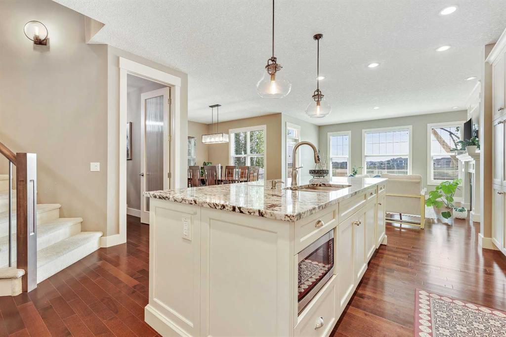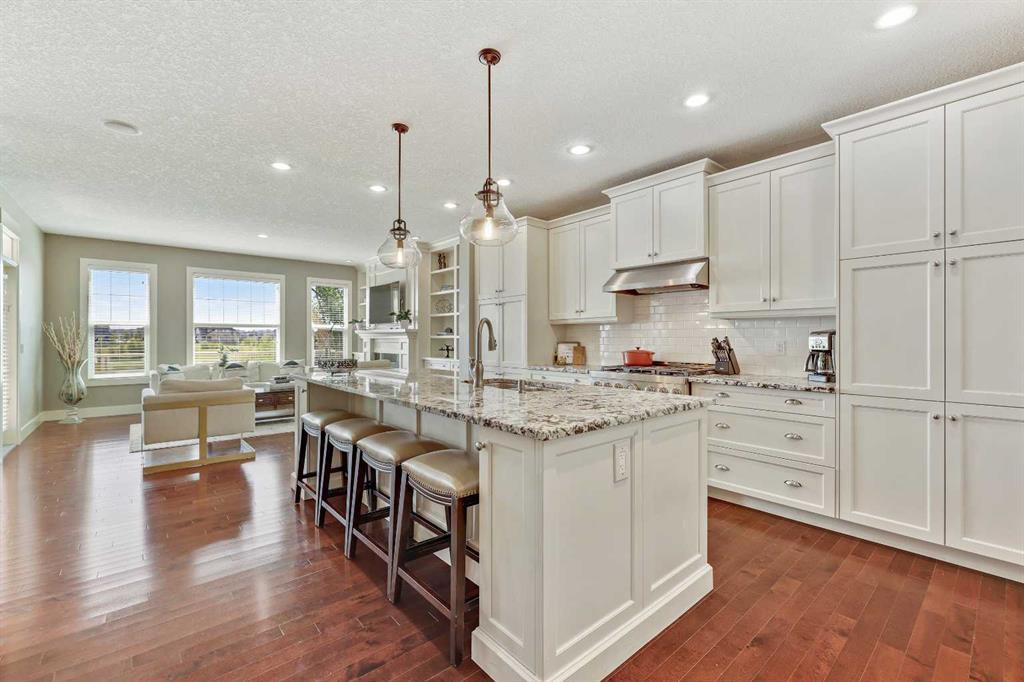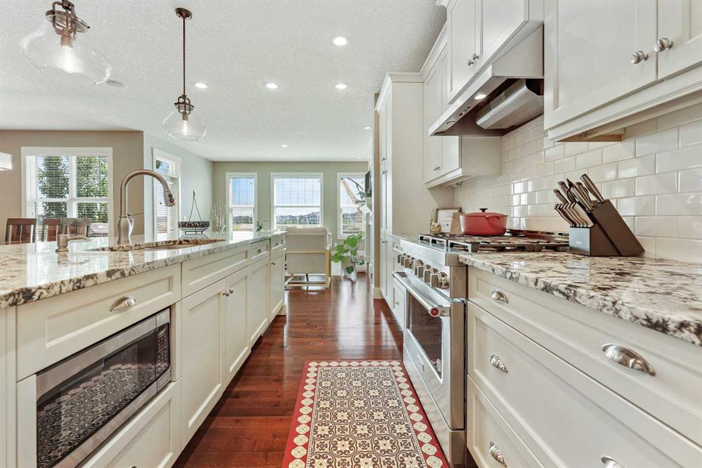 BACKS ONTO WETLANDS/GREENSPACE! Amazing location, tucked away on a quiet cul-de-sac in the highly sought after lake community of Mahogany! With over 3720 square feet of living space, this stunning home offers updates throughout its entirety including solid upgraded hardwood, premium granite counters, 9 ft ceilings on the main & lower levels, custom built-ins, upgraded lighting and hardware fixtures, just to name a few. Neutral timeless colours & massive windows throughout the entire home maximize your south exposed lot with plenty of natural light. Huge chef’s kitchen with high-end $7000 gas stove & updated appliances, cream coloured cabinetry, tiled backsplash and stunning granite. Walk-through butler’s pantry, large mudroom, powder room and main floor den/office are sure to meet all your needs. Spacious living & dining room areas with custom built-ins and a gas fireplace in the living room. Upstairs has 4 spacious bedrooms, including the primary retreat with a luxurious spa inspired ensuite complete with heated floors, dual vanity’s, oversize travertine shower, stand-alone soaker tub and a huge custom closet. The rest if this level offers a bonus room, full bath and laundry room. The amazing walkout level has been professionally finished with a recreation room, WET BAR, WINE CELLAR, home gym, 4 pc bathroom & storage area. Oversized double garage with built in workbench and upper storage. Stunning SOUTH FACING LOT with WALK-OUT BASEMENT. Endless walking paths and views right from your backyard! Enjoy your oversized wrap around upper deck & lower patio, both with gas hook ups! This home truly has it all! AC added in 2019! (id:22211)
