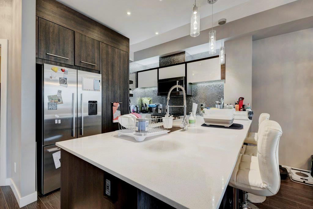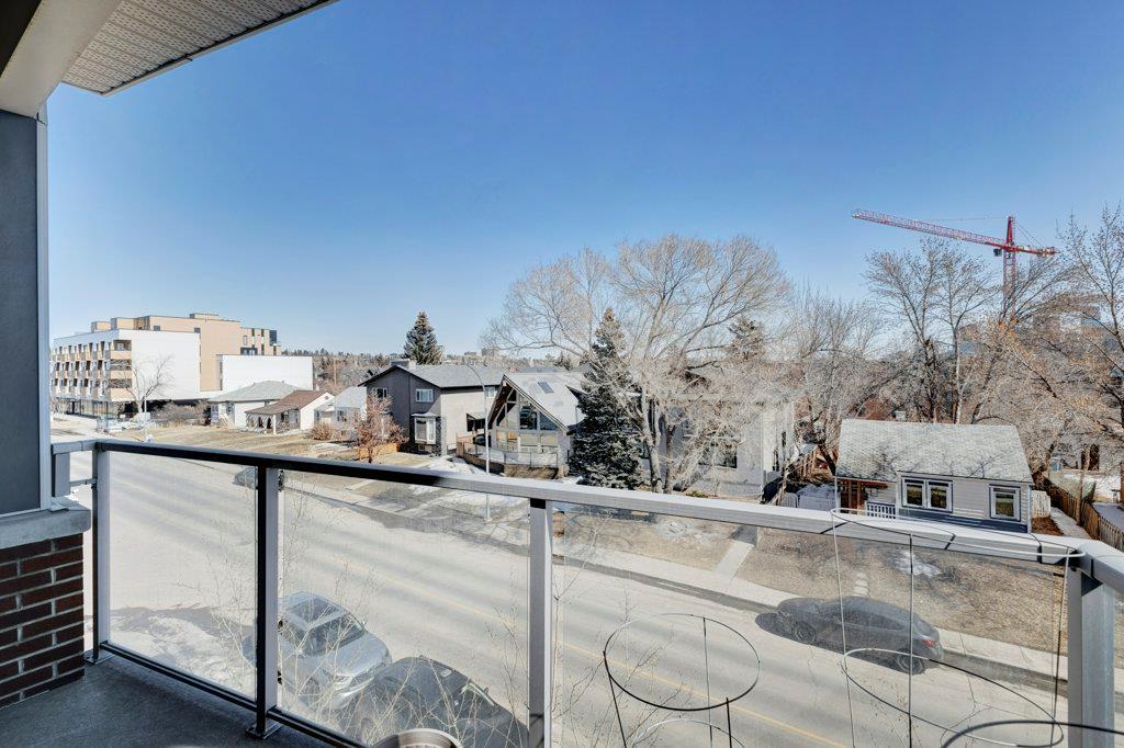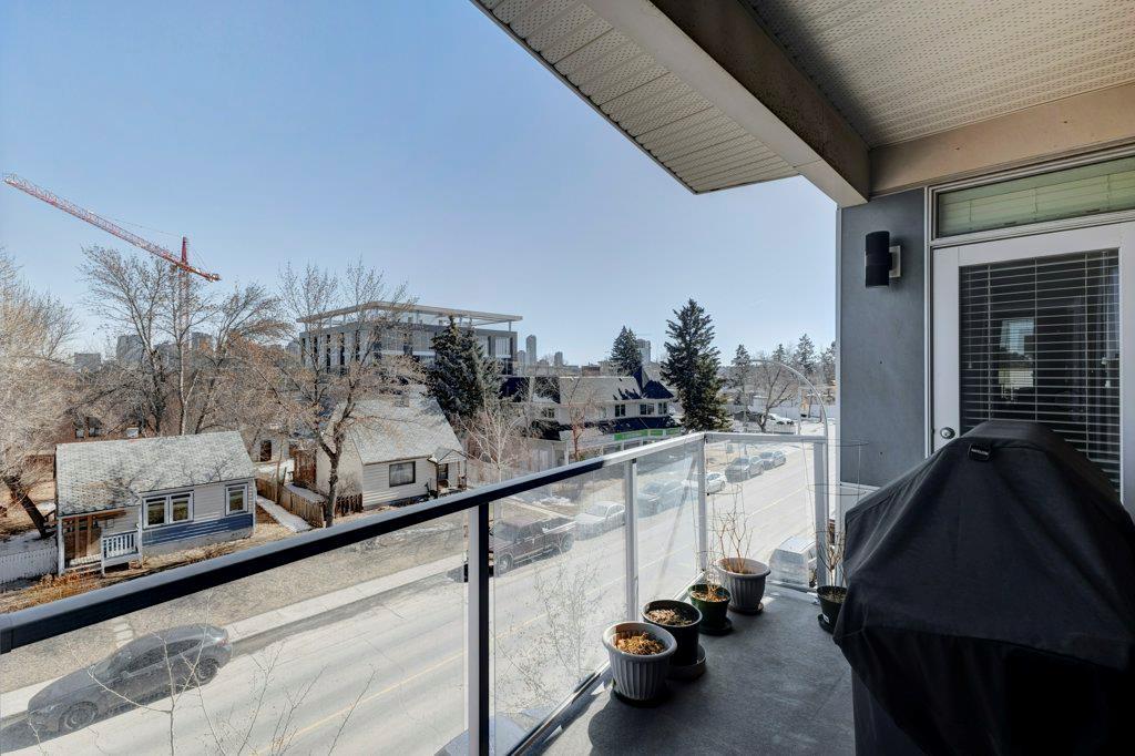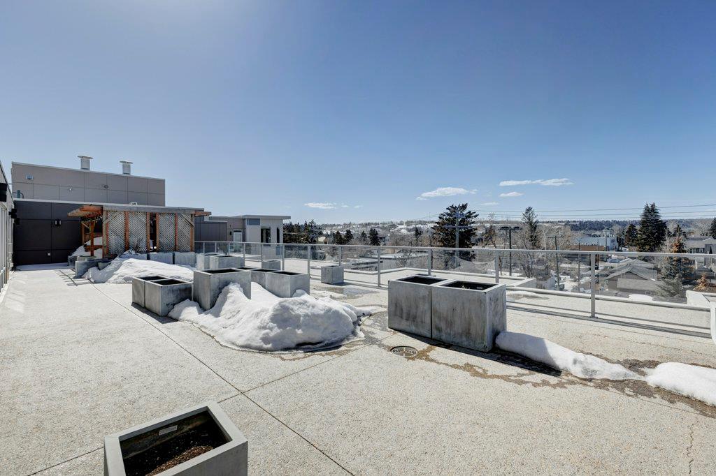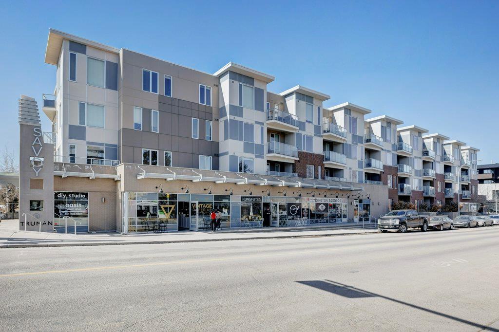 Terrific luxury corner residence in the “Savoy by Truman” on 19th St with shops, restaurants, bistro’s in West HiIlhurst and a short walk to Kensington village, the river pathways or walk to work. Convenient large den/office off foyer. Bright open concept kitchen: white lacquered and wood custom cabinetry, quartz counters and island with breakfast bar, gas stove, stainless steel appliances, open to dining area and large living room with corner windows and access to balcony. Primary suite has two large windows, access to balcony and has a large 4 pc ensuite with quartz vanity, glass vessel sink, soaker tub, separate glass shower, ceramic flooring & city views. 2nd bedroom has been opened up to create a larger, separate dining room (currently used as office) or it can be closed off again. 3 pc main bathroom also Quartz vanity and glass vessel sink and ceramic tile flooring. Engineered hardwood floors throughout living space. Laundry is stacked with storage. Note 4th level has a huge roof top patio with spectacular mountain and tree top views. Two indoor titled parking stalls, # 72 and #22. Exciting location to live with coffee shops, restaurants and pubs out your front door, easy access to downtown and Kensington's 10th St, public transportation and river pathways. (id:22211)