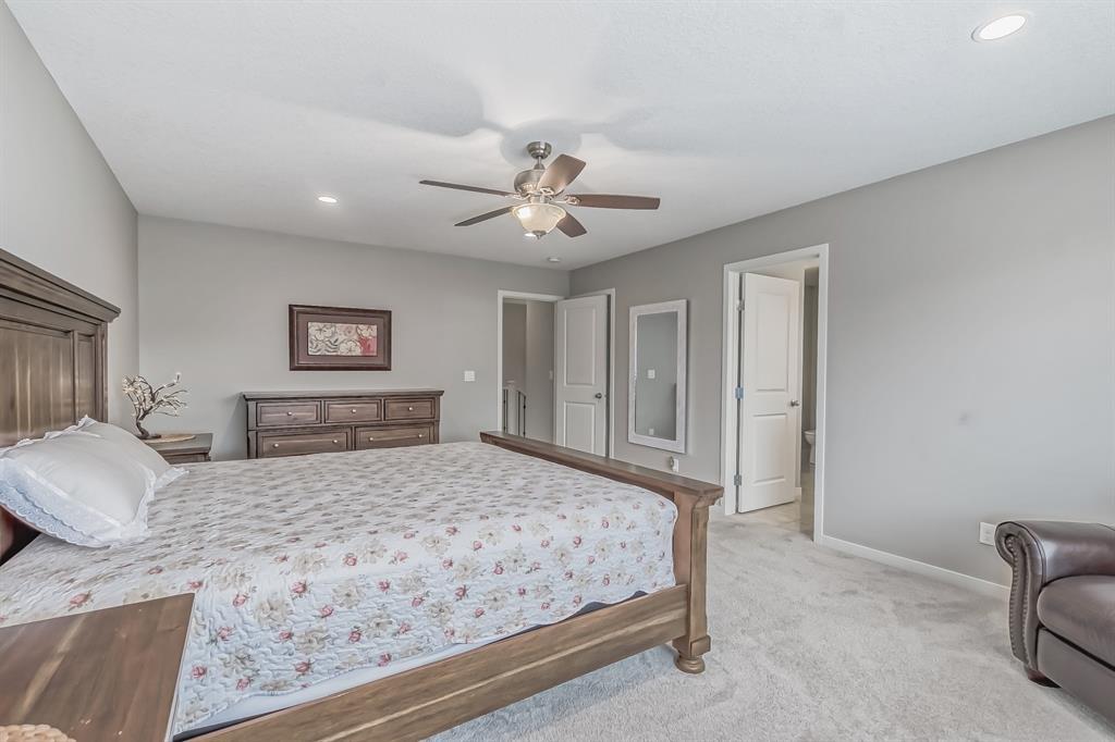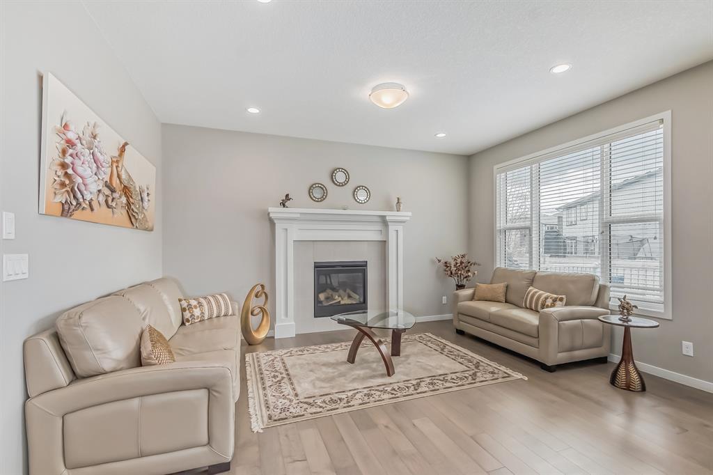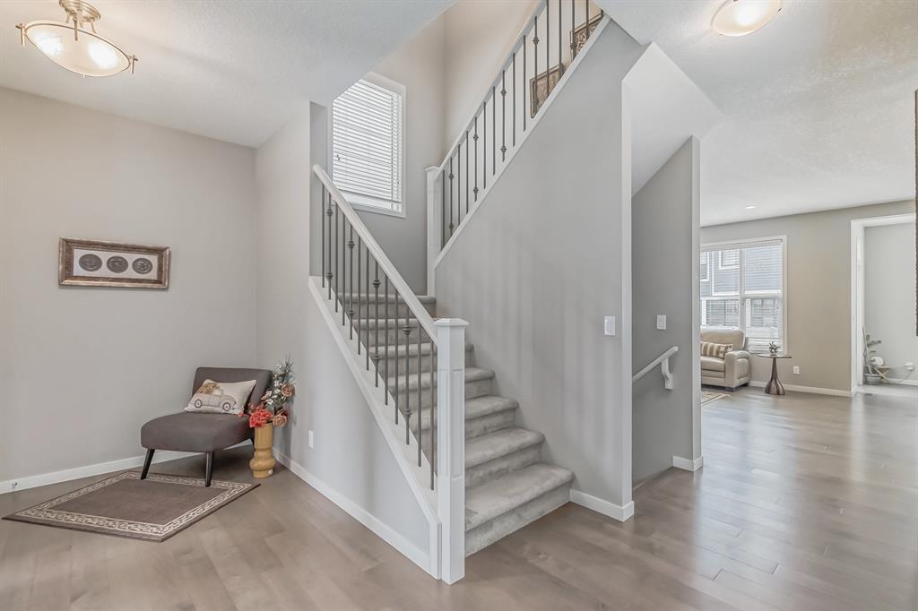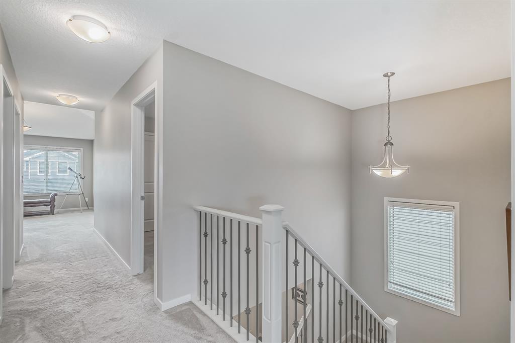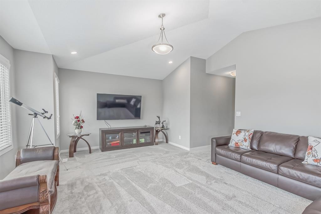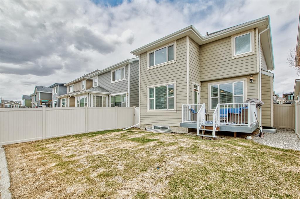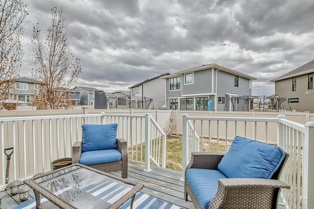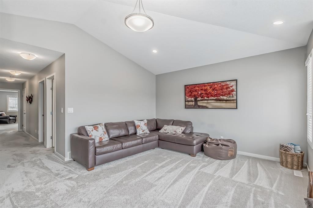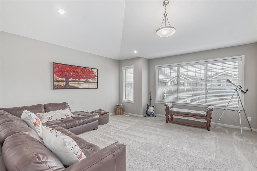 This lovely, well-maintained home is situated in a delightful neighborhood and is ready for a new family to make it their own. The open concept main floor is flooded with natural light from the south-facing windows, creating a bright and airy atmosphere. The 9-foot ceilings throughout the main level provide a spacious feel, while the living room is particularly inviting with its abundance of light. The kitchen is perfect for hosting guests and features quartz countertops, stainless steel appliances, a gas stove, a large center island, and a breakfast bar. A convenient pantry with covered glass sliding doors connects the kitchen and mudroom, making it easy to access daily essentials. Upstairs, the primary bedroom boasts a large walk-in closet and a 5-piece en-suite bathroom. Two additional bedrooms, one with an attached bathroom, and a generous bonus room with a vaulted ceiling are also on the upper level, providing plenty of space for the whole family. The basement has been beautifully finished by the developer, with a large family/rec room, an additional bedroom, a 4-piece bathroom, and ample storage. Outside, the backyard faces south and features a deck perfect for entertaining and barbequing(built-in gas line). The property is just steps away from a playground and conveniently located close to schools, parks, shops, and restaurants. Its easy to access new Stoney Trail, downtown or escape to mountains from this property. (id:22211)