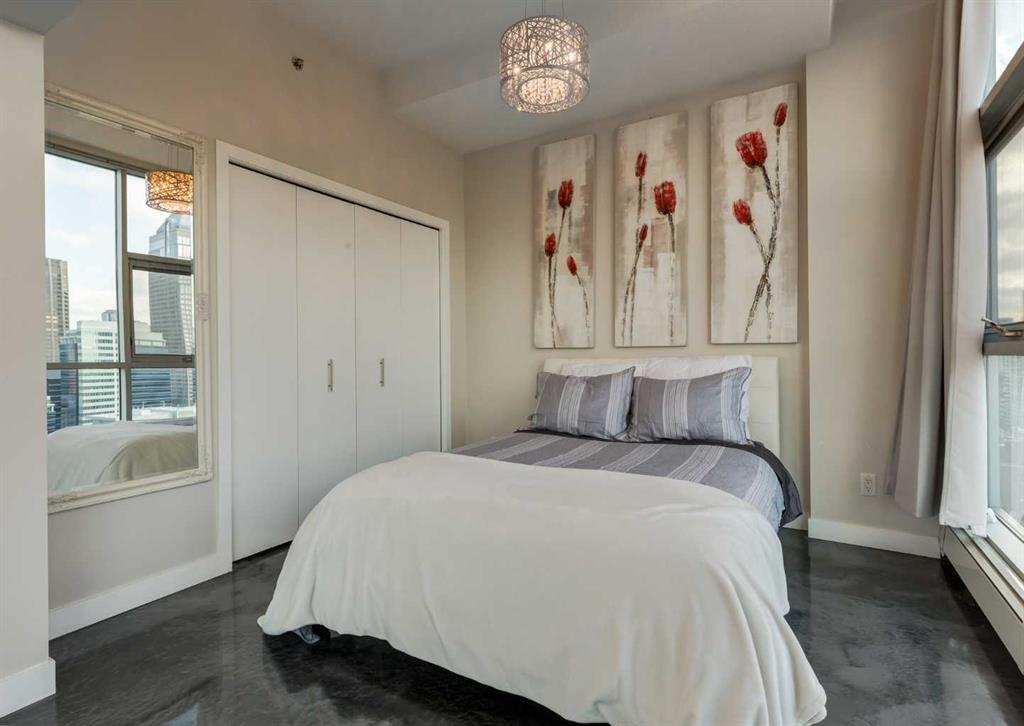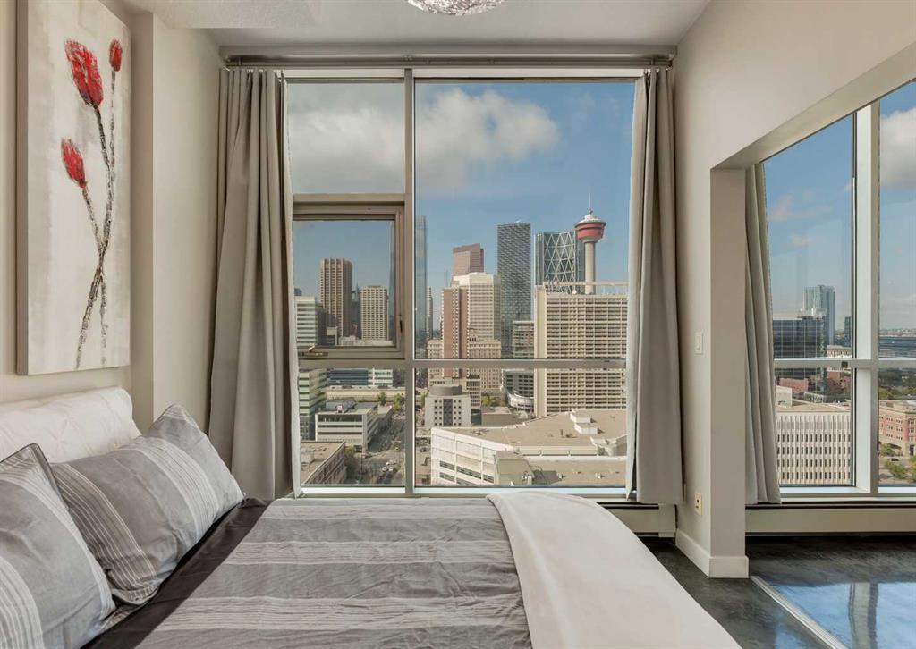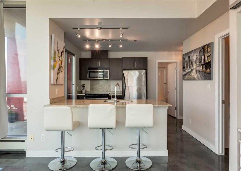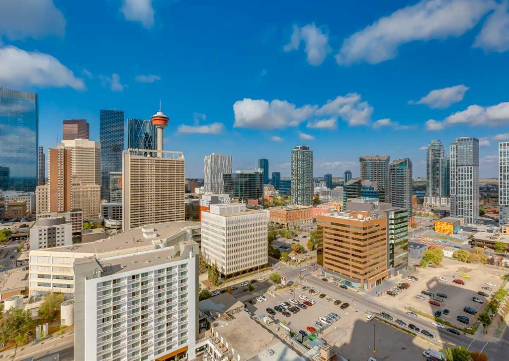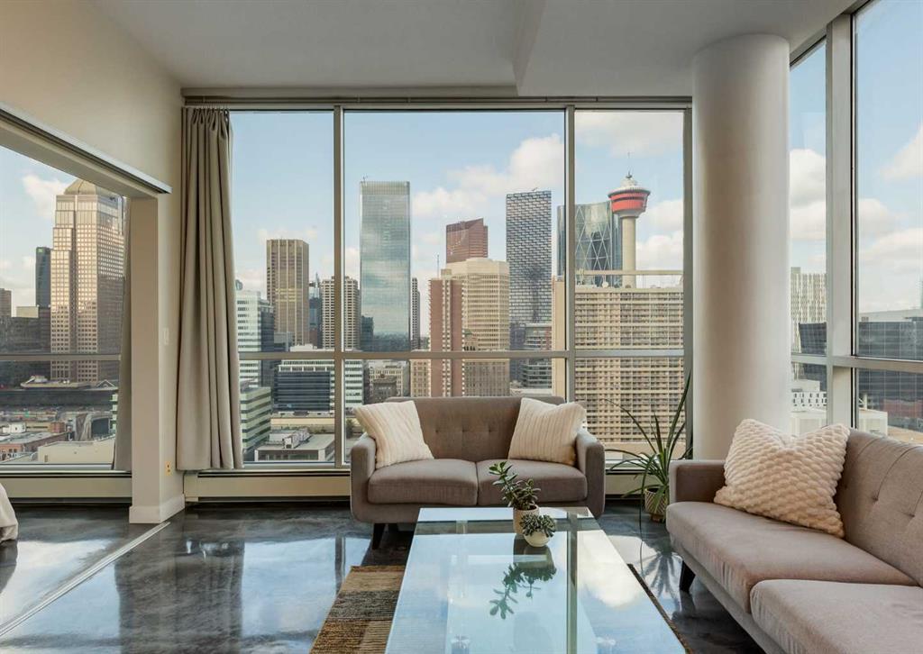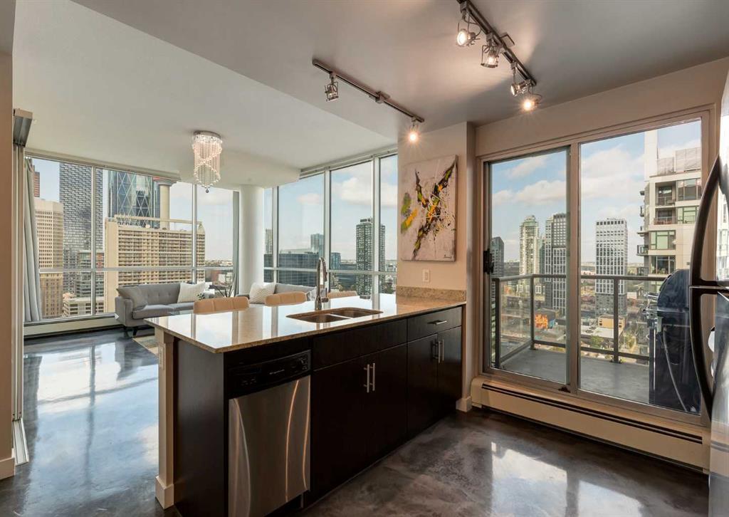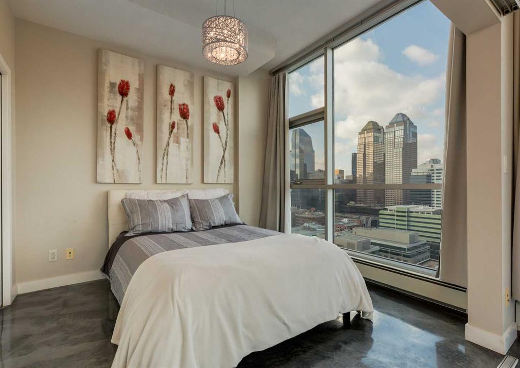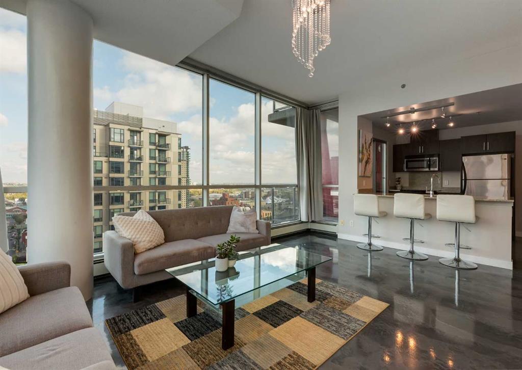 WOW!! Amazing unobstructed panoramic views of downtown and the city. This corner unit features 9 1/2 ft ceilings. Updated polished concrete floors throughout. Kitchen with stainless steel appliances, granite countertops and an island with flush eating bar. Large living room with floor to ceilings windows overlooking the downtown core. Wake up every morning to views from the large primary bedroom. Second bedroom or den (has no windows), full 4pc bathroom with granite countertops and in suite laundry. A cozy balcony with downtown, east and south views. Other features include updated lighting fixtures, central A/C, titled underground parking stall and an additional nook space that could be used for a computer work area. Secured building with bike storage. Located just steps from restaurants and bars and minutes to the LRT, schools, downtown core and 17th Ave. This unit is in great shape and has been well taken care of. Make your private showing today. (id:22211)
