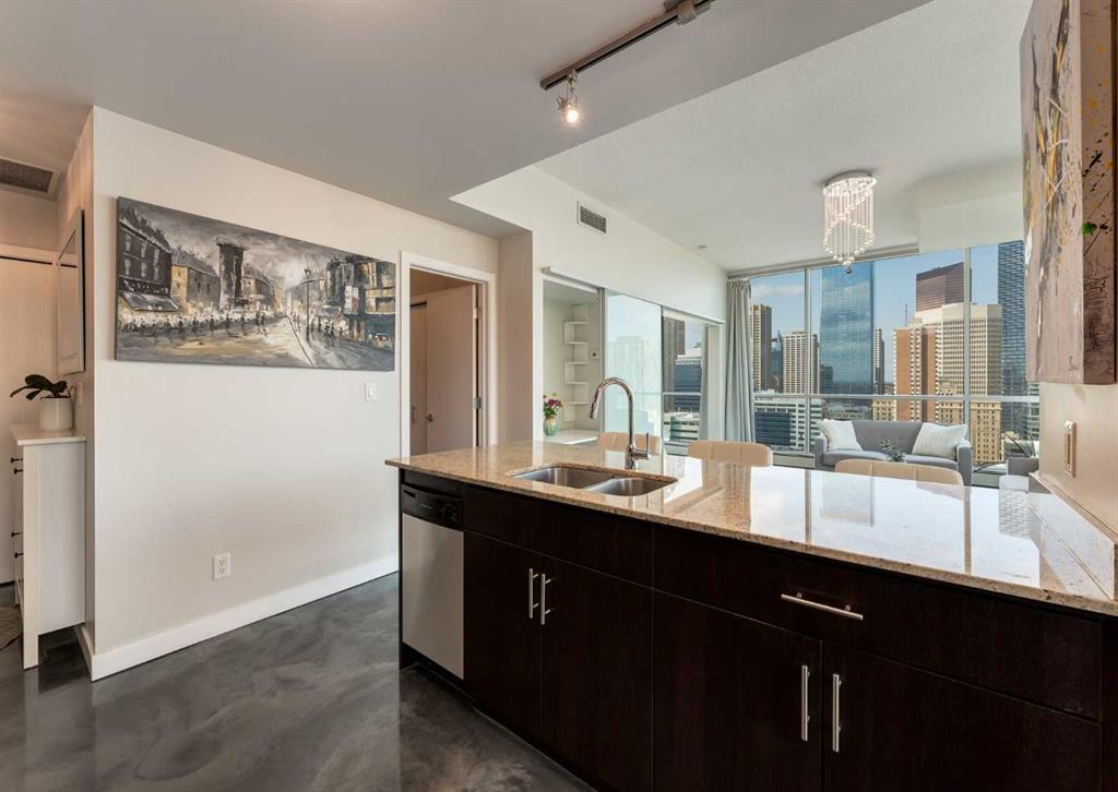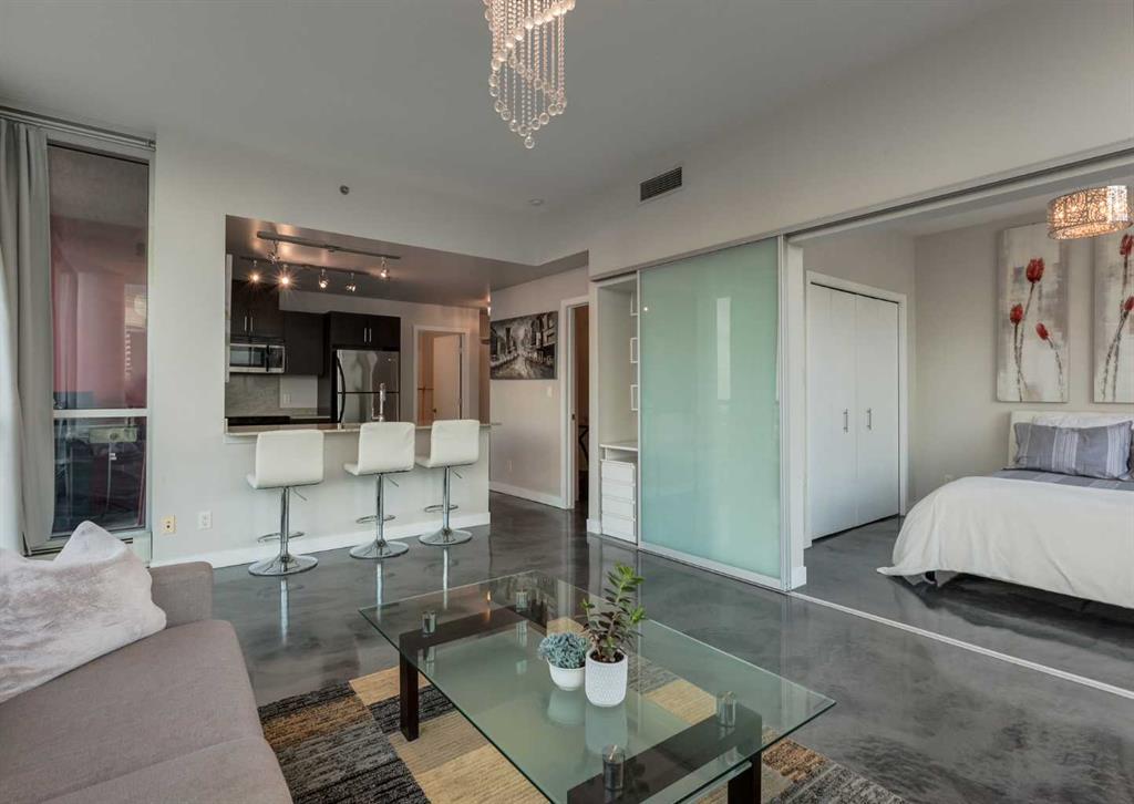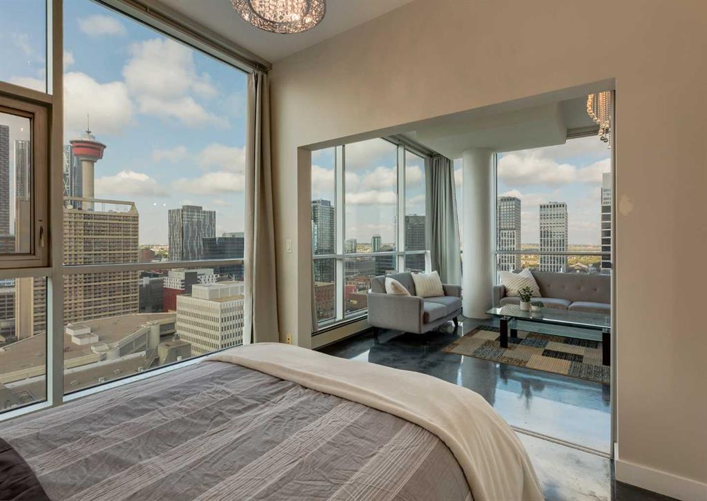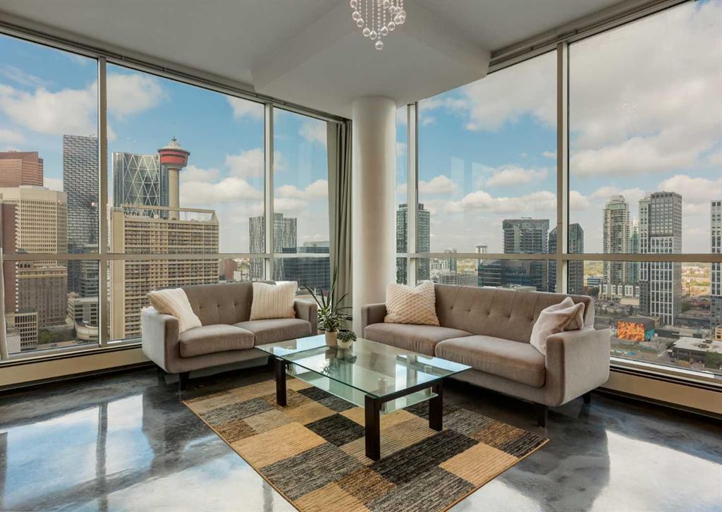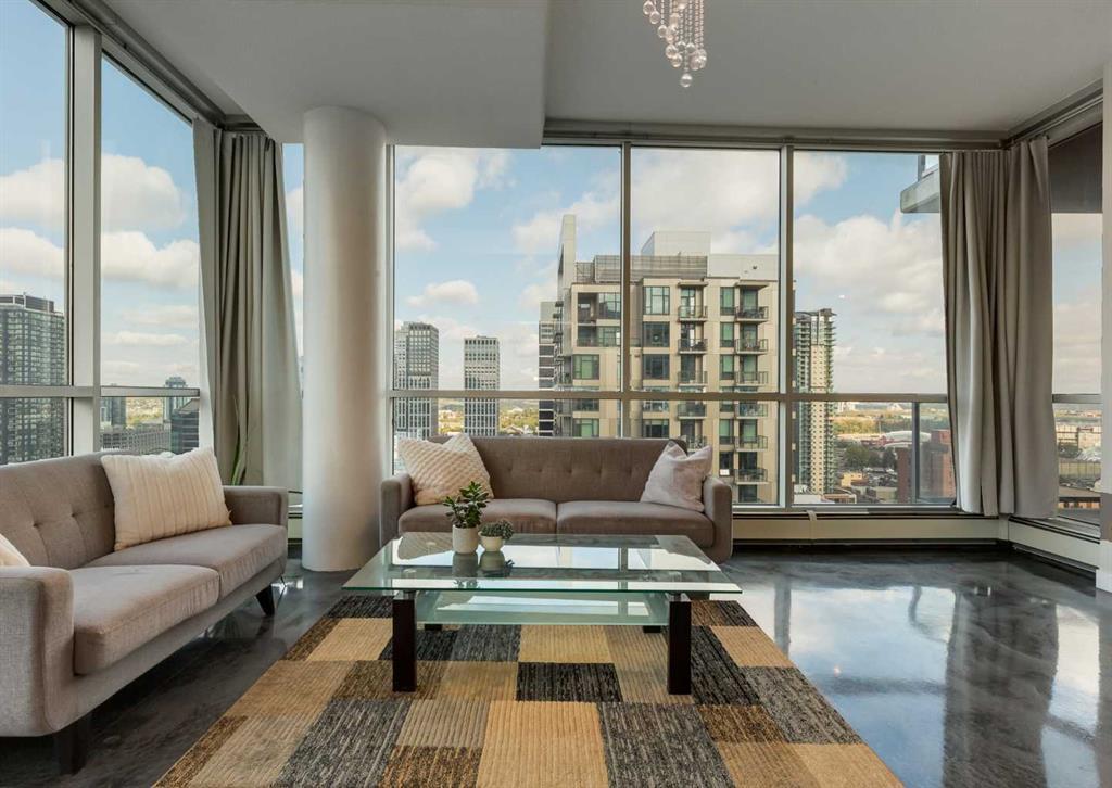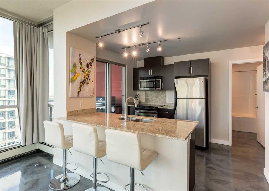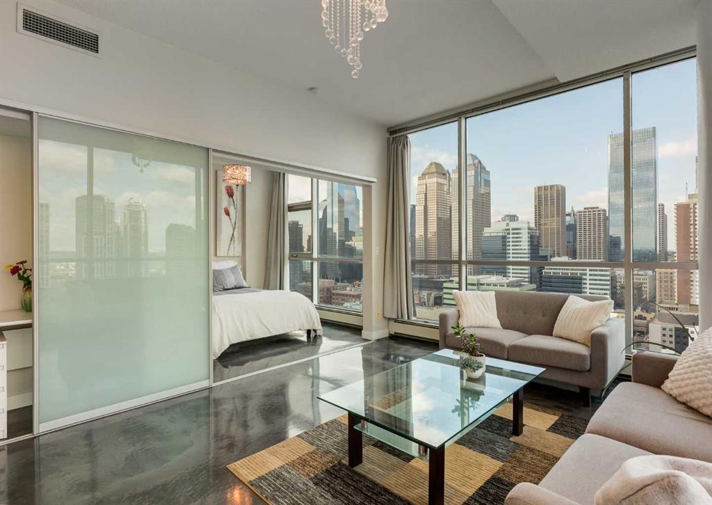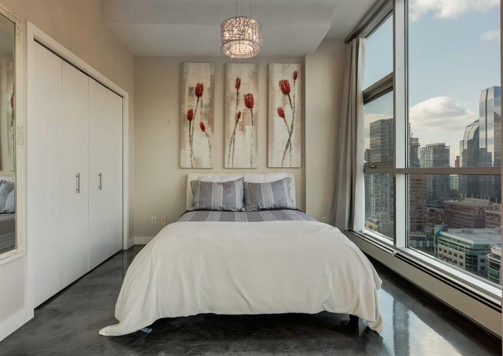 WOW!! Amazing unobstructed panoramic views of downtown and the city. This corner unit features 9 1/2 ft ceilings. Updated polished concrete floors throughout. Kitchen with stainless steel appliances, granite countertops and an island with flush eating bar. Large living room with floor to ceilings windows overlooking the downtown core. Wake up every morning to views from the large primary bedroom. Second bedroom or den (has no windows), full 4pc bathroom with granite countertops and in suite laundry. A cozy balcony with downtown, east and south views. Other features include updated lighting fixtures, central A/C, titled underground parking stall and an additional nook space that could be used for a computer work area. Secured building with bike storage. Located just steps from restaurants and bars and minutes to the LRT, schools, downtown core and 17th Ave. This unit is in great shape and has been well taken care of. Make your private showing today. (id:22211)
