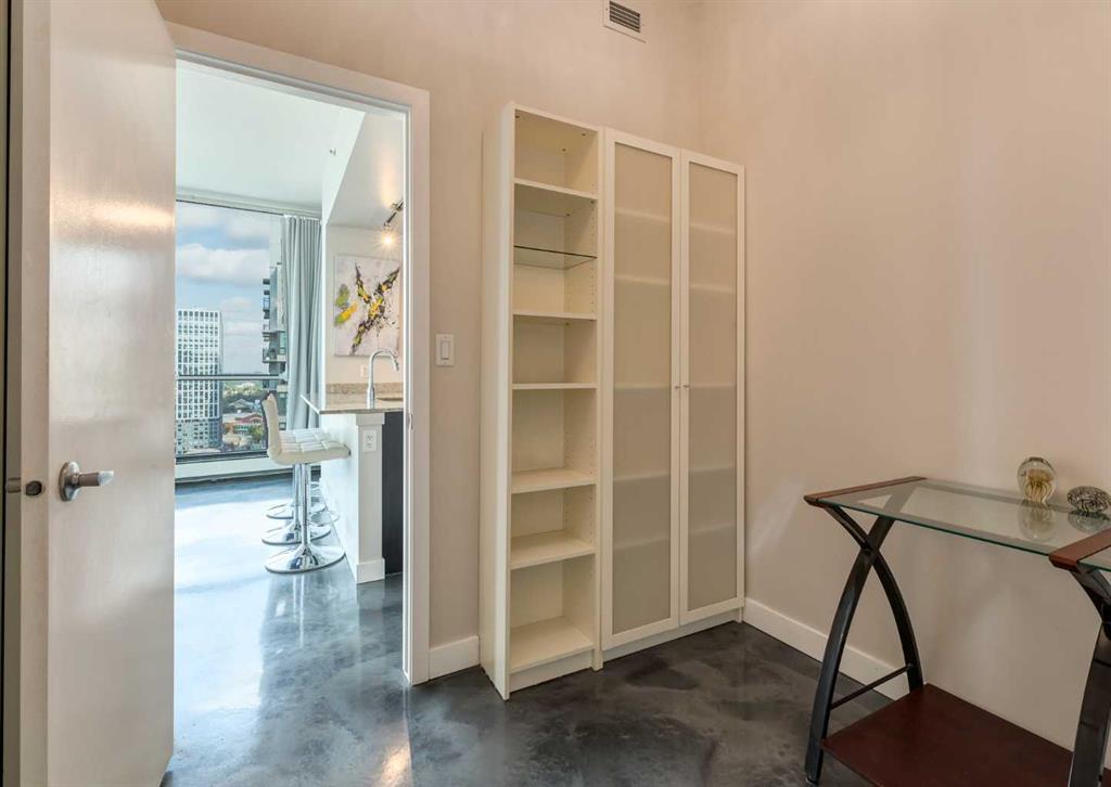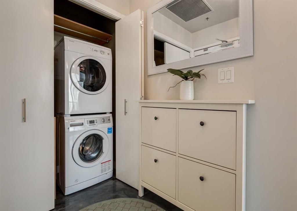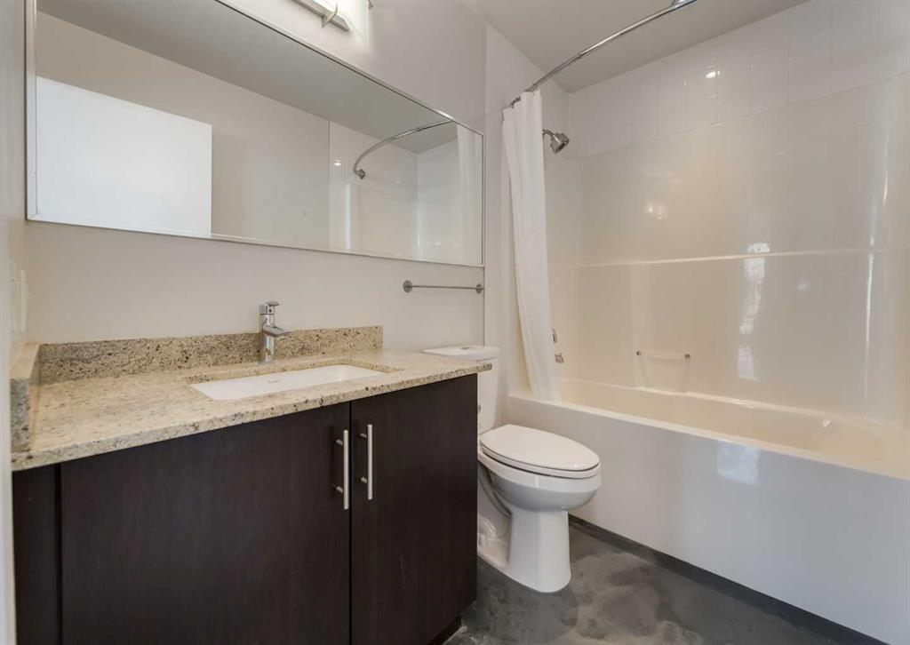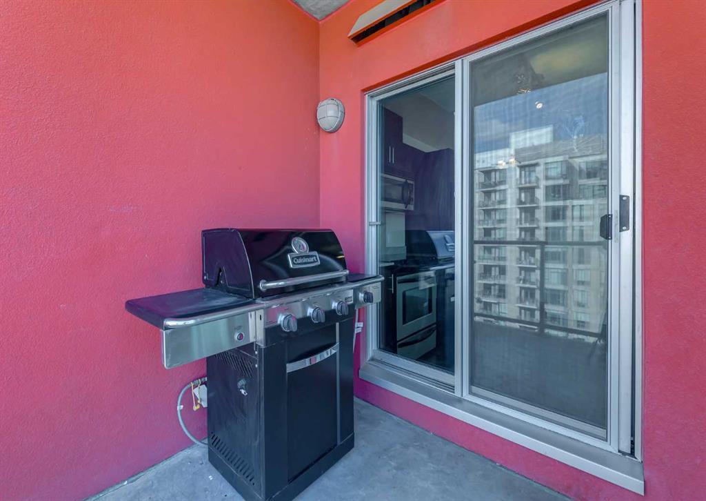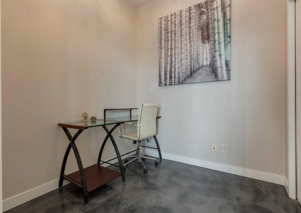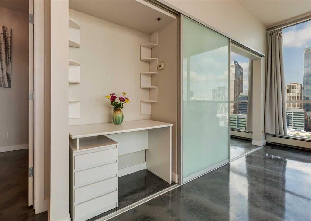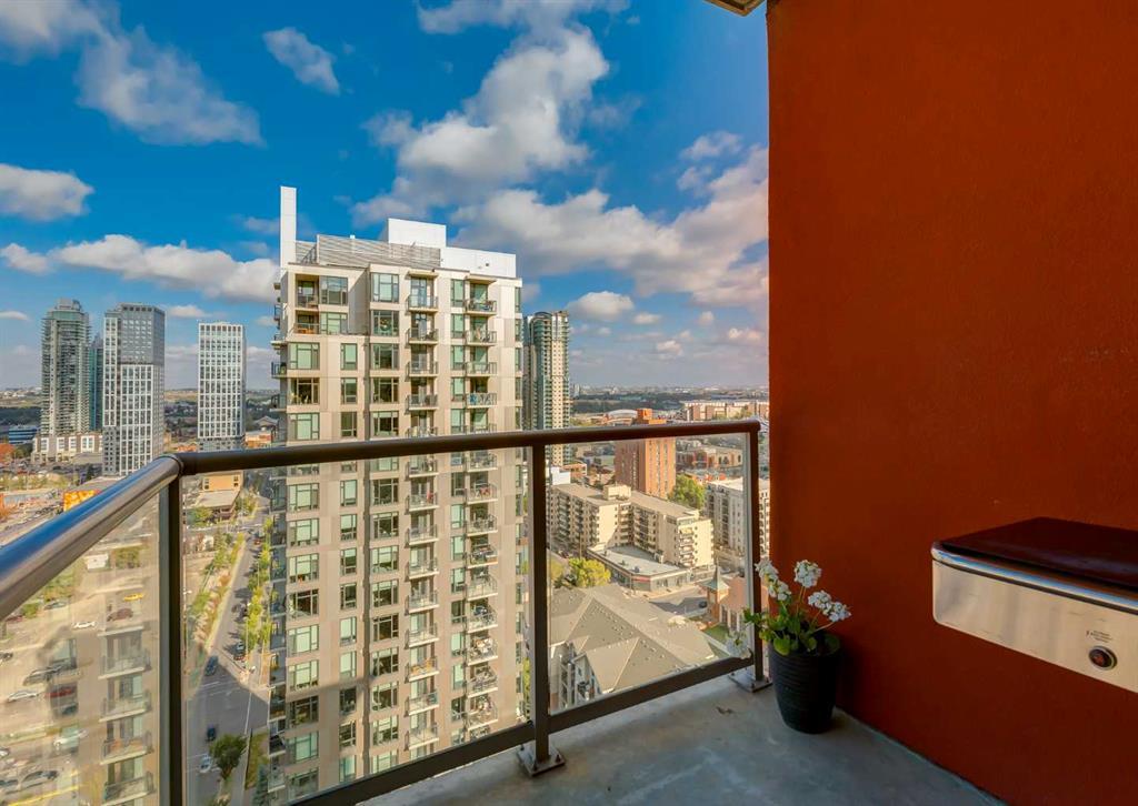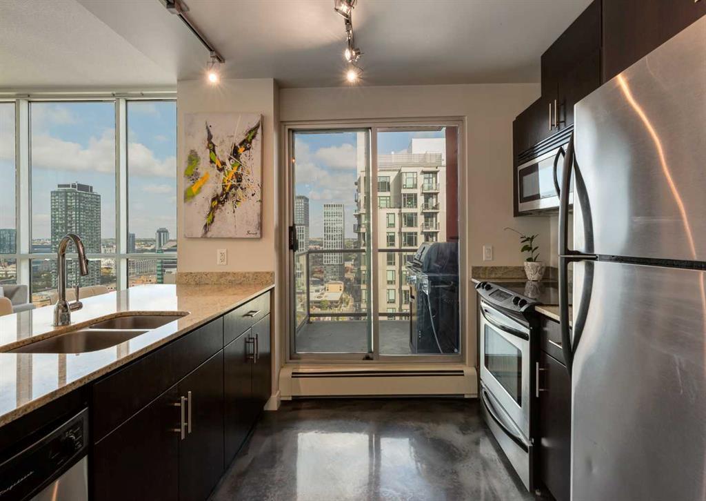 WOW!! Amazing unobstructed panoramic views of downtown and the city. This corner unit features 9 1/2 ft ceilings. Updated polished concrete floors throughout. Kitchen with stainless steel appliances, granite countertops and an island with flush eating bar. Large living room with floor to ceilings windows overlooking the downtown core. Wake up every morning to views from the large primary bedroom. Second bedroom or den (has no windows), full 4pc bathroom with granite countertops and in suite laundry. A cozy balcony with downtown, east and south views. Other features include updated lighting fixtures, central A/C, titled underground parking stall and an additional nook space that could be used for a computer work area. Secured building with bike storage. Located just steps from restaurants and bars and minutes to the LRT, schools, downtown core and 17th Ave. This unit is in great shape and has been well taken care of. Make your private showing today. (id:22211)