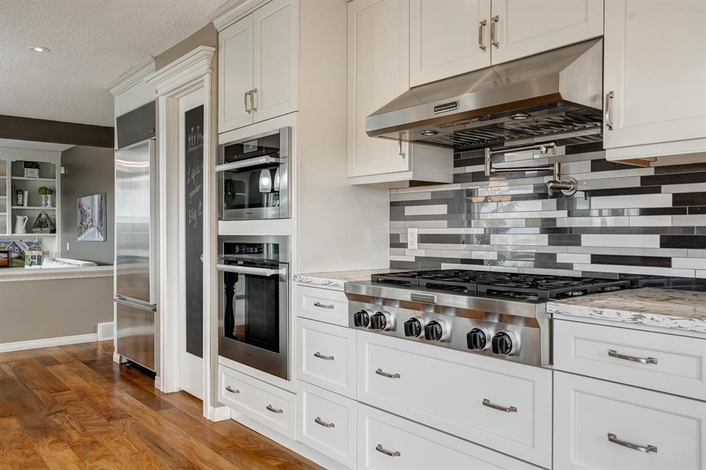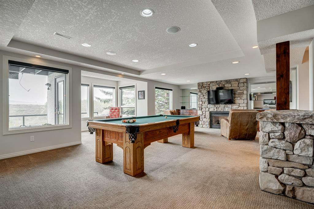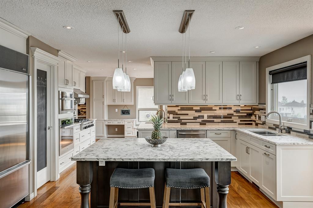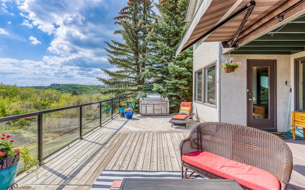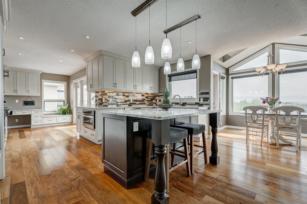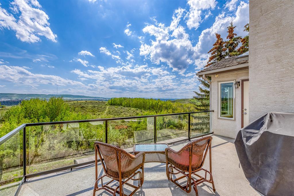 Take in the MAJESTIC MOUNTAIN AND RAVINE VIEWS while relaxing in your private picturesque estate. Stylish & functional, our 5 bedroom home offers almost 4000 ft² of developed living space with newer hardwood and a spacious renovated kitchen with high-end appliances. There is no shortage of counter space with the island and butler’s prep area complete with sink and wine rack. Upon entering you'll notice the curved staircase in the open foyer, office, laundry/mudroom with lockers, and a peek into the dining room large enough for everyone! The sunken living room has a brick gas fireplace with built-ins and is an extension of the kitchen for relaxing evenings. Head upstairs to the 2nd level where you’ll find 4 bedrooms, including the primary which features a 6 piece ensuite with jet tub and HUGE walk-in closet! Our sunny walkout basement is ready for your enjoyment, complete with a stone fireplace in the family room/games area, theatre room with wet bar, 5th bedroom, and a 3 piece bath with heated floor. Step outside onto either deck for sun, shade, or to simply enjoy the comforts of the calming hot tub. Too many extras to mention in this non-smoking, no pet home, but here are a few teasers… Updated electrical panel (2016) furnaces, hot water tanks, and A/C units,(2017) B/I speakers, pool table, radiant heat in the triple attached garage, c/vac, numerous skylights, 2 fireplaces, southwest facing triple pane windows, ample storage, and irrigation in the low maintenance yard! (id:22211)