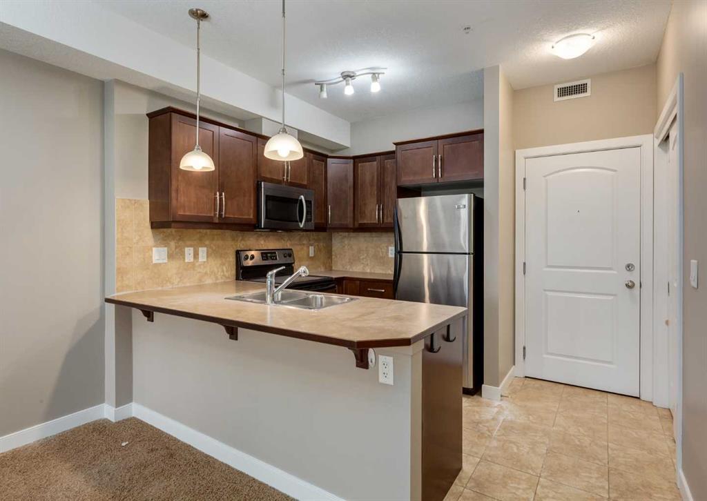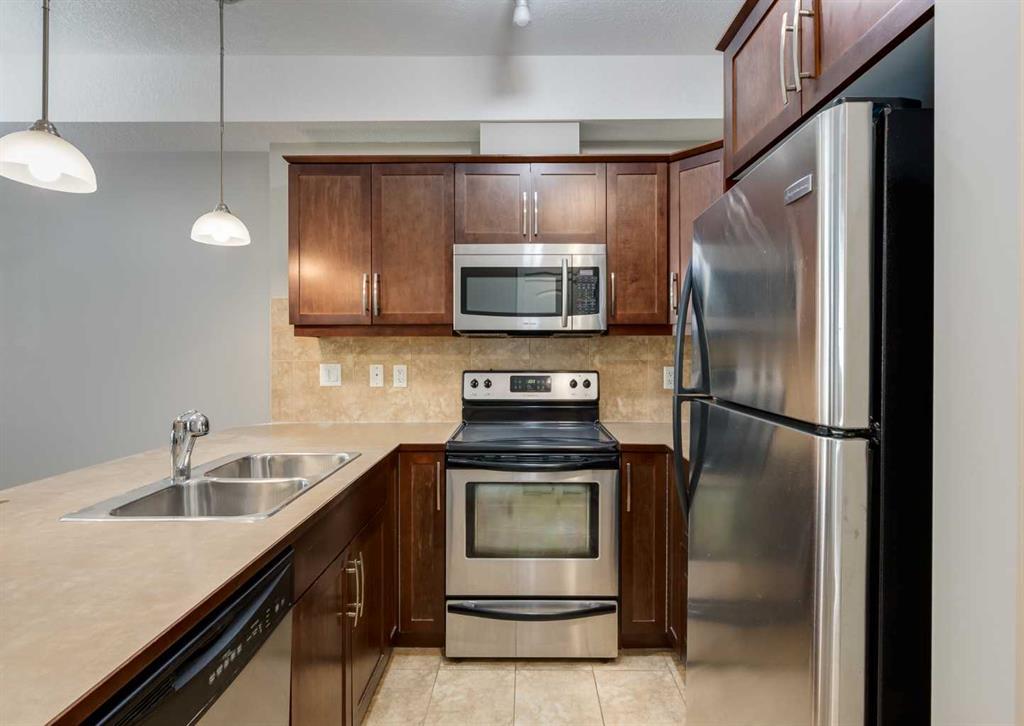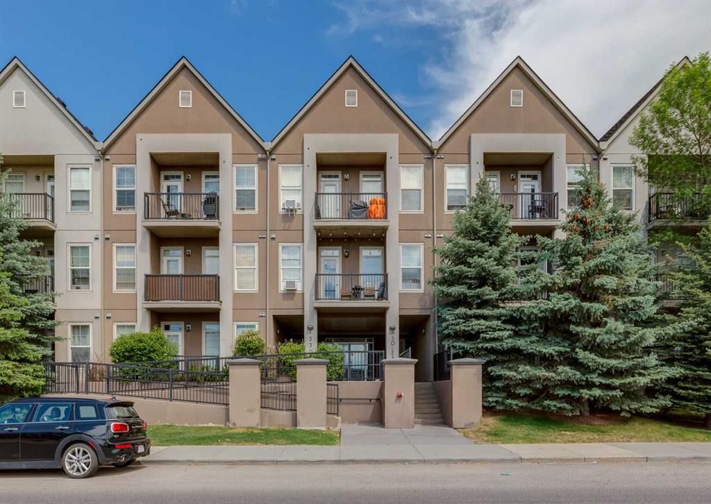 This move-in ready, 1 bedroom condo with a large balcony nestled amongst the trees is sure to impress. Ideally located within walking distance to schools, shops, restaurants, transit and the lake! An abundance of natural light graces the open and airy floor plan. The neutral kitchen invites culinary exploration featuring stainless steel appliances, a ton of cabinets and counter space plus a breakfast bar on the peninsula island to gather around. Centring the open concept space is the dining room with clear sightlines, perfect for entertaining. The living room invites relaxation or head out to the adjacent balcony and enjoy peaceful morning coffees and casual summer barbeques. The bedroom is spacious and bright and handily situated near the 4-piece bathroom. In-suite laundry, titled underground parking and additional visitor parking add to your comfort, safety and convenience. This wonderful home is in a much sought-after community with great schools, transit, endless amenities that include a variety of shops, restaurants and services plus the always popular lake offering swimming, boating, fishing, ice skating, firepits, sports courts, playgrounds and year-round activities. Outdoor enthusiasts will love that this community borders both Fish Creek Park and Sikome Lake plus takes advantage of the infinite amenities at Shawnessy’s shopping district, has direct access to McLeod trail and is close to everything! Truly a wonderful opportunity to own in one of Calgary’s premier lake communities! The monthly condo fees include all utilities except electricity plus lake access! (id:22211)