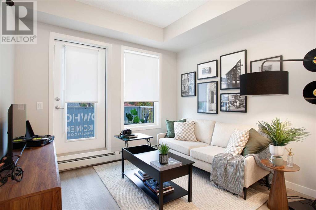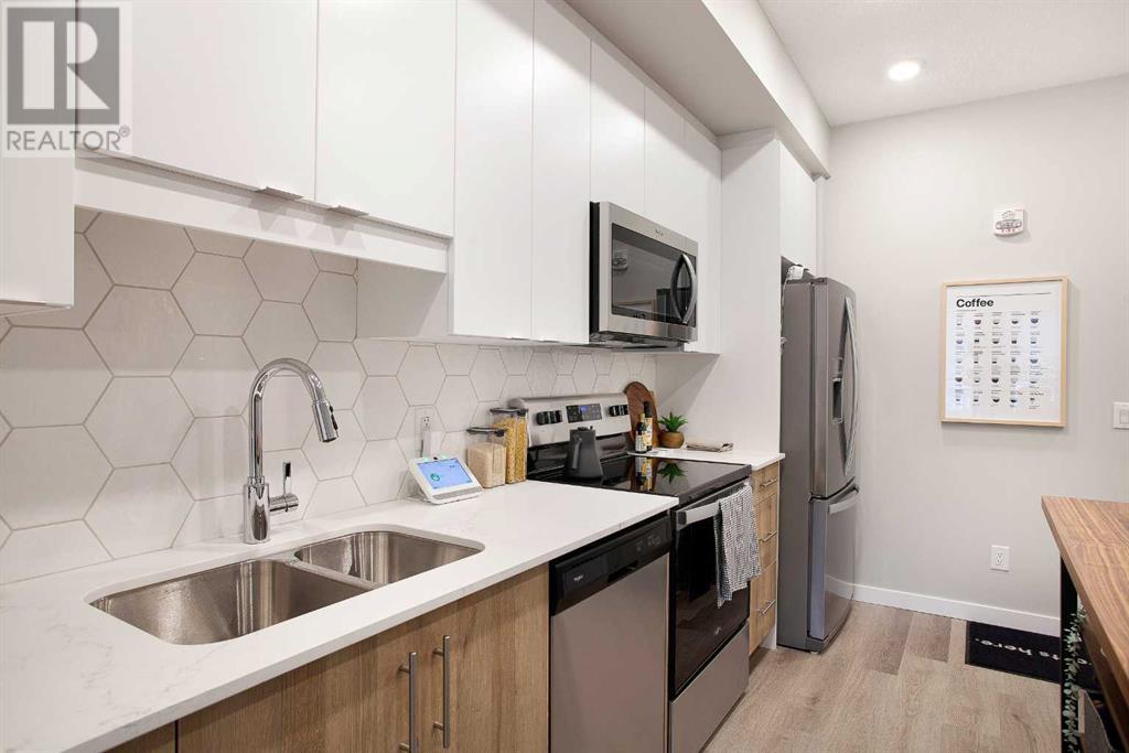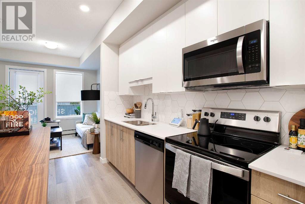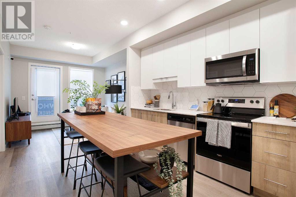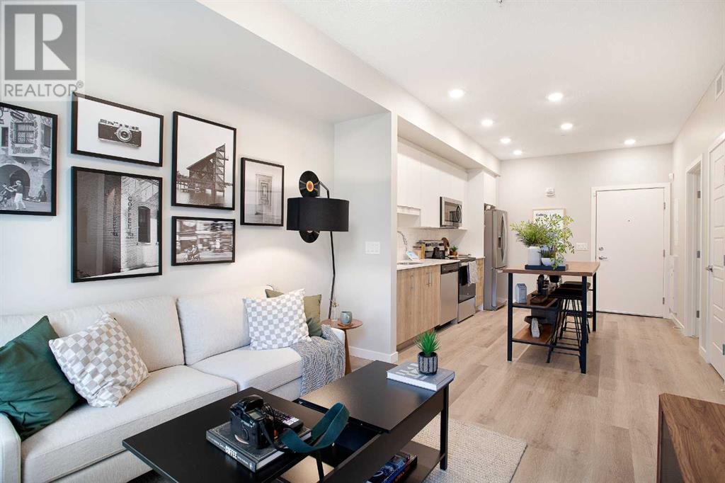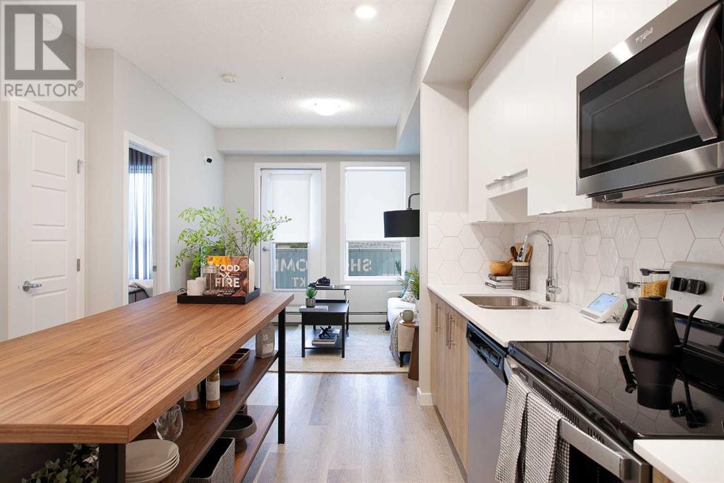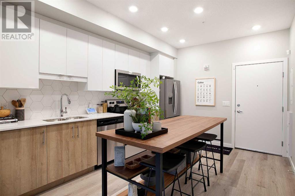 Looking for a luxurious living space in Calgary? Look no further than 103 1605 - 17th Street SE! This beautiful A1 home features a spacious 489 square feet of living space, one bedroom, and one bathroom, perfect for singles or couples.With possession available in Fall 2023, you can move in and start enjoying the luxury lifestyle. This north-facing home is located in a great location, close to all the amenities, including parks, shopping, downtown, and major roadways.As soon as you walk into the home, you will be greeted by 9-foot ceilings and large windows in both the living room and bedroom. The open concept design features a separate dining area and eating bar in the kitchen, with a large walk-in pantry for added convenience. The kitchen features dual-tone white and cassis slab cabinets, complemented by a stunning white Macchiato quartz countertop, and upgraded Whirlpool stainless appliances, including an OTR microwave, electric range, dishwasher, and fridge with French doors and a freezer bottom.The main living area boasts contemporary LVP flooring, and the backsplash in the kitchen is an upgraded white hexagon design. The master bedroom has a large walk-in closet and an ensuite, and also features a standard tub/shower unit in the main bathroom.This home also comes with upgraded lighting, including a ceiling fan in the master, and an upgraded white Whirlpool front-loader stackable washer and dryer.Assigned parking is available, and a storage locker is available for purchase. With condo fees of $241.55, this home is the perfect balance of comfort, convenience, and luxury. Don't miss out on this amazing opportunity, book your viewing today! READ SHOWINGTIME INSTRUCTIONS CAREFULLY AFTER BOOKING. (id:22211)