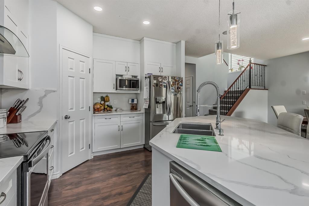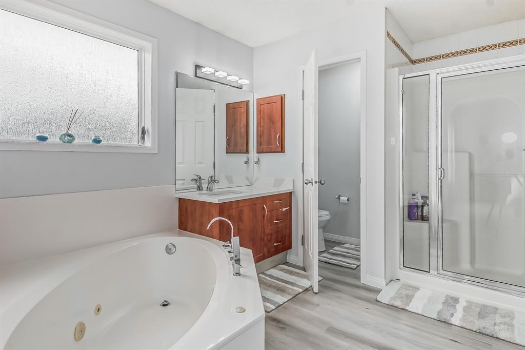 Nestled in a quiet cul-de-sac in Valley Ridge, is this lovely home with 3 + 1 bedrooms, 3.5 baths in over 2600 sq ft of fully developed living space. Easy maintenance landscaping on the large pie lot, fenced, west facing front exposure. The interior boasts an updated open floorplan with many recent upgrades done in the past couple of years including gorgeous dark laminate flooring, and 9 ft high ceilings. Main level includes a front den that can be used as a formal dining room or home office, a living room with gas fireplace, kitchen and breakfast nook. Updated white kitchen matched with exquisite quartz countertops and stainless steel appliances. A corner pantry and large centre island provides the ideal space to keep all your gadgets and spices. Vaulted ceilings cap the bonus room upstairs as the hallway leads to the 3 bedrooms and a main bath. Your primary bedroom has a 4 pc ensuite with a jacuzzi tub, separate shower, and walk-in closet. Finished basement offers the 4th bedroom and 3rd full bath, a recreation room and ample storage. East facing backyard has a lot of sun, deck and green space with lots of room to plant a garden. For the sports enthusiasts, Valley Ridge is home to Valley Ridge Golf Club, playgrounds and walking paths to and along the Bow River, soccer field, outdoor rink, and tennis courts, or a short drive to climbing centre and Winsport. A short drive to farmer’s market, CF Market Mall, Brentwood Mall, for all your shopping and dining needs. The area is designated to good schools which are nearby, public transit, and easy access to both TransCanada Hwy and Stoney Trail offers an easy commute out of town or to all your favourite Calgary hot spots. (id:22211)