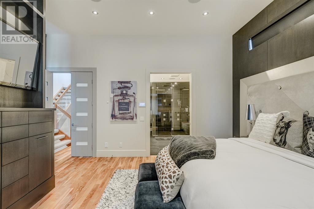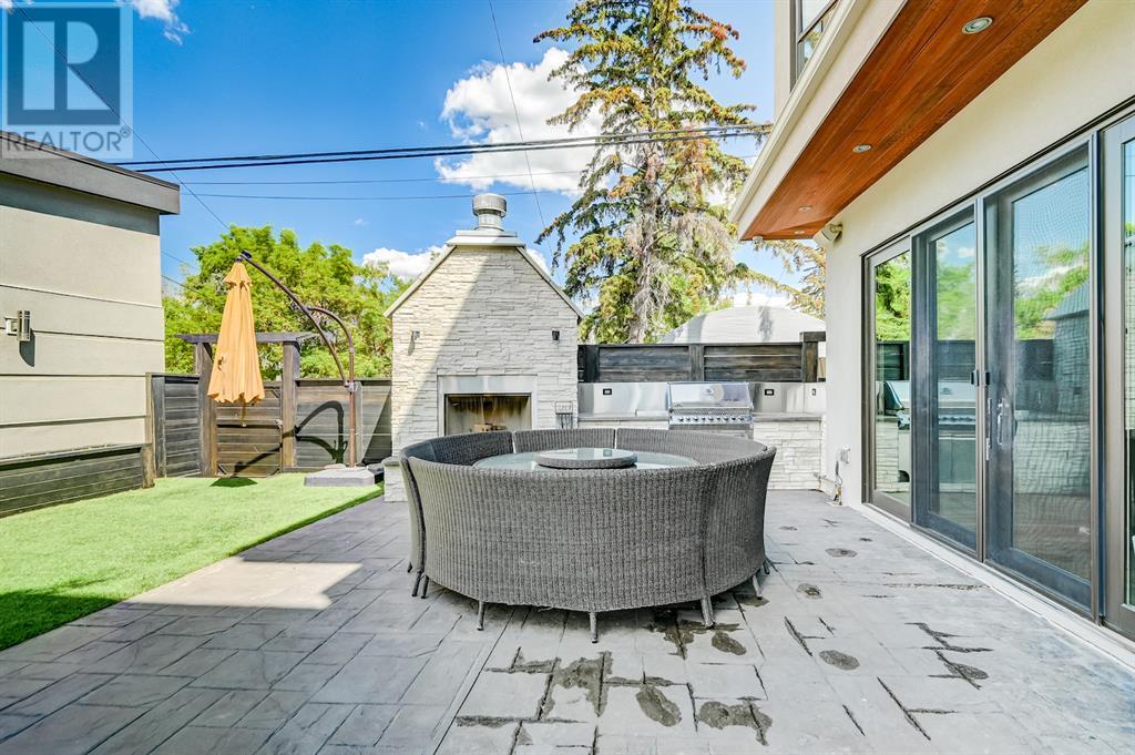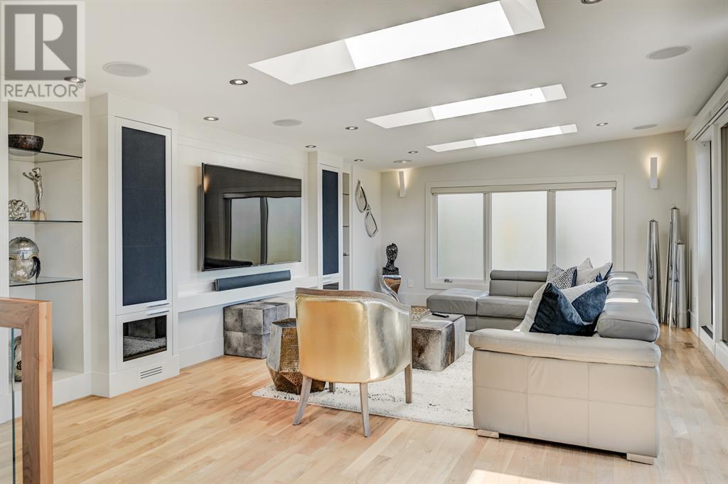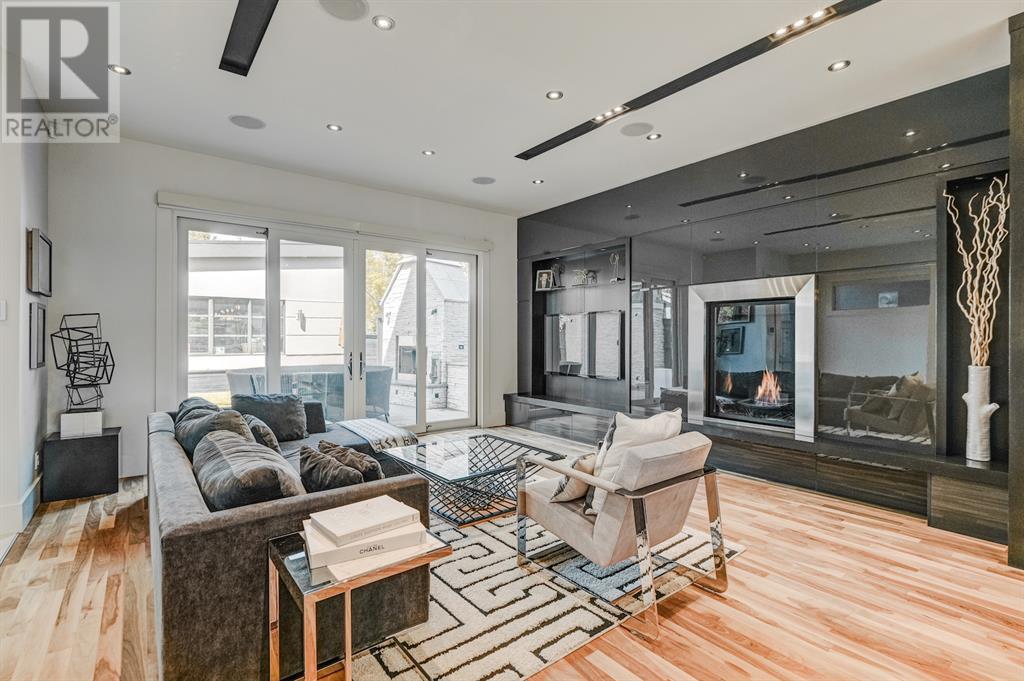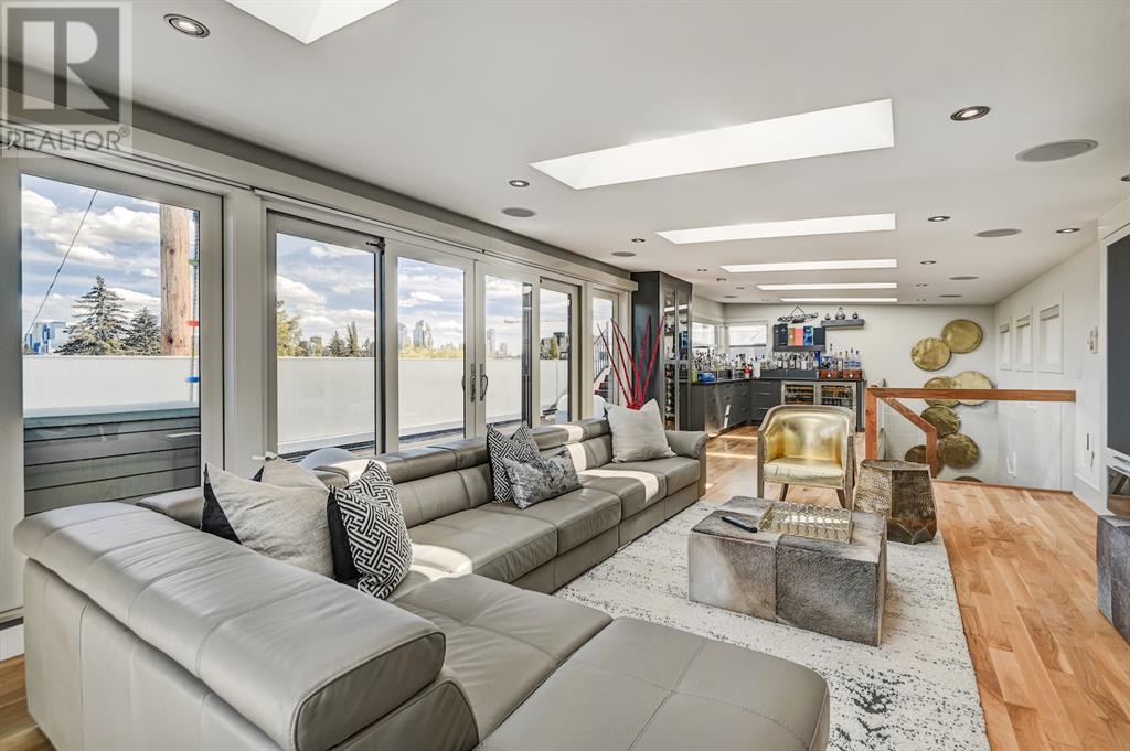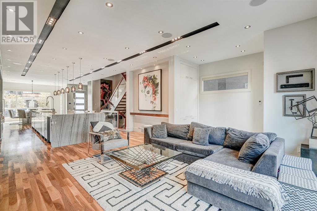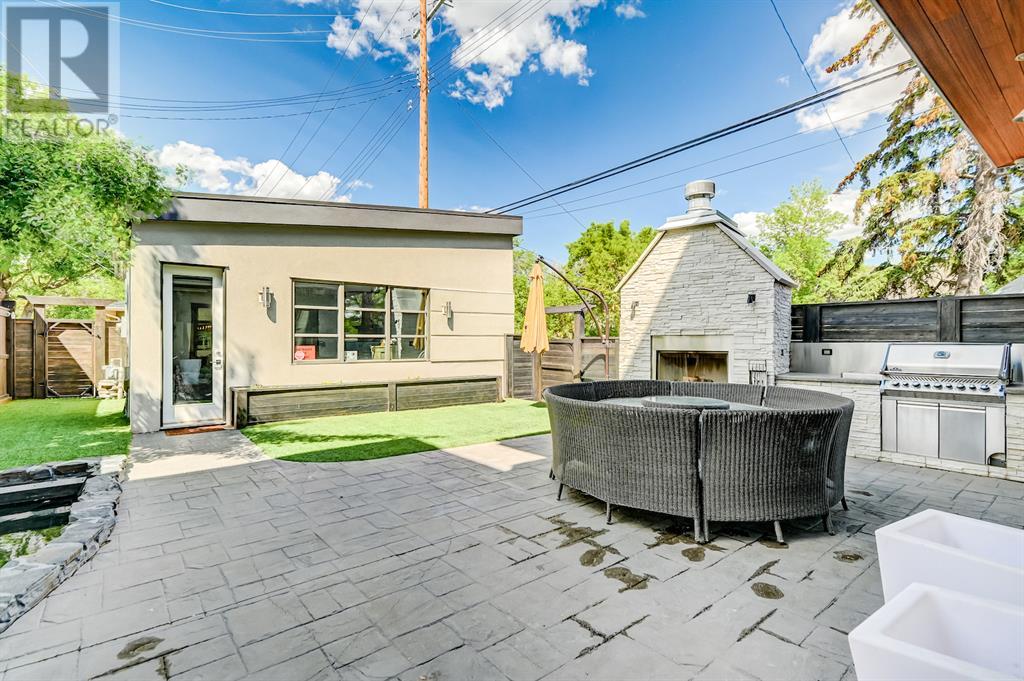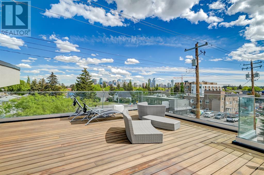 A tech lovers dream home! Showcasing over 4,370 sq ft of living space, this modern custom build by Urban Image Fine Homes presents this state of the art smart home with an Elan System that powers the homes lights, alarm/cameras, media, heating, fireplaces, and blinds. Inside you'll find soaring ceilings, heated tile flooring throughout, on site finished walnut floors, and an abundance of natural light. Centrally located and prime for entertaining is a dream kitchen with quartzite sone counters, ample cupboard space, high-end appliances including SubZero refrigerator, two Miele dishwashers, and Wolf Stove with double ovens, and an expansive 18' eat-up island. Flanking each side is the dining room with a concrete focal wall with gas fireplace and the living room with custom storage, media centre, and a second large gas fireplace. Glass rails and open riser stairs lead up to the second level where you are greeted with a stunning Swarovski Crystal light-up feature wall, laundry room, full bath and three generous bedrooms. The master bedroom is a sophisticated retreat with a phenomenal walk-in closet boasting motorized top cabinetry. A 7pc luxurious ensuite will take your breath away with a deep soaker tub that fills from the ceiling, his/her sinks, and an oversized glass enclosed steam shower with dual rainfall shower heads and body sprays. Venturing up to the third level loft you'll be in awe of all the skylights, bright open family room and wet bar with a custom wine bottle rack. Access the multi-tiered rooftop deck where you can unwind with a glass of wine by the wood burning fireplace as your take in the captivating downtown skyline. Fully developed lower with in-floor heat offers a fourth bedroom with cheater 3pc ensuite and a home gym space with mirrored walls. Step down into a sunken media room where you can enjoy family movies on the 3D projector. Your South exposed backyard is a serene oasis with a large patio space where you can entertain friends/family with y our built-in outdoor BBQ, or relax by the wood burning fireplace with a book while you're lulled by the outdoor feature waterfall. The front and back offer maintenance-free turf and raised garden beds. This one of a kind home was spared no expense and is located close to the trendy shops/eating of 19th street and trendy Kensington, and just a few minutes to the Bow River pathway system. Come see how exquisite this house truly is. (id:22211)