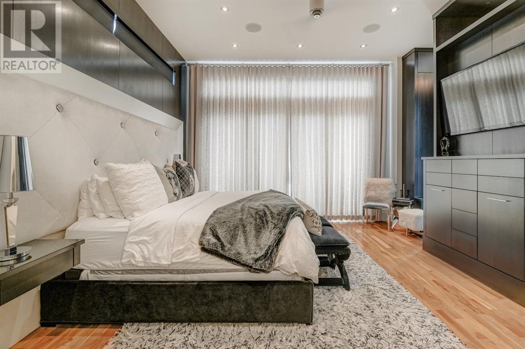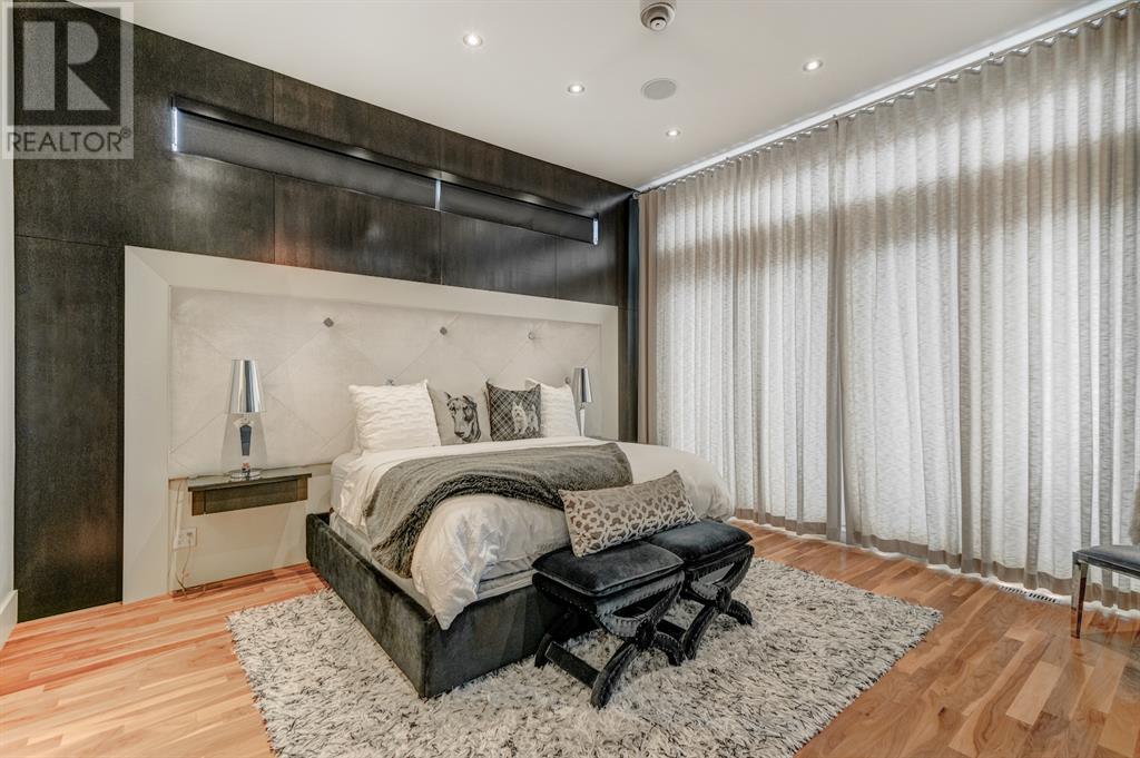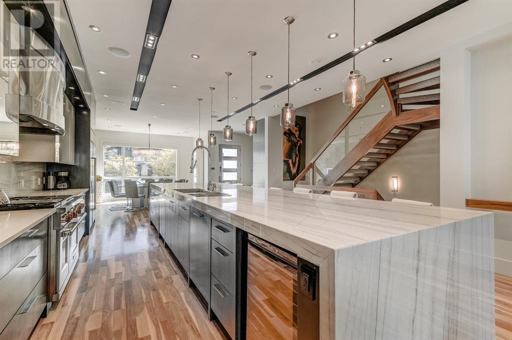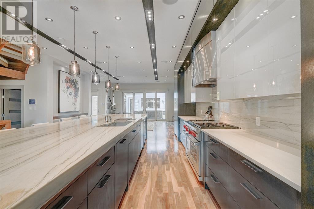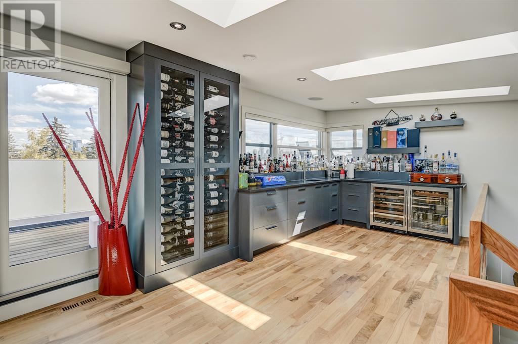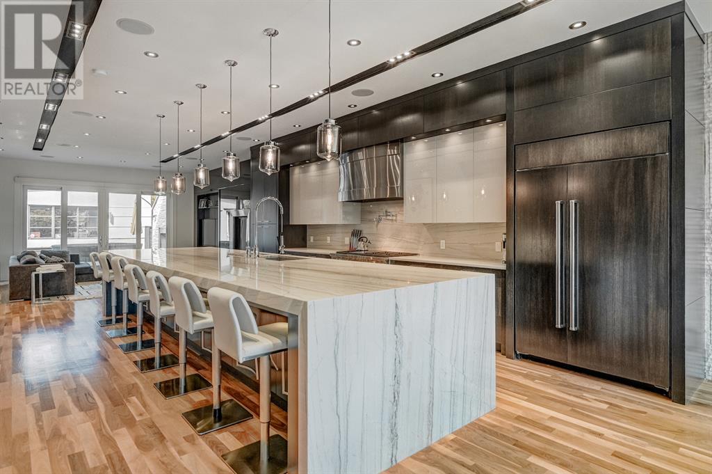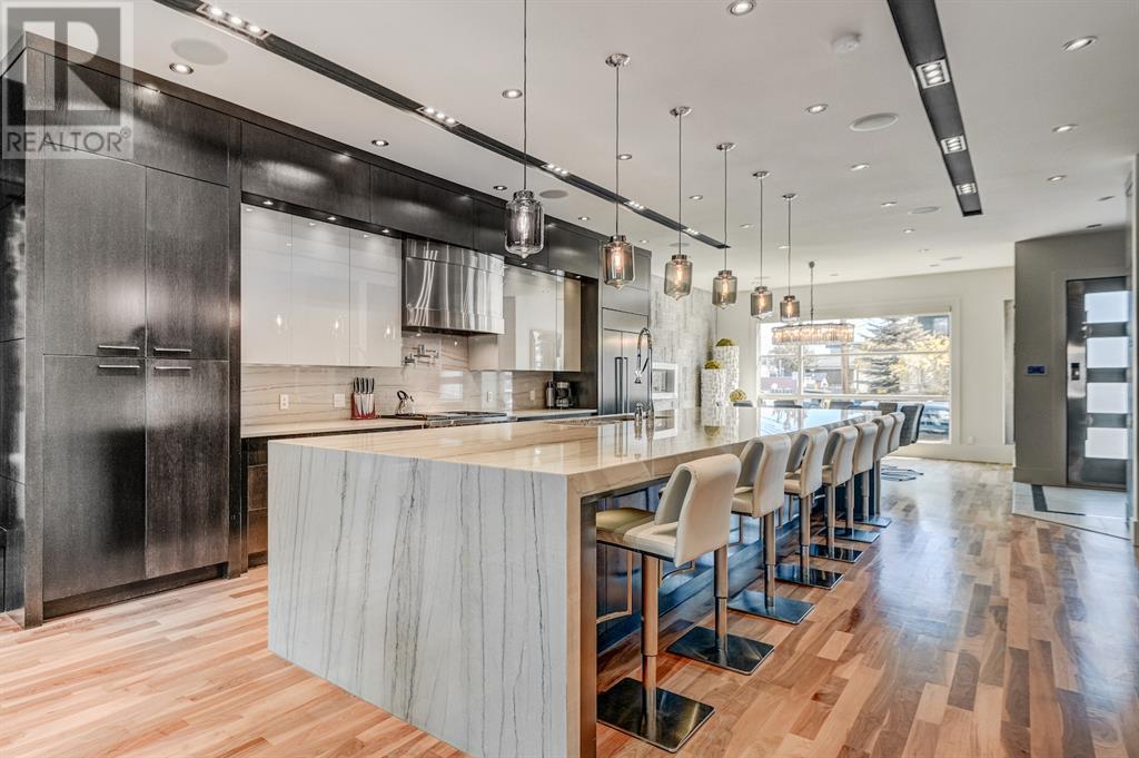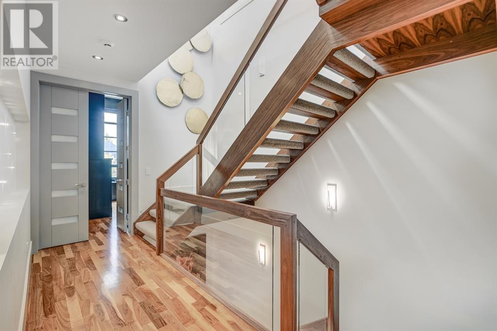 A tech lovers dream home! Showcasing over 4,370 sq ft of living space, this modern custom build by Urban Image Fine Homes presents this state of the art smart home with an Elan System that powers the homes lights, alarm/cameras, media, heating, fireplaces, and blinds. Inside you'll find soaring ceilings, heated tile flooring throughout, on site finished walnut floors, and an abundance of natural light. Centrally located and prime for entertaining is a dream kitchen with quartzite sone counters, ample cupboard space, high-end appliances including SubZero refrigerator, two Miele dishwashers, and Wolf Stove with double ovens, and an expansive 18' eat-up island. Flanking each side is the dining room with a concrete focal wall with gas fireplace and the living room with custom storage, media centre, and a second large gas fireplace. Glass rails and open riser stairs lead up to the second level where you are greeted with a stunning Swarovski Crystal light-up feature wall, laundry room, full bath and three generous bedrooms. The master bedroom is a sophisticated retreat with a phenomenal walk-in closet boasting motorized top cabinetry. A 7pc luxurious ensuite will take your breath away with a deep soaker tub that fills from the ceiling, his/her sinks, and an oversized glass enclosed steam shower with dual rainfall shower heads and body sprays. Venturing up to the third level loft you'll be in awe of all the skylights, bright open family room and wet bar with a custom wine bottle rack. Access the multi-tiered rooftop deck where you can unwind with a glass of wine by the wood burning fireplace as your take in the captivating downtown skyline. Fully developed lower with in-floor heat offers a fourth bedroom with cheater 3pc ensuite and a home gym space with mirrored walls. Step down into a sunken media room where you can enjoy family movies on the 3D projector. Your South exposed backyard is a serene oasis with a large patio space where you can entertain friends/family with y our built-in outdoor BBQ, or relax by the wood burning fireplace with a book while you're lulled by the outdoor feature waterfall. The front and back offer maintenance-free turf and raised garden beds. This one of a kind home was spared no expense and is located close to the trendy shops/eating of 19th street and trendy Kensington, and just a few minutes to the Bow River pathway system. Come see how exquisite this house truly is. (id:22211)