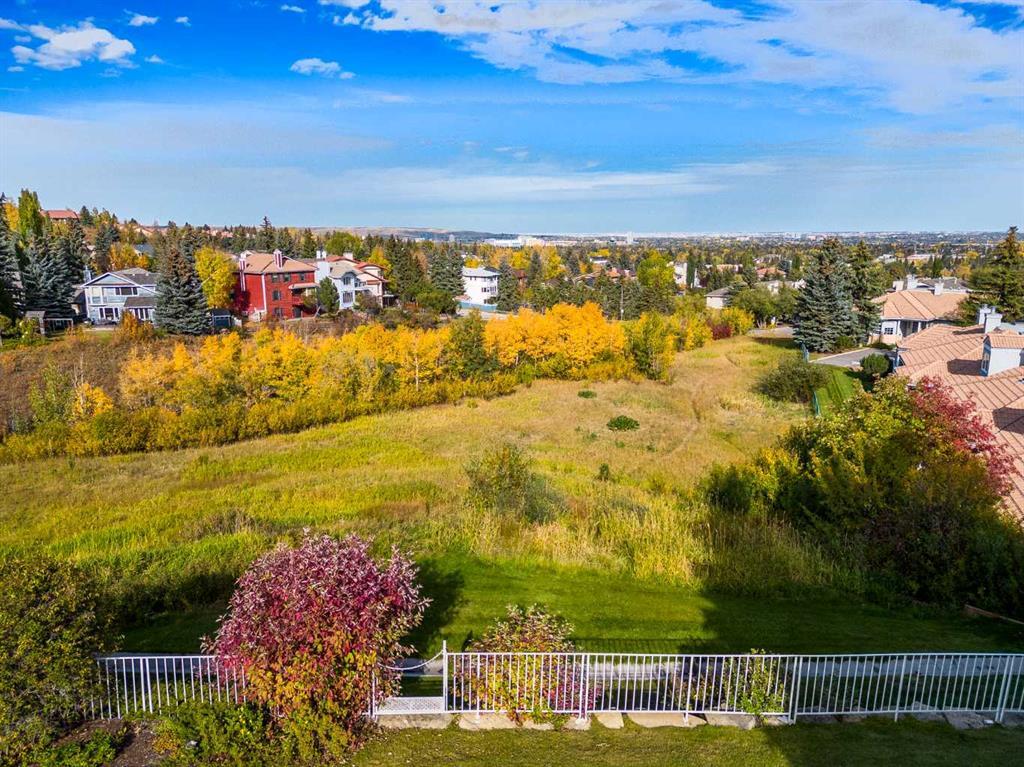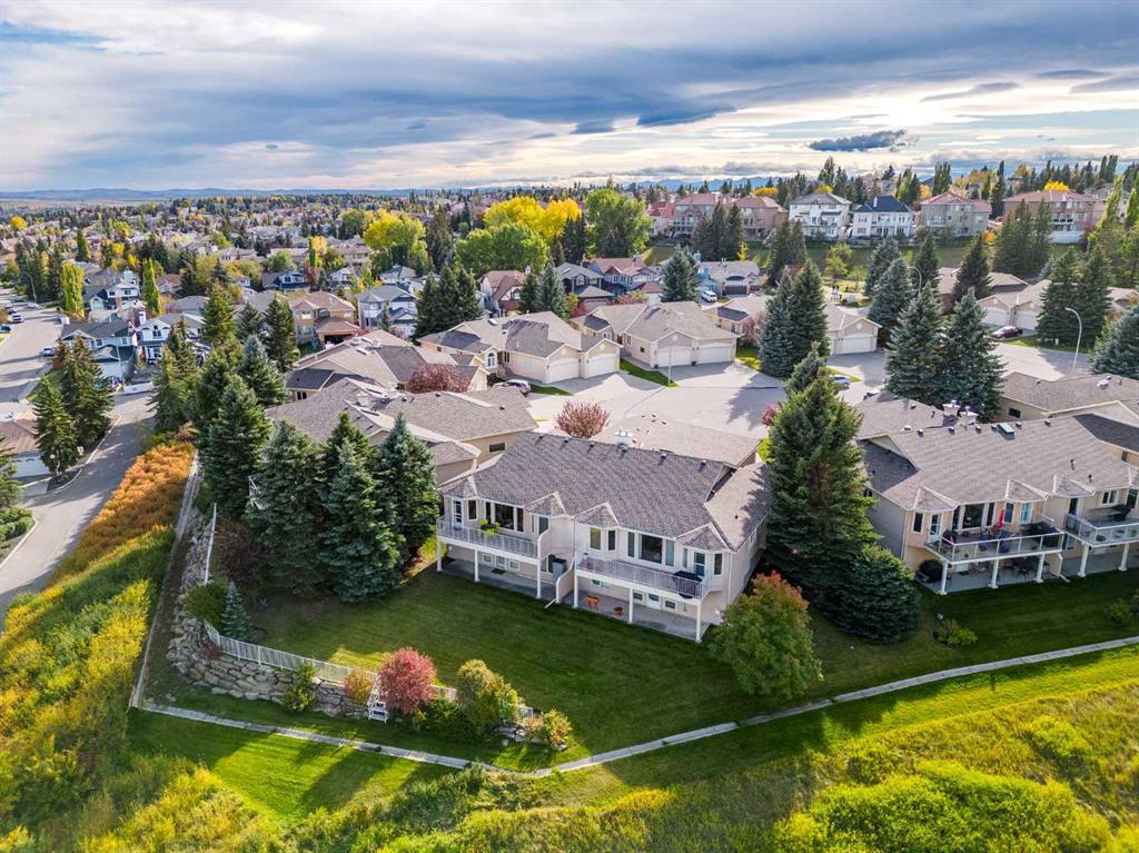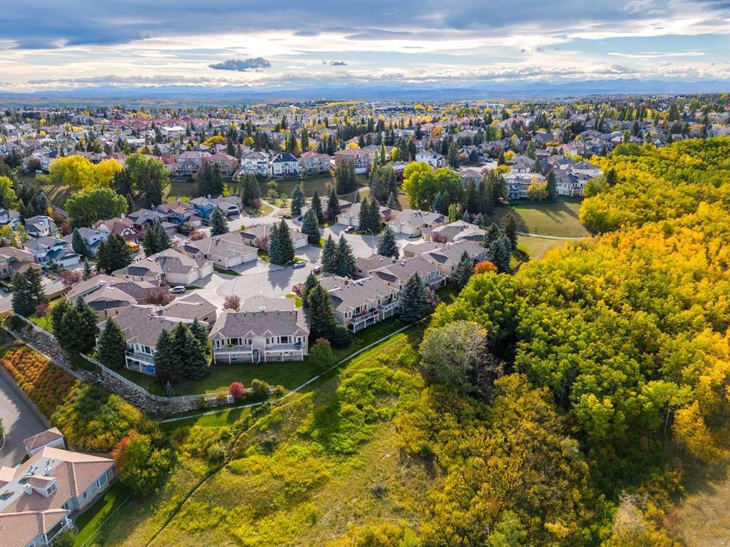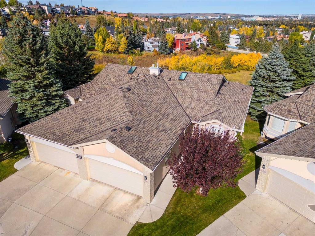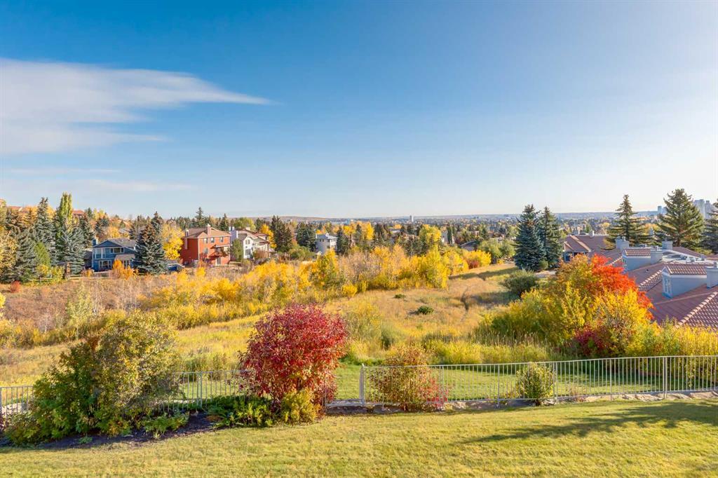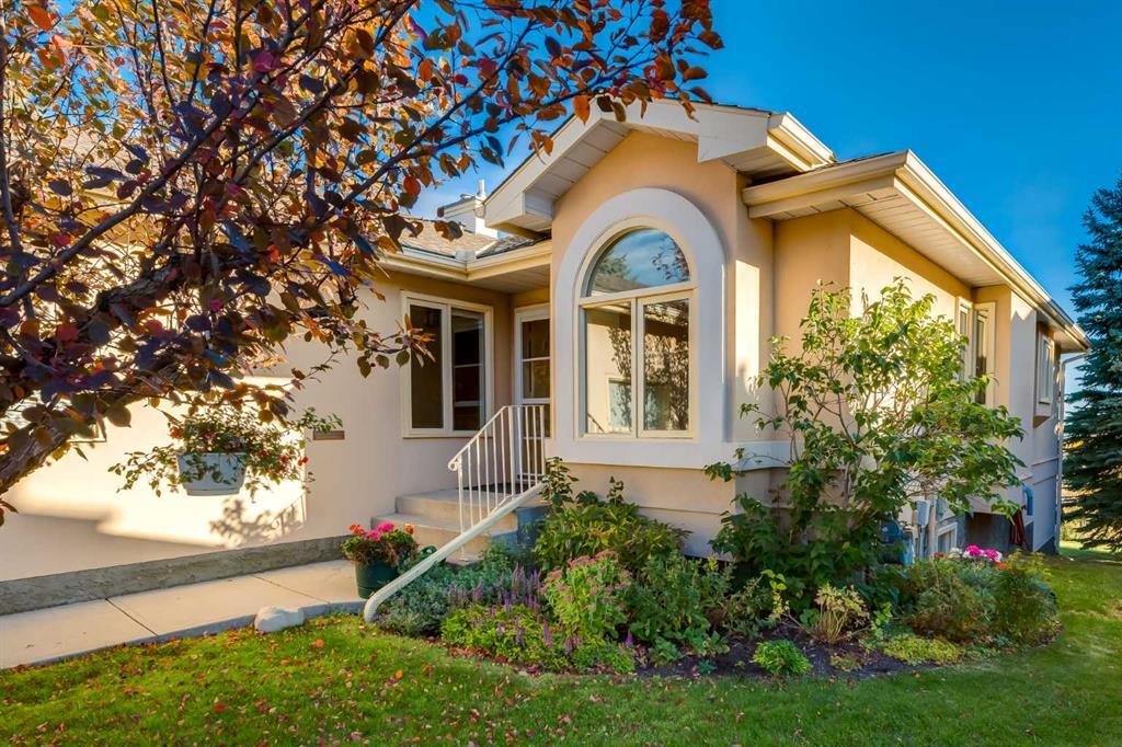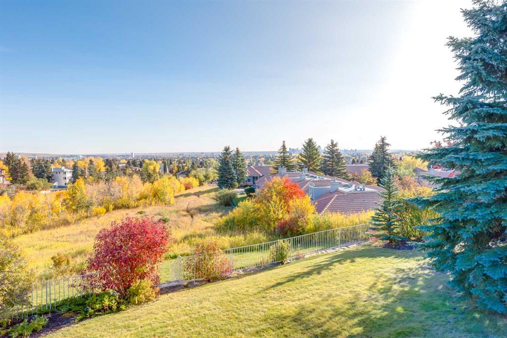 UNDER CONTRACT. This immaculate villa is nestled into a picturesque cul-de-sac location overlooking an environmental reserve. The setting is spectacular framed by mature bluffs of trees, the city skyline to the East, and walking paths galore. Located just five minutes from the Sunterra market shopping centre, Aspen Landing, West Side Rec Centre, the C-Train station and West Hills shopping, the amenities are plentiful. Upon your arrival, you are immediately greeted by the flower gardens the existing owner so lovingly planted on the Southeast side of the house. As you enter the front door, you find gleaming hardwood flooring, vaulted ceilings and a lovely living room and dining area. The family room next to the kitchen has incredible peaceful views of the valley set in behind and is open to the sunny breakfast nook area. The country kitchen features a five-burner electric stove with a convection oven, a KitchenAid stainless steel refrigerator, a Miele dishwasher, and extensive oak cabinetry. A window is set over the sink area and is the perfect spot for your pots of herbs. The primary suite is very spacious and has a bay window overlooking the views to the North and East. The adjoining ensuite has a jetted bathtub, vanity and high ceilings. To complete the main floor is a separate den, a large laundry room with a Bosch washer/dryer and a powder room. The laundry room also features an extra refrigerator. The garage is heated with in-floor radiant heating and boasts apoxy flooring, has a freezer and a built-in storage pull-out under the stairs. The walk-out lower level has a large family room with a cozy gas fireplace, another bedroom, a full bathroom, a former woodworking shop area, and extensive undeveloped space. This is one of the largest lots in the entire development in the absolute best location! Note: This villa has a new roof and a new hot water tank. The HOA Fee includes landscaping, tree pruning, lawn maintenance, snow removal and irrigation maintenance. (id:22211)