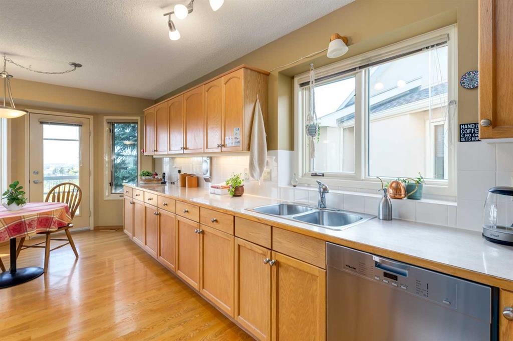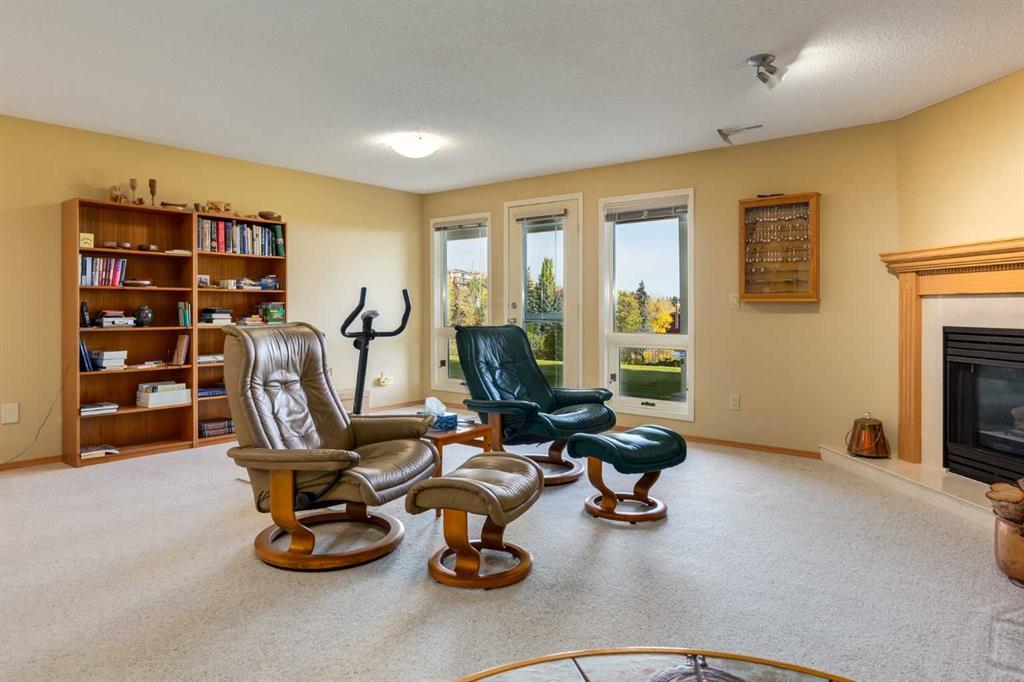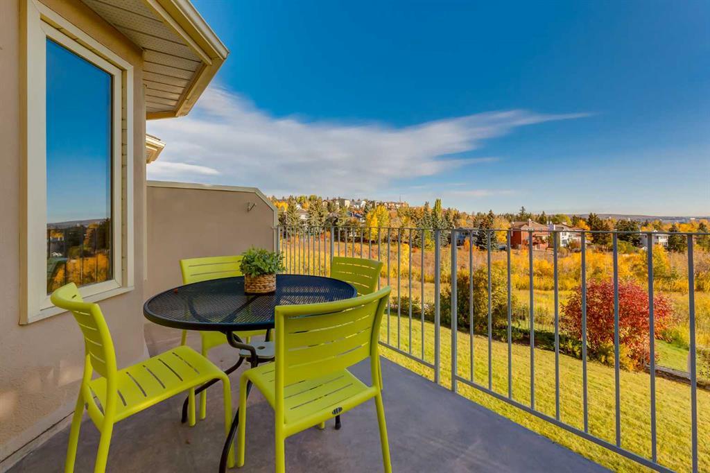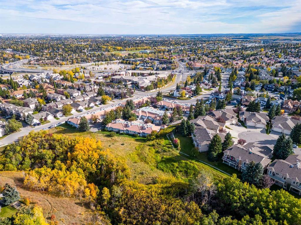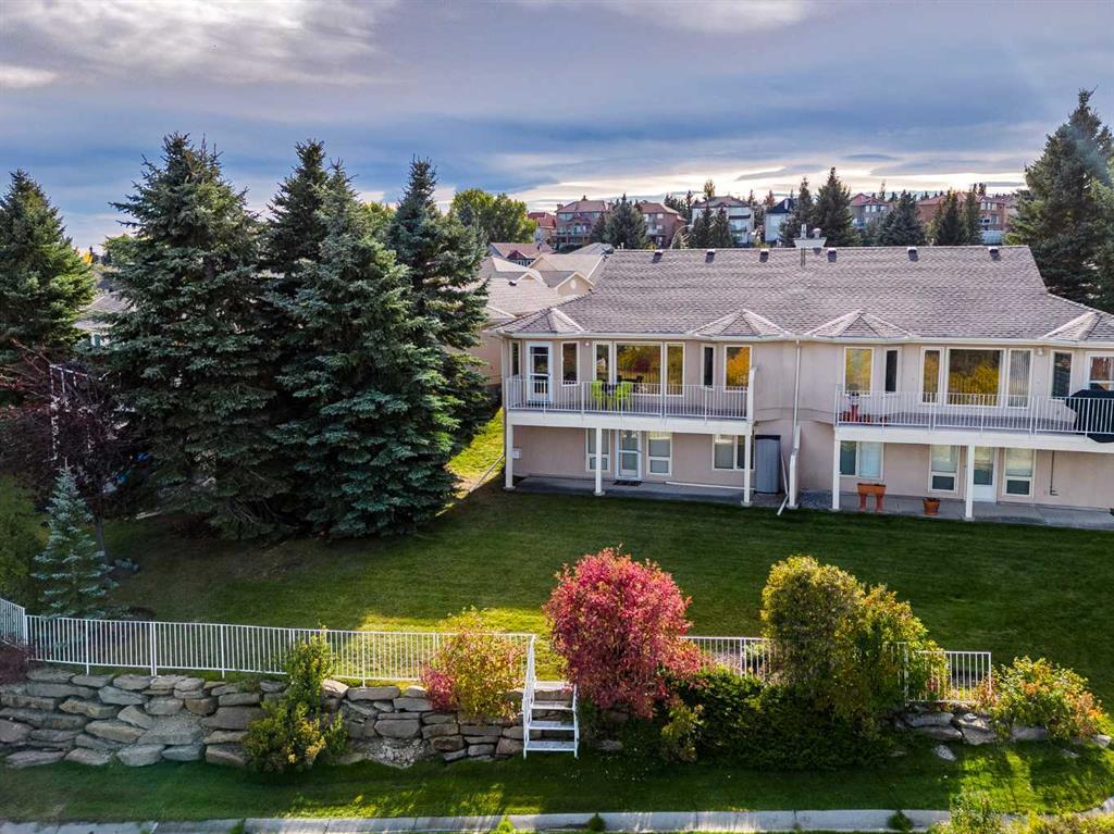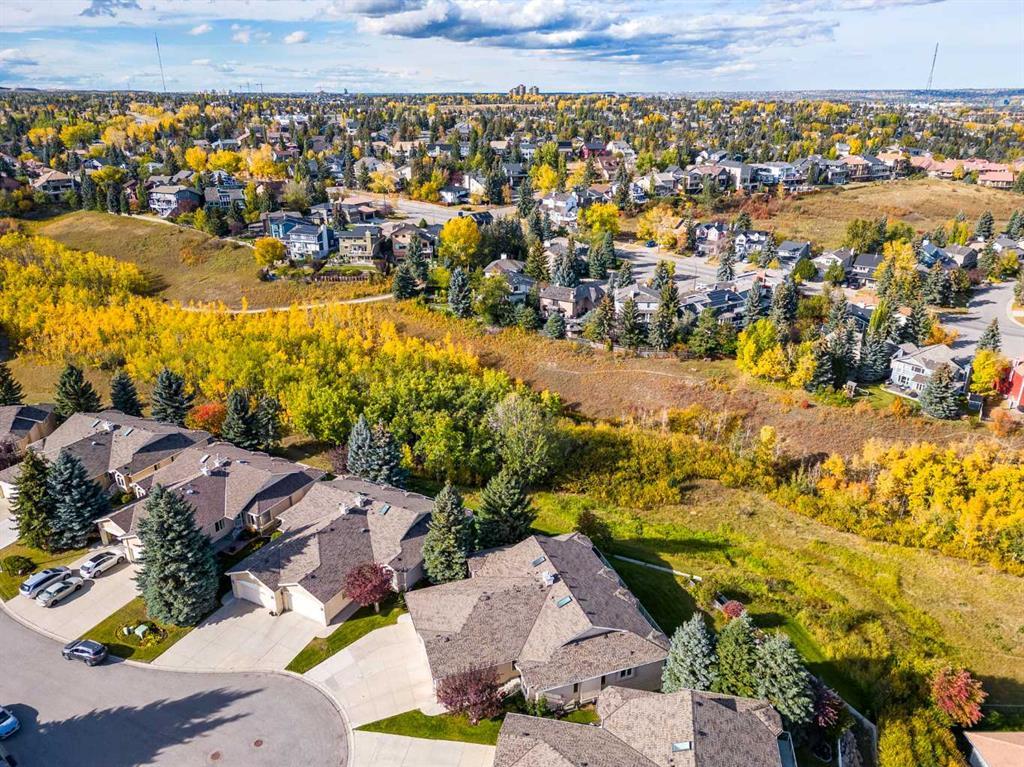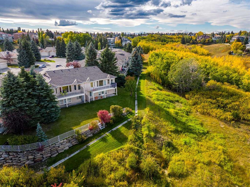 UNDER CONTRACT. This immaculate villa is nestled into a picturesque cul-de-sac location overlooking an environmental reserve. The setting is spectacular framed by mature bluffs of trees, the city skyline to the East, and walking paths galore. Located just five minutes from the Sunterra market shopping centre, Aspen Landing, West Side Rec Centre, the C-Train station and West Hills shopping, the amenities are plentiful. Upon your arrival, you are immediately greeted by the flower gardens the existing owner so lovingly planted on the Southeast side of the house. As you enter the front door, you find gleaming hardwood flooring, vaulted ceilings and a lovely living room and dining area. The family room next to the kitchen has incredible peaceful views of the valley set in behind and is open to the sunny breakfast nook area. The country kitchen features a five-burner electric stove with a convection oven, a KitchenAid stainless steel refrigerator, a Miele dishwasher, and extensive oak cabinetry. A window is set over the sink area and is the perfect spot for your pots of herbs. The primary suite is very spacious and has a bay window overlooking the views to the North and East. The adjoining ensuite has a jetted bathtub, vanity and high ceilings. To complete the main floor is a separate den, a large laundry room with a Bosch washer/dryer and a powder room. The laundry room also features an extra refrigerator. The garage is heated with in-floor radiant heating and boasts apoxy flooring, has a freezer and a built-in storage pull-out under the stairs. The walk-out lower level has a large family room with a cozy gas fireplace, another bedroom, a full bathroom, a former woodworking shop area, and extensive undeveloped space. This is one of the largest lots in the entire development in the absolute best location! Note: This villa has a new roof and a new hot water tank. The HOA Fee includes landscaping, tree pruning, lawn maintenance, snow removal and irrigation maintenance. (id:22211)