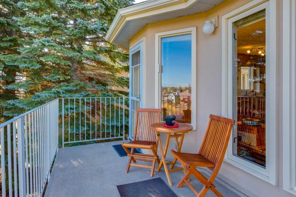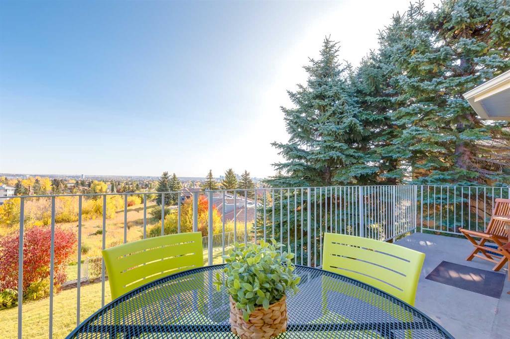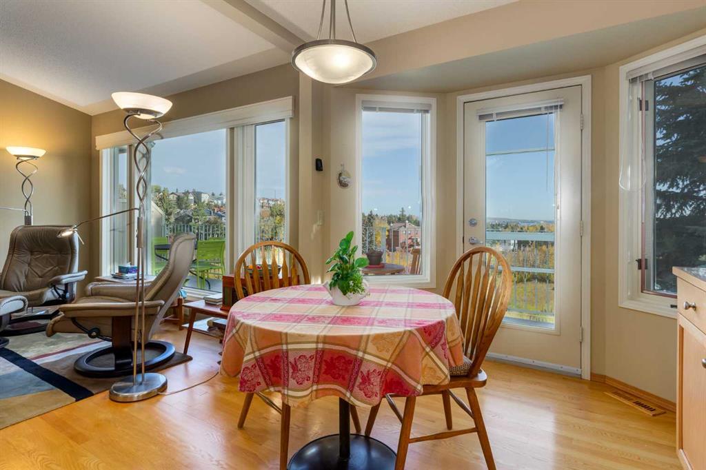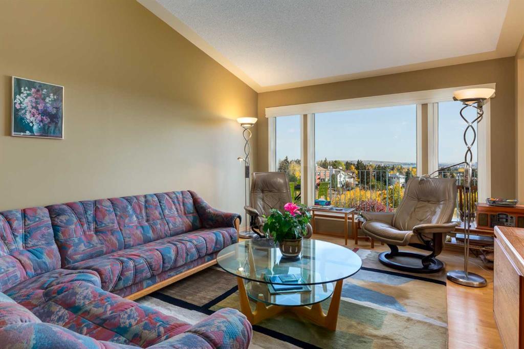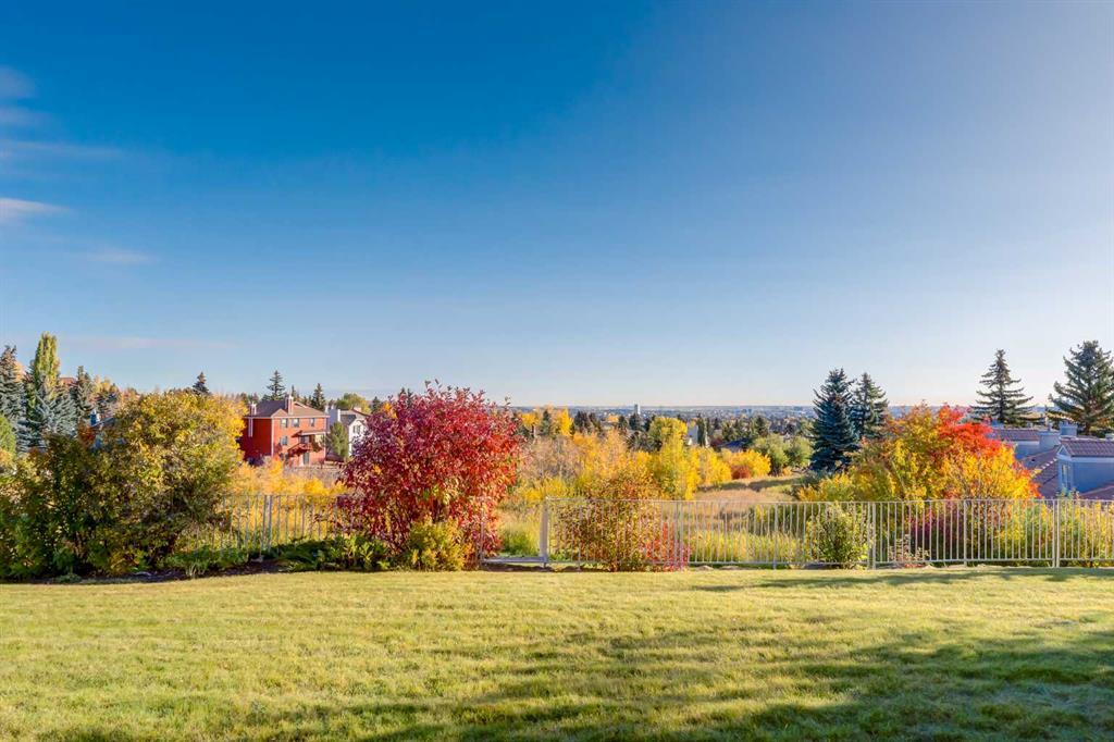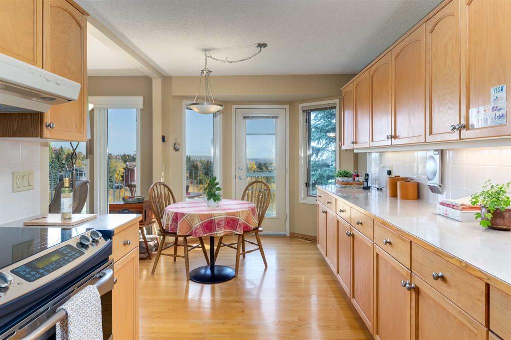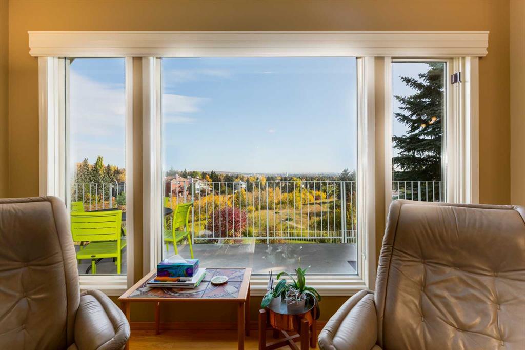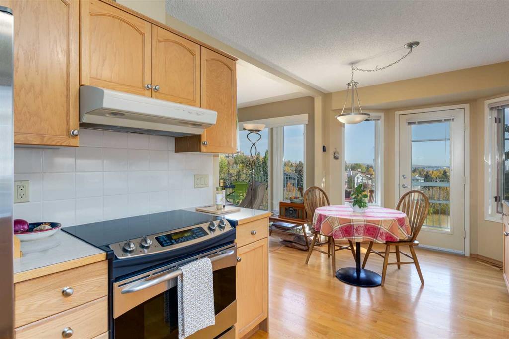 UNDER CONTRACT. This immaculate villa is nestled into a picturesque cul-de-sac location overlooking an environmental reserve. The setting is spectacular framed by mature bluffs of trees, the city skyline to the East, and walking paths galore. Located just five minutes from the Sunterra market shopping centre, Aspen Landing, West Side Rec Centre, the C-Train station and West Hills shopping, the amenities are plentiful. Upon your arrival, you are immediately greeted by the flower gardens the existing owner so lovingly planted on the Southeast side of the house. As you enter the front door, you find gleaming hardwood flooring, vaulted ceilings and a lovely living room and dining area. The family room next to the kitchen has incredible peaceful views of the valley set in behind and is open to the sunny breakfast nook area. The country kitchen features a five-burner electric stove with a convection oven, a KitchenAid stainless steel refrigerator, a Miele dishwasher, and extensive oak cabinetry. A window is set over the sink area and is the perfect spot for your pots of herbs. The primary suite is very spacious and has a bay window overlooking the views to the North and East. The adjoining ensuite has a jetted bathtub, vanity and high ceilings. To complete the main floor is a separate den, a large laundry room with a Bosch washer/dryer and a powder room. The laundry room also features an extra refrigerator. The garage is heated with in-floor radiant heating and boasts apoxy flooring, has a freezer and a built-in storage pull-out under the stairs. The walk-out lower level has a large family room with a cozy gas fireplace, another bedroom, a full bathroom, a former woodworking shop area, and extensive undeveloped space. This is one of the largest lots in the entire development in the absolute best location! Note: This villa has a new roof and a new hot water tank. The HOA Fee includes landscaping, tree pruning, lawn maintenance, snow removal and irrigation maintenance. (id:22211)