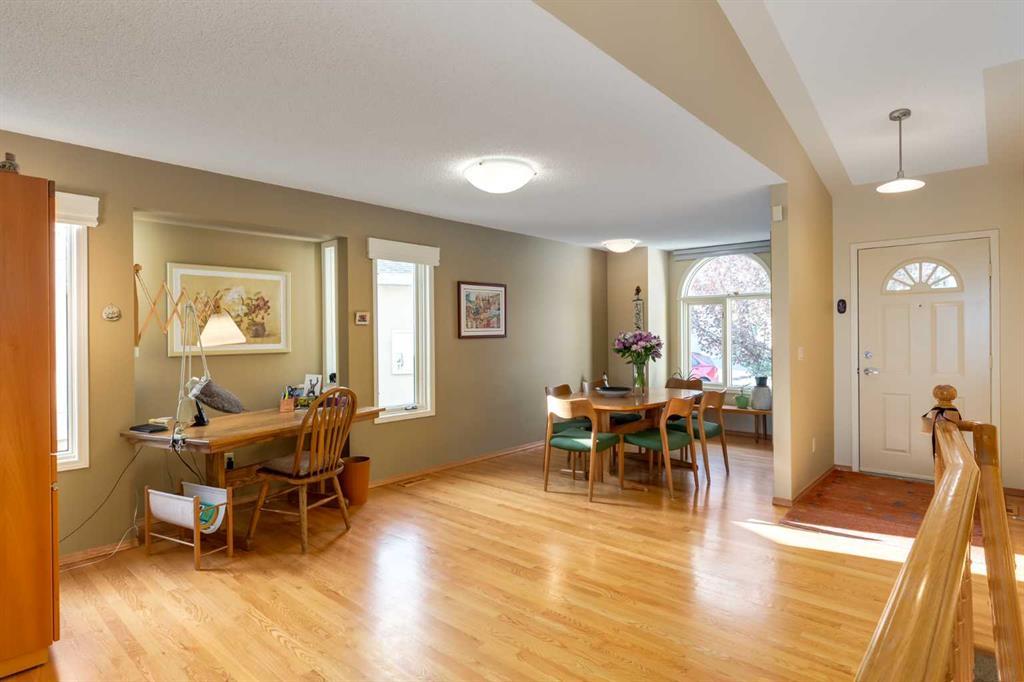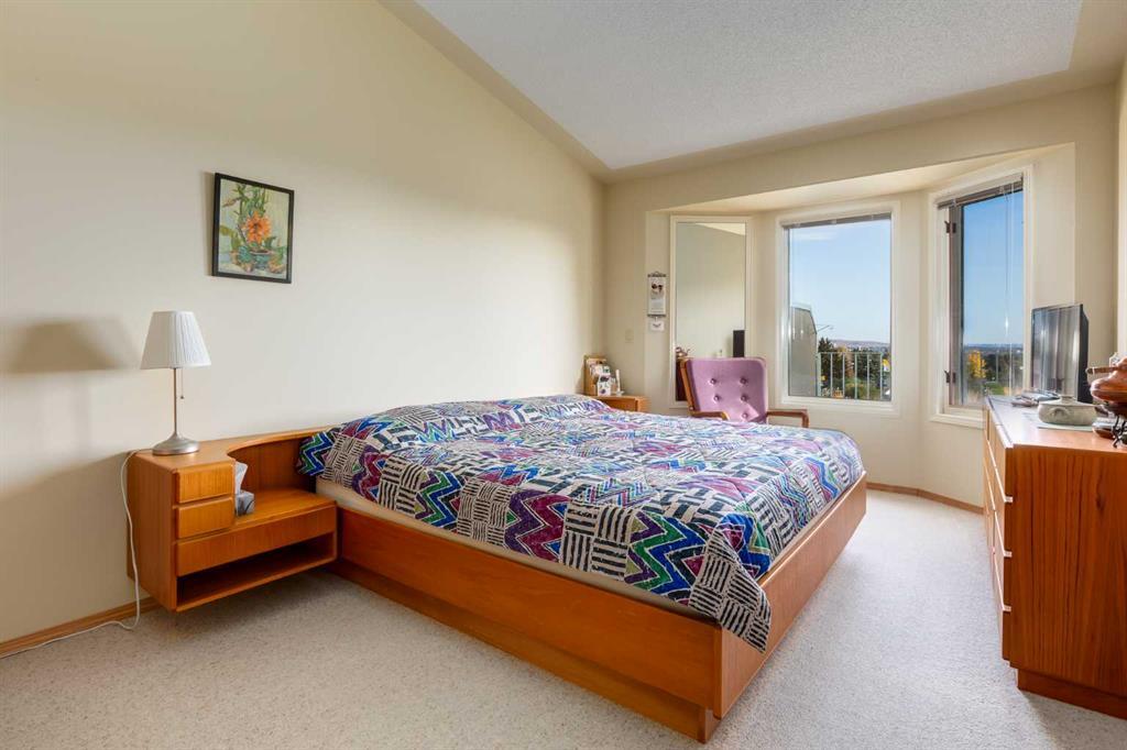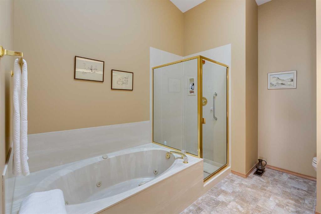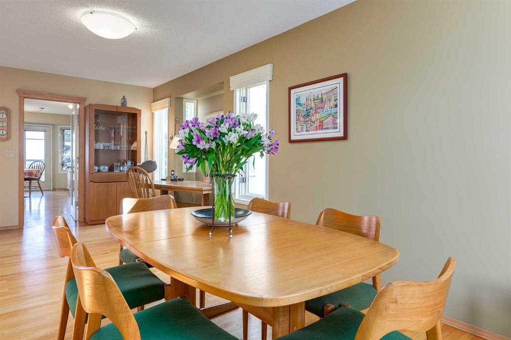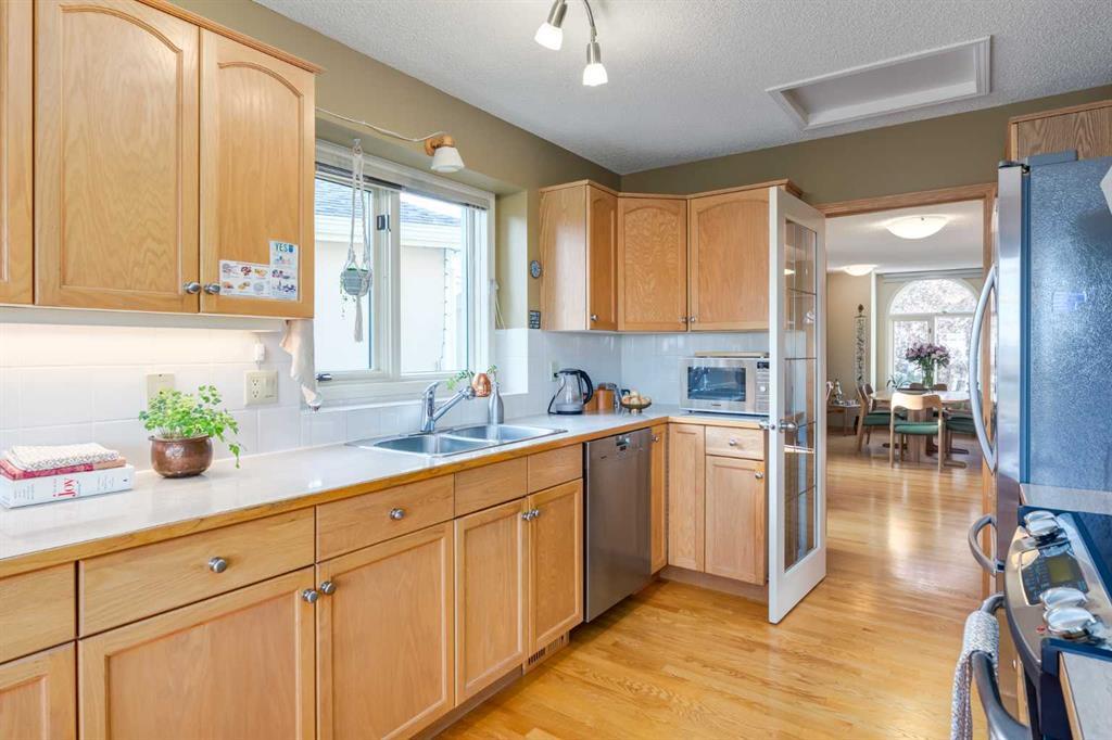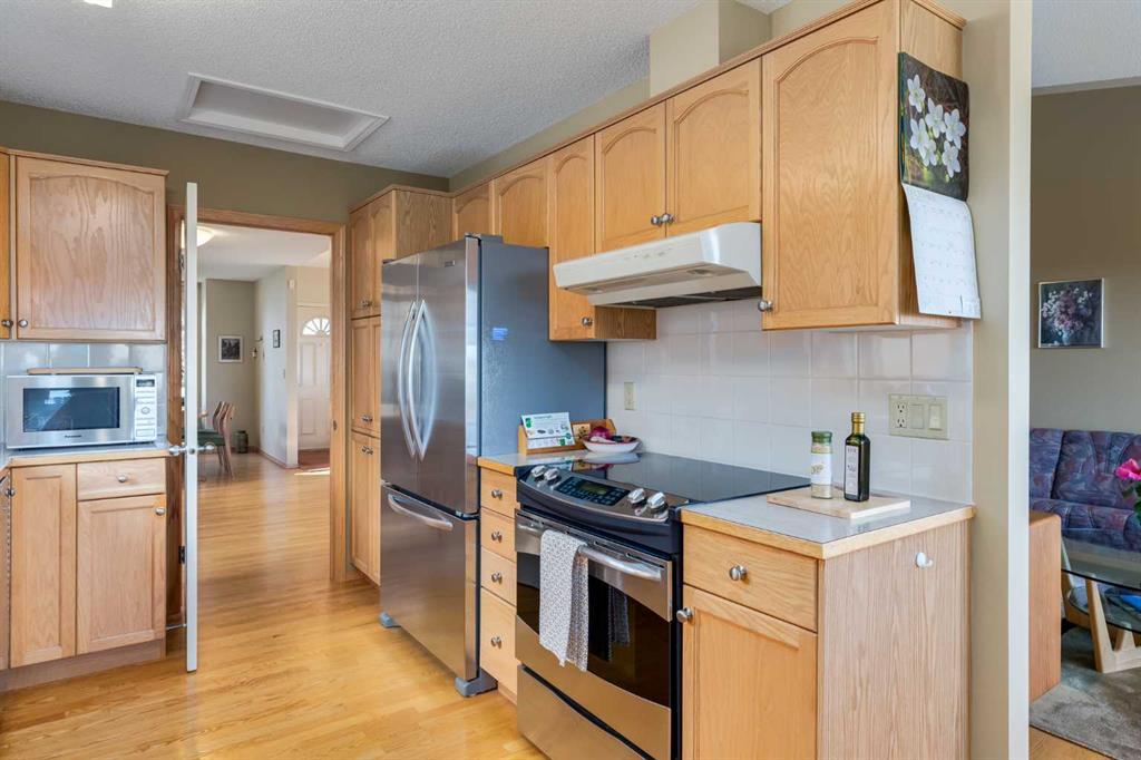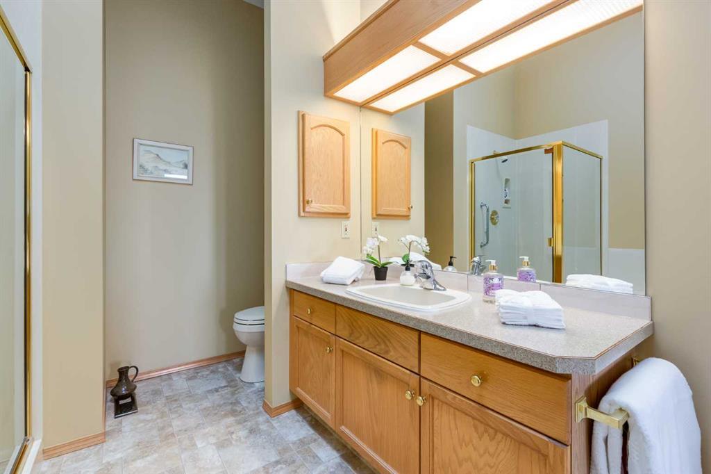 UNDER CONTRACT. This immaculate villa is nestled into a picturesque cul-de-sac location overlooking an environmental reserve. The setting is spectacular framed by mature bluffs of trees, the city skyline to the East, and walking paths galore. Located just five minutes from the Sunterra market shopping centre, Aspen Landing, West Side Rec Centre, the C-Train station and West Hills shopping, the amenities are plentiful. Upon your arrival, you are immediately greeted by the flower gardens the existing owner so lovingly planted on the Southeast side of the house. As you enter the front door, you find gleaming hardwood flooring, vaulted ceilings and a lovely living room and dining area. The family room next to the kitchen has incredible peaceful views of the valley set in behind and is open to the sunny breakfast nook area. The country kitchen features a five-burner electric stove with a convection oven, a KitchenAid stainless steel refrigerator, a Miele dishwasher, and extensive oak cabinetry. A window is set over the sink area and is the perfect spot for your pots of herbs. The primary suite is very spacious and has a bay window overlooking the views to the North and East. The adjoining ensuite has a jetted bathtub, vanity and high ceilings. To complete the main floor is a separate den, a large laundry room with a Bosch washer/dryer and a powder room. The laundry room also features an extra refrigerator. The garage is heated with in-floor radiant heating and boasts apoxy flooring, has a freezer and a built-in storage pull-out under the stairs. The walk-out lower level has a large family room with a cozy gas fireplace, another bedroom, a full bathroom, a former woodworking shop area, and extensive undeveloped space. This is one of the largest lots in the entire development in the absolute best location! Note: This villa has a new roof and a new hot water tank. The HOA Fee includes landscaping, tree pruning, lawn maintenance, snow removal and irrigation maintenance. (id:22211)