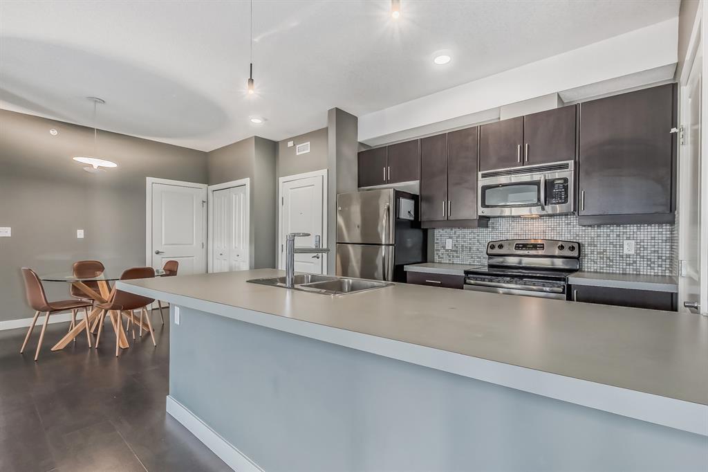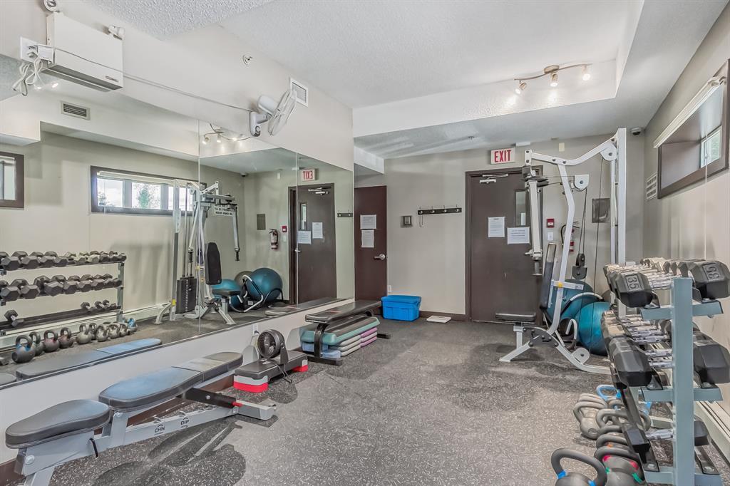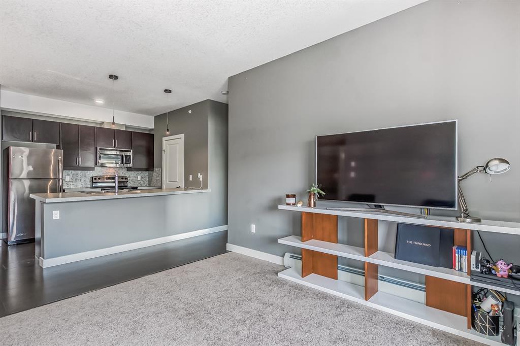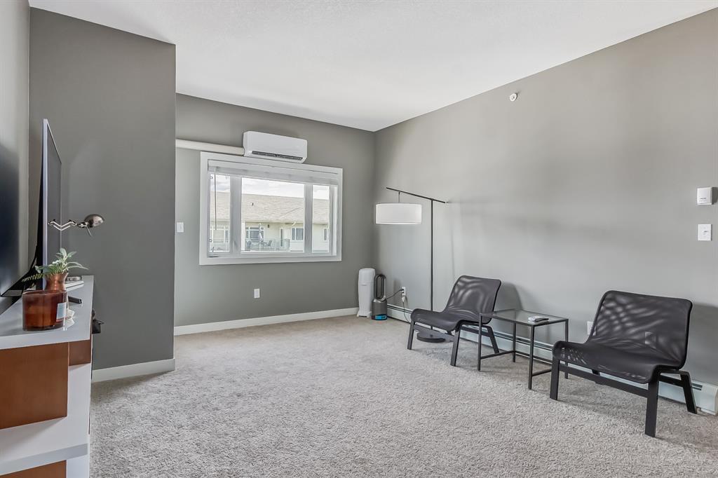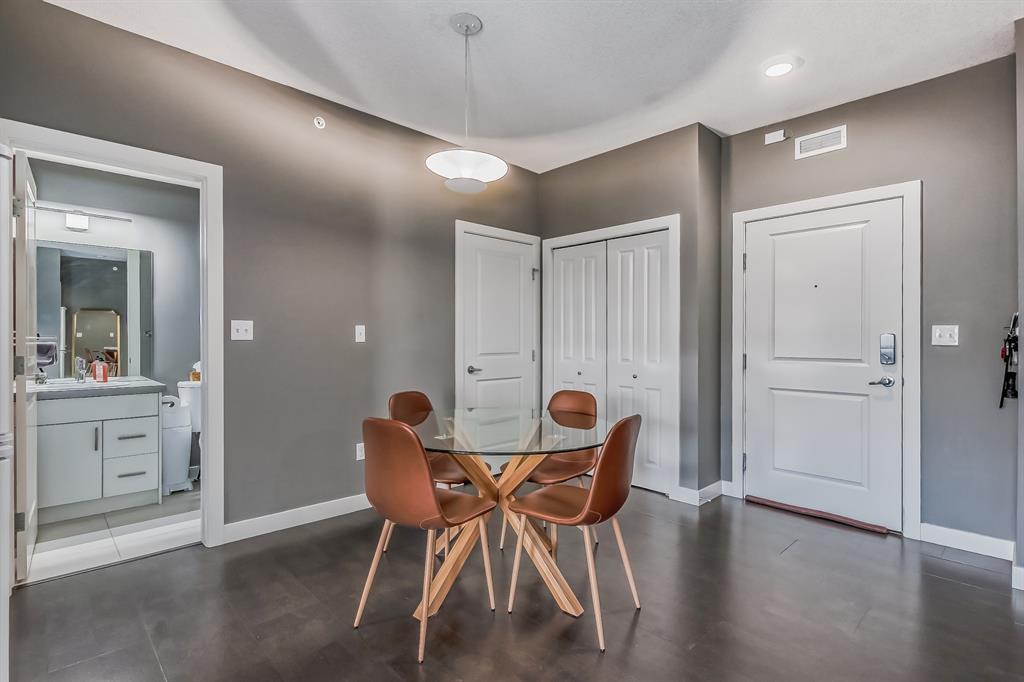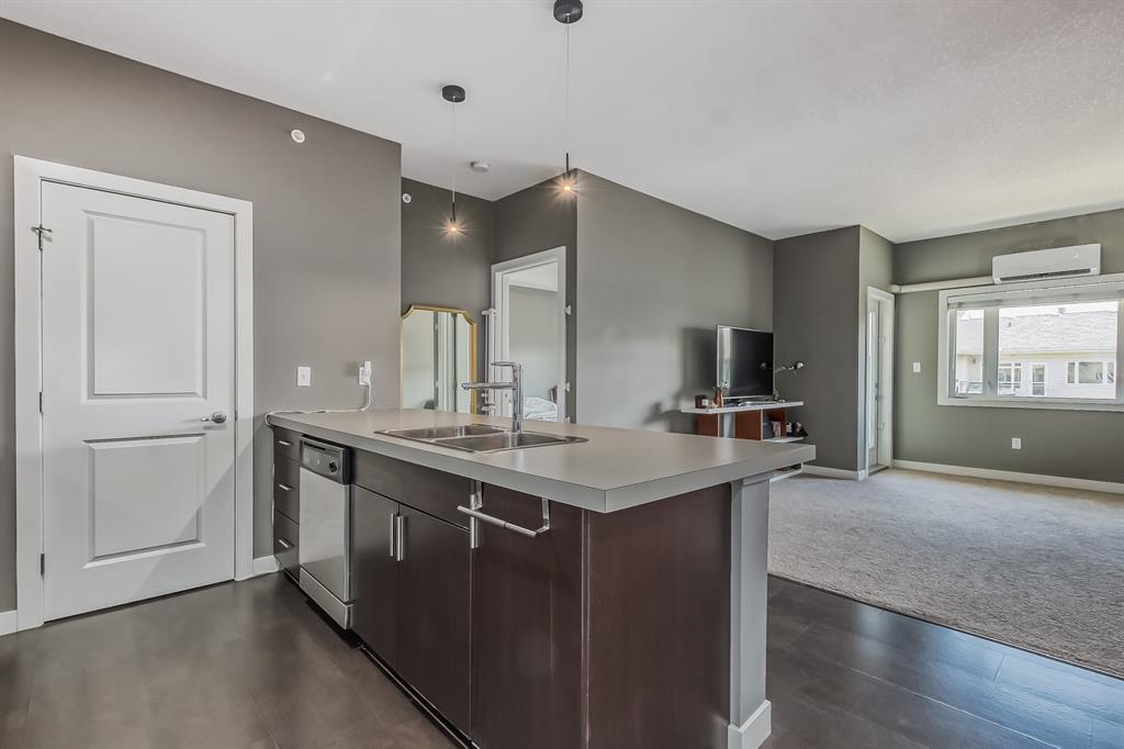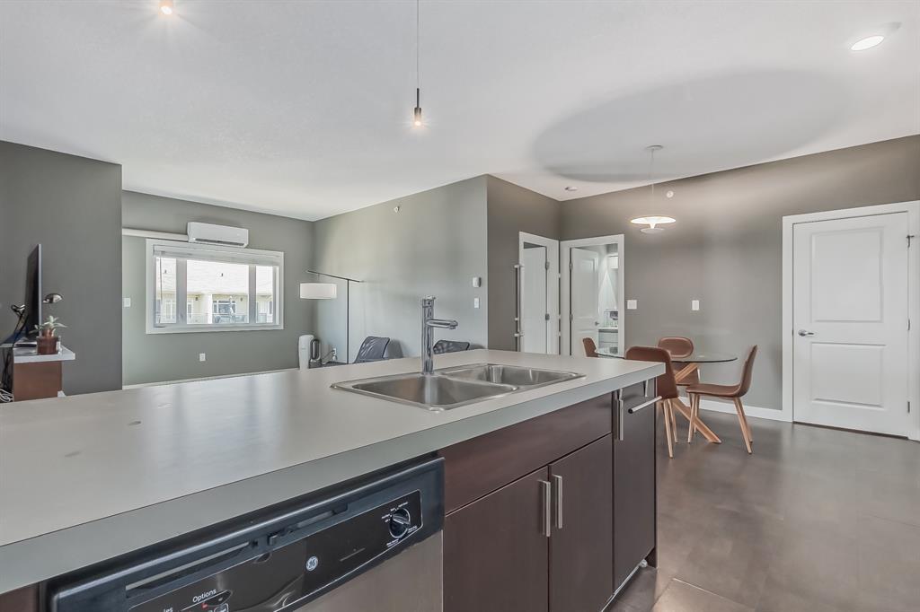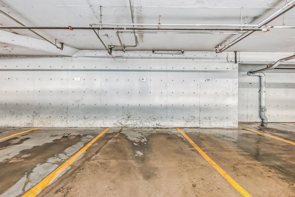 Top Floor 2 Bedroom 2 Bathroom condo with 9 foot ceilings! Enjoy a morning coffee from your east facing balcony that over looks the courtyard, and there is a natural gas hook up for your BBQ. Fantastic floor plan with the two bedrooms on either side of the spacious living room with 4pc bathroom(NEW TILES!). Kitchen has a large pantry and island with eating area that opens up into the main living area with NEWLY INSTALLED AIR CONDITIONER(2021). Master bedroom has a 4 piece en-suite bathroom and walk-in closet, the second bedroom is a good size, and for your convenience there is huge in suite laundry room with storage. Carpet has been professionally cleaned ready for the new owner. The condo comes with a heated underground Titled Parking stall and an additional storage space. The amenities are many which include elevators, Indoor and outdoor Visitor Parking, Social room that can be booked for private functions, Steam Room, Fitness Center. Amazing location just a short walk to C-Train, Grocery Store, Pharmacy, Coffee Shop, Restaurants, Pub. Very Reasonable condo fees which include Heat, Water, Sewer, and Electricity. (id:22211)