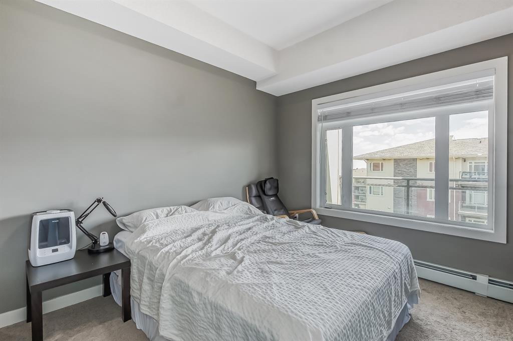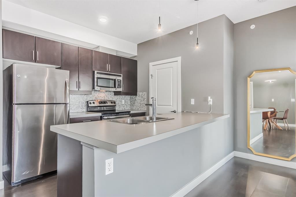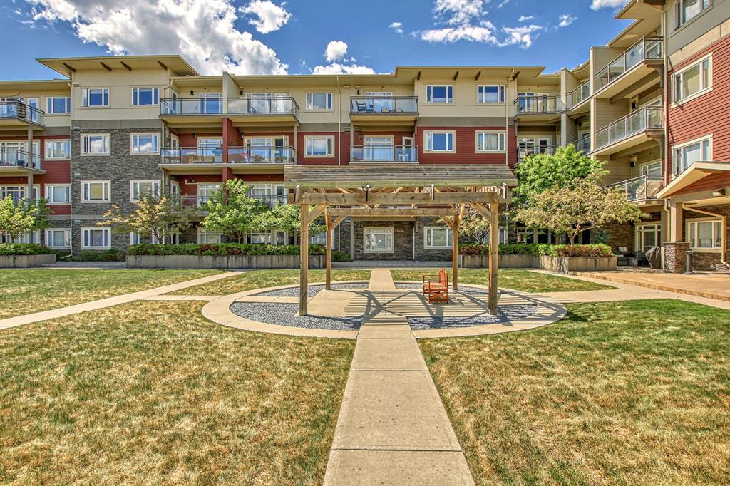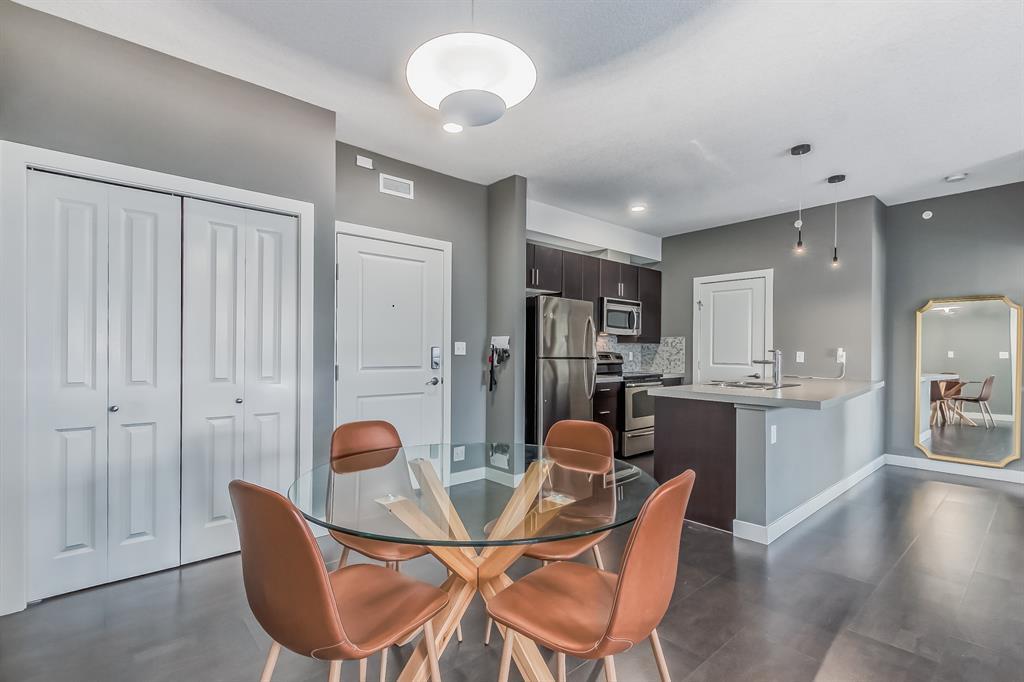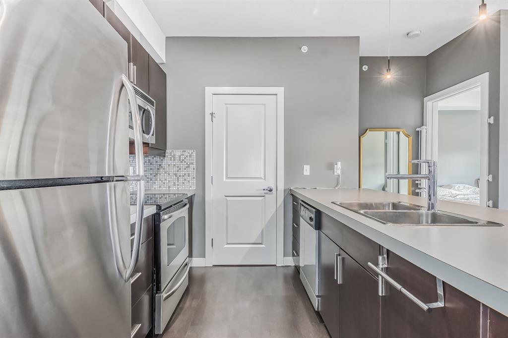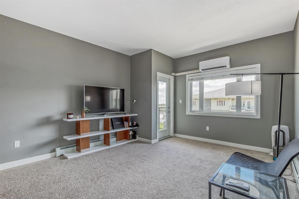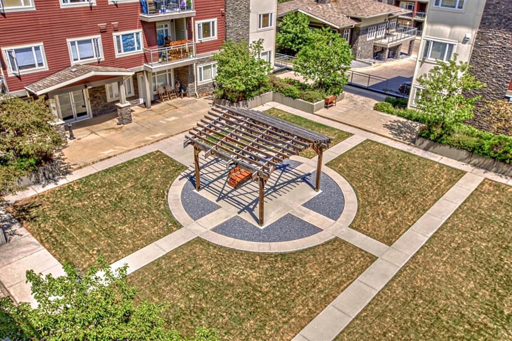 Top Floor 2 Bedroom 2 Bathroom condo with 9 foot ceilings! Enjoy a morning coffee from your east facing balcony that over looks the courtyard, and there is a natural gas hook up for your BBQ. Fantastic floor plan with the two bedrooms on either side of the spacious living room with 4pc bathroom(NEW TILES!). Kitchen has a large pantry and island with eating area that opens up into the main living area with NEWLY INSTALLED AIR CONDITIONER(2021). Master bedroom has a 4 piece en-suite bathroom and walk-in closet, the second bedroom is a good size, and for your convenience there is huge in suite laundry room with storage. Carpet has been professionally cleaned ready for the new owner. The condo comes with a heated underground Titled Parking stall and an additional storage space. The amenities are many which include elevators, Indoor and outdoor Visitor Parking, Social room that can be booked for private functions, Steam Room, Fitness Center. Amazing location just a short walk to C-Train, Grocery Store, Pharmacy, Coffee Shop, Restaurants, Pub. Very Reasonable condo fees which include Heat, Water, Sewer, and Electricity. (id:22211)