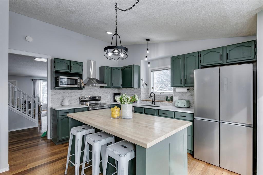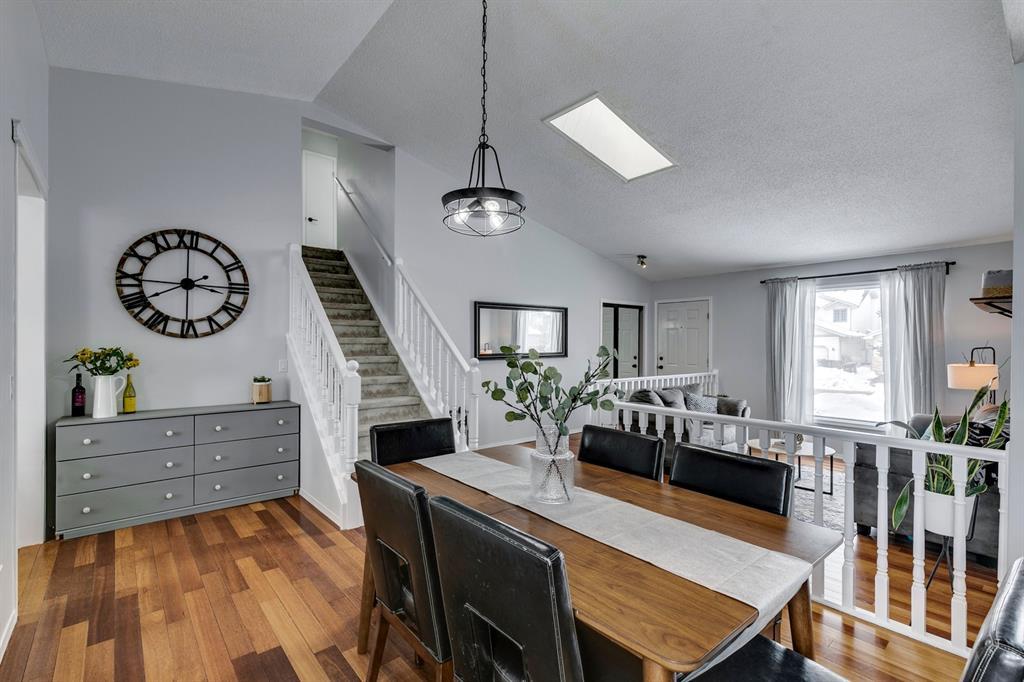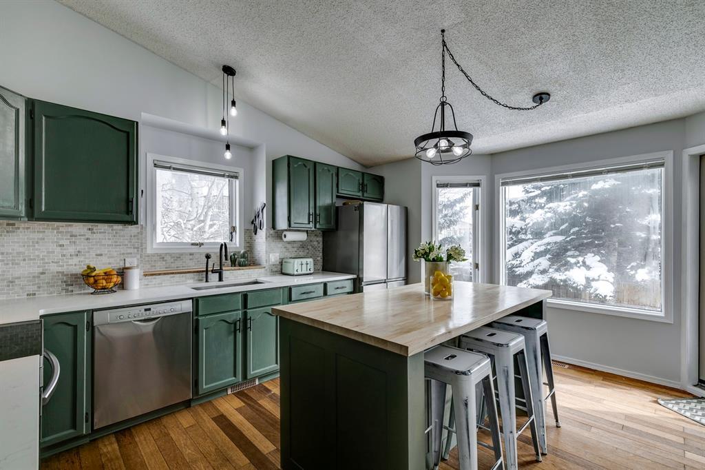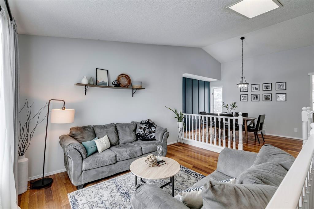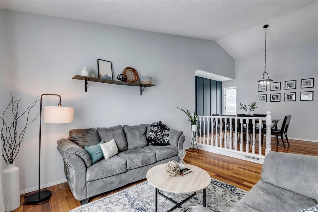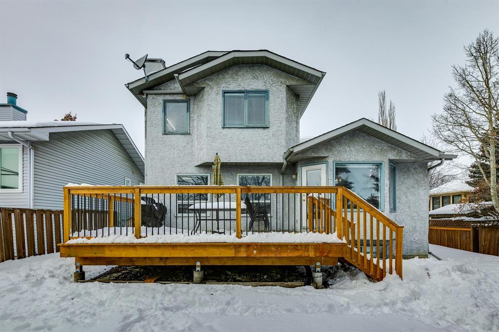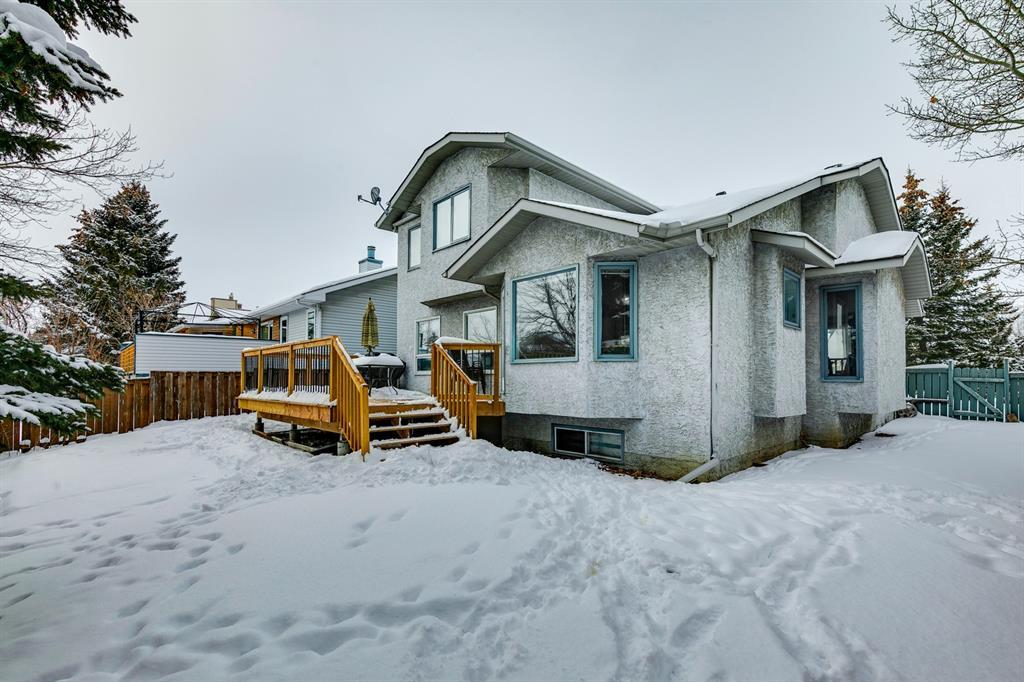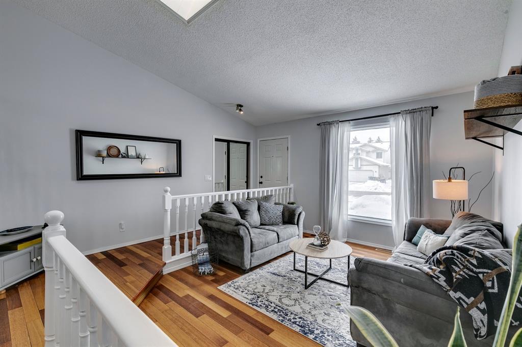 Fantastic, updated move in ready home in a quiet family-friendly location in the northwest community of Hawkwood. The main floor showcases a front living room with a large window that sits adjacent to the dining room. Enjoy the rear kitchen that boasts a fresh look, new appliances, loads of cabinets, custom island and a patio door leading out onto the large new rear deck (2022) with southeast-facing yard. Large family room is highlighted by custom-built ins, large windows and wood burning fireplace. There is a main floor den/bedroom with Jack and Jill door to a four-piece bathroom, laundry/mud room complete the main floor. There is hardwood flooring, numerous windows allowing for loads of natural light. The upper level offers two bedrooms, updated main four-piece bathroom (2022), primary bedroom with updated en-suite and finished off with walk-in closet. The fully finished basement has a fourth bedroom, three-piece bathroom, 2 large recreation rooms and plenty of additional storage area. Home has been newly painted (2022), new carpet on upper and partial main floor, all new contemporary lighting fixtures (2022) and air conditioning (2022). Great news roof(2016), hot water tanks (2019), high efficiency furnace (2017). This home is located steps from transit and Hawkstone Field with its various offerings and only minutes from schools, parks, all amenities and shopping. (id:22211)