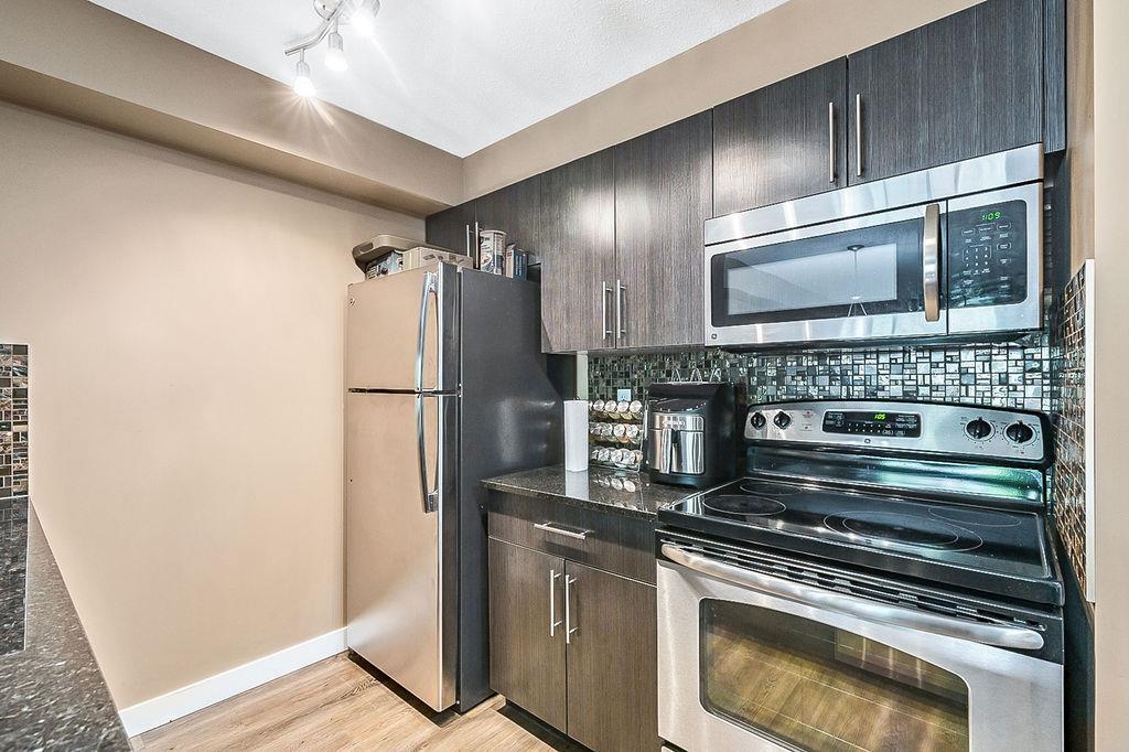 Move right into this great open floor plan with 2 great sized bedrooms and 2 full bathrooms. The modern kitchen has lots of cabinetry & counter space, granite countertops and overlooks the spacious family room with patio doors to the private balcony. Luxury vinyl plank flooring, laundry room has extra storage space and heated underground parking. Quick easy access to downtown, C Train Station only minutes walking distance and a short walk to the Bow River Valley with stunning views of the mountains and Calgary's spectacular downtown skyline! (id:22211)