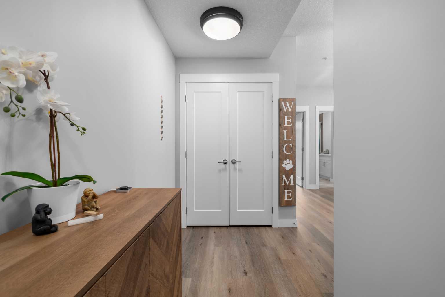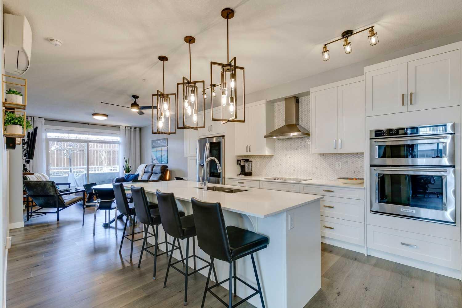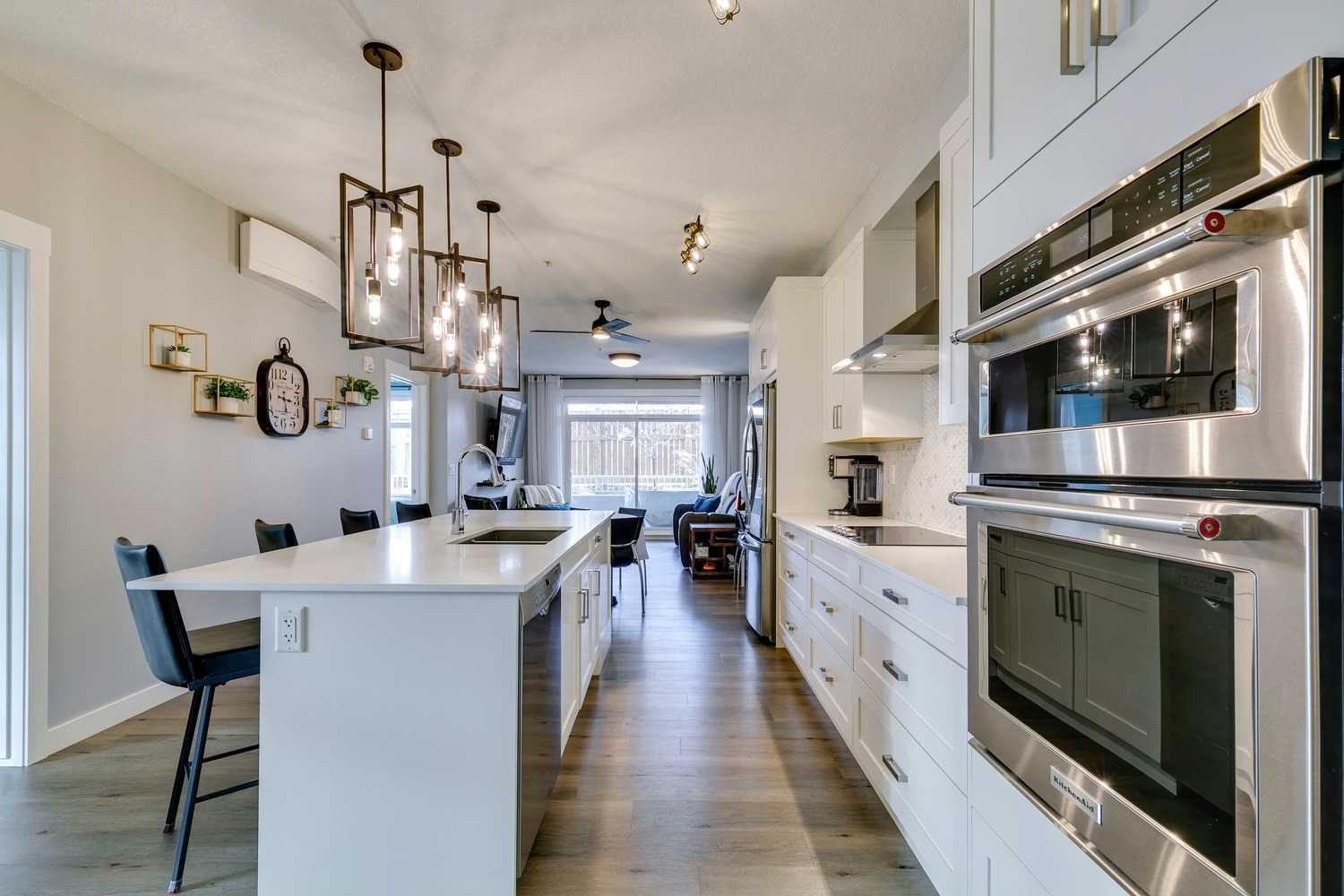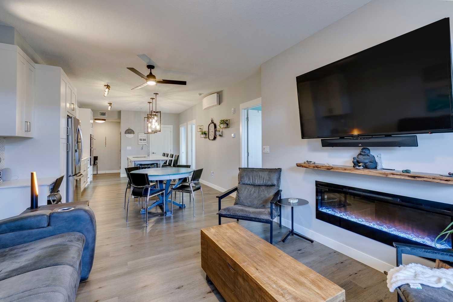 Welcome to this beautifully upgraded, move-in ready main floor corner suite in the heart of Auburn Bay—complete with full air conditioning, two spacious bedrooms, and two elegant bathrooms. Boasting soaring 9’ ceilings and an abundance of natural light from oversized dual-pane windows, this bright and airy home offers a modern open-concept layout with a premium finish throughout. Every detail has been thoughtfully upgraded, making it a true standout. The showstopping kitchen is a chef’s dream, featuring a massive quartz island with designer pendant lighting, sleek white soft-close cabinetry with built-in work space, and a full suite of high-end stainless-steel appliances—including a built-in wall oven, induction cooktop, chimney-style hood fan, built-in microwave, bar fridge, and upgraded refrigerator. The inviting living area centers around a cozy electric fireplace and flows seamlessly onto the oversized, private balcony—ideal for relaxing or entertaining. Enjoy a natural gas BBQ hookup and the comfort of the award-winning makeup air system that delivers fresh, filtered air year-round to every suite. The bright and spacious primary suite offers a large walk-in closet and a spa-inspired ensuite with a glass-enclosed shower and dual undermount sinks set in a quartz vanity. The generously sized second bedroom is located next to the full main bath, making it ideal for guests or a home office. This incredible home also includes double tandem titled underground heated parking and an extra-large private storage unit—a rare and valuable bonus! Situated in Auburn Bay, one of Calgary’s most desirable lake communities, residents enjoy exclusive lake access, scenic walking trails, beautiful parks, nearby shops and restaurants, South Health Campus Hospital, and a true sense of community. This pet-friendly complex offers both comfort and convenience in a luxurious setting. Don’t miss your chance to own this exceptional home—book your private showing today!