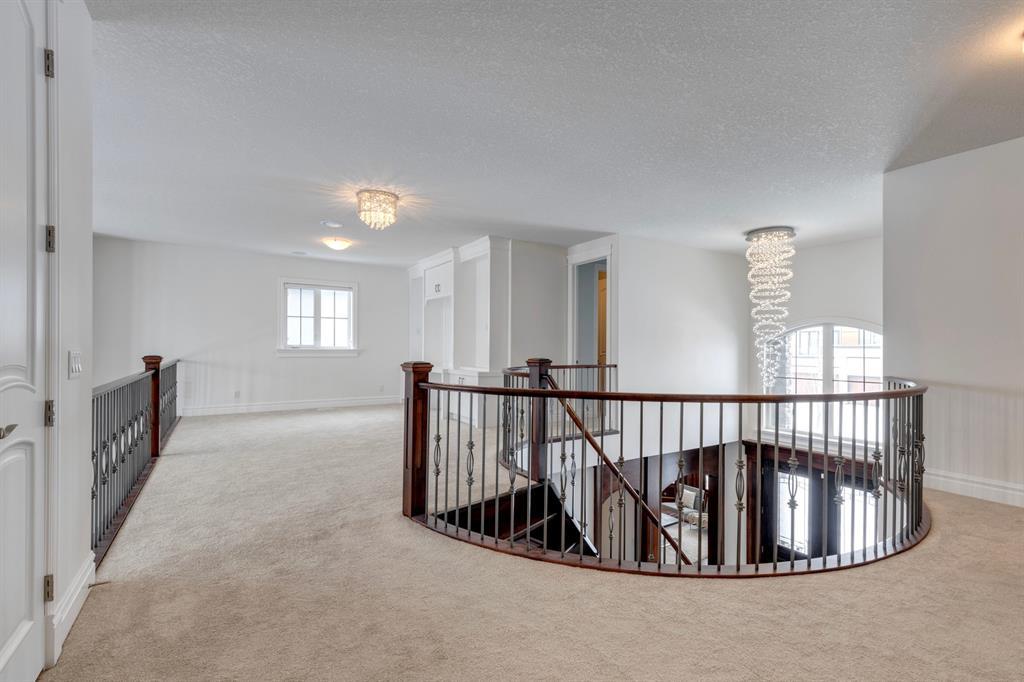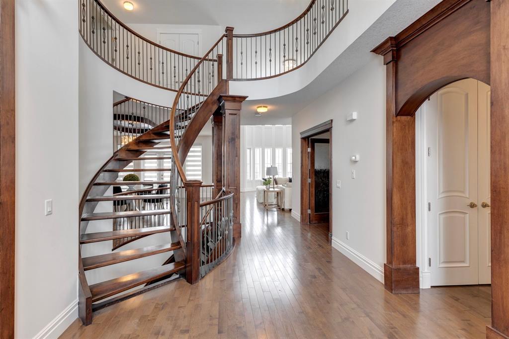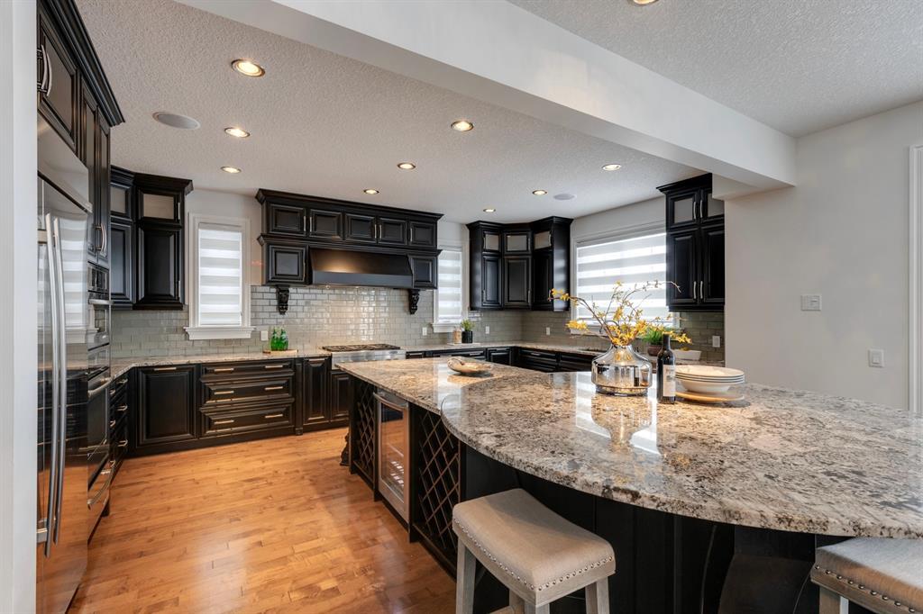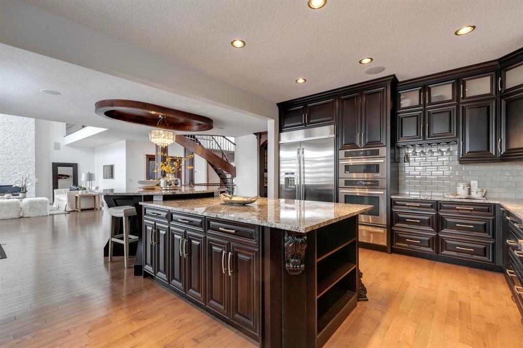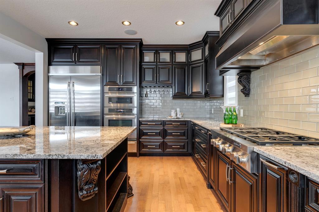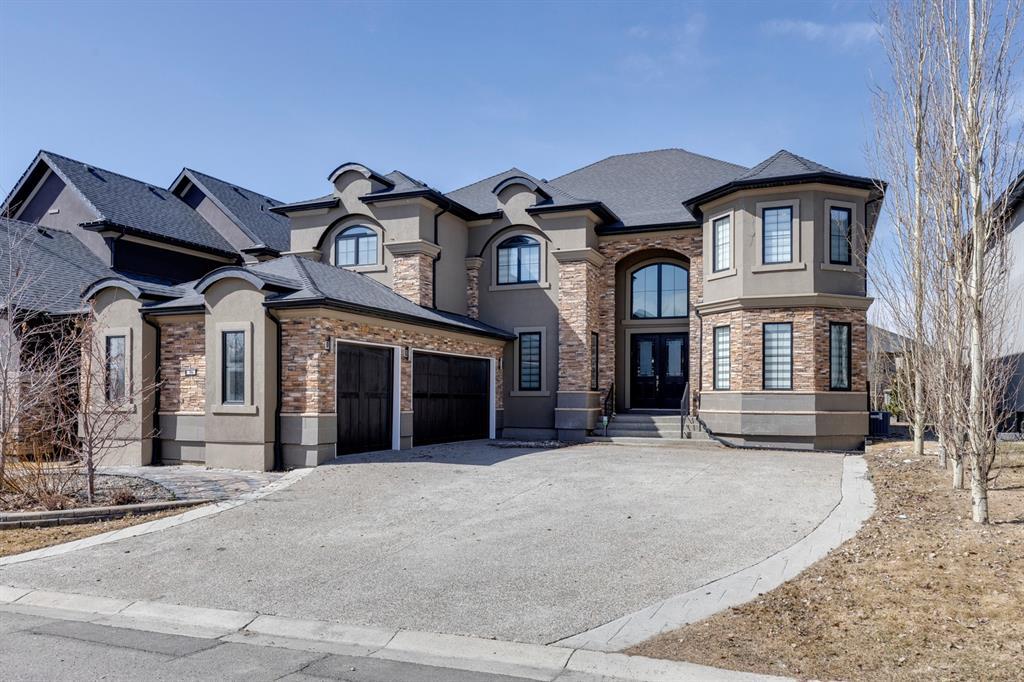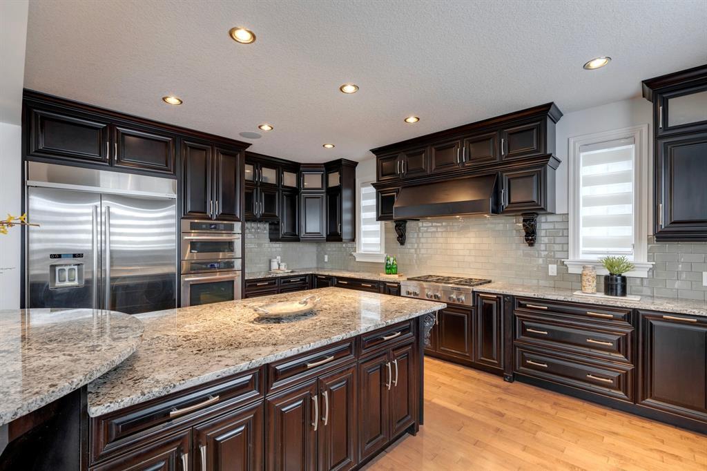 Located on one of the most desirable cul-de-sacs in the district, this grand, custom built home is ideal for a large family or someone who loves to entertain. Step inside and be wowed by the curved staircase, the two storey foyer and rich wood arches and wainscotting. Entertain friends in the front facing formal living room before serving dinner in the elegant dining room. A butler’s pantry with a sink and bar fridge connects into the large kitchen. Home chef’s will love all the counters and cabinets as well as the 6-burner gas cooktop, double wall ovens and warming drawer, beverage fridge, and stainless fridge/freezer. Imagine cooking together for family celebrations at one end of the kitchen while your guests nibble appetizers at the one-of-a-kind, circular island eating bar. Additional features making this kitchen extra special are the caterer’s kitchen (spice kitchen) containing a range, microwave and sink, as well as a large walk-in pantry for Costco supplies. Adjacent to the kitchen is a casual dining nook and a spacious family room with soaring ceilings, a gas fireplace and and a double height curved bay window bathing the room in sunlight. Double doors lead into the home office with built-in desk and bookcases. Upstairs a loft area with a built-in desk overlooks the family room and foyer. The primary bedroom features a barrel vaulted ceiling, a double sided fireplace, and two arches opening into an ensuite with a jetted tub and large shower. There are three additional bedrooms each with their own walk-in-closets and ensuites, and a laundry room on this level. The fully developed walk-out basement includes a games area, wet bar with lots of wine storage, a recreation room with a fireplace, gym, media room, two bedrooms and two bathrooms. A triple garage has lots of storage space and a staircase down to the basement level. Outside, the yard faces west and the deck off the kitchen has a gas fireplace to warm you on chilly nights as you watch the sunset. Mature trees and a landscaped retaining wall offer privacy. Down the street is a playground, and Rundle College and Strathcona Square Shopping Center are a short walk away. This home has plenty of room for everyone in the family! (id:22211)