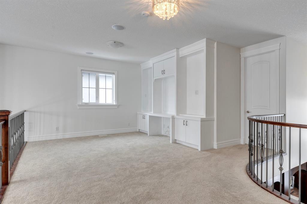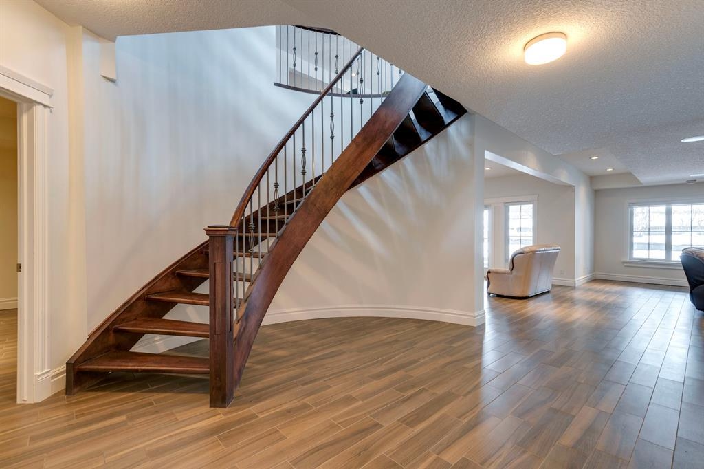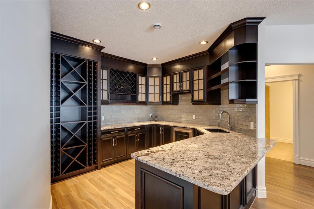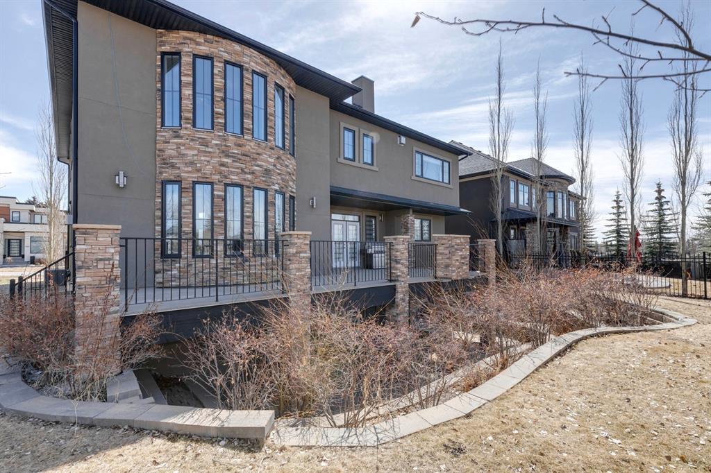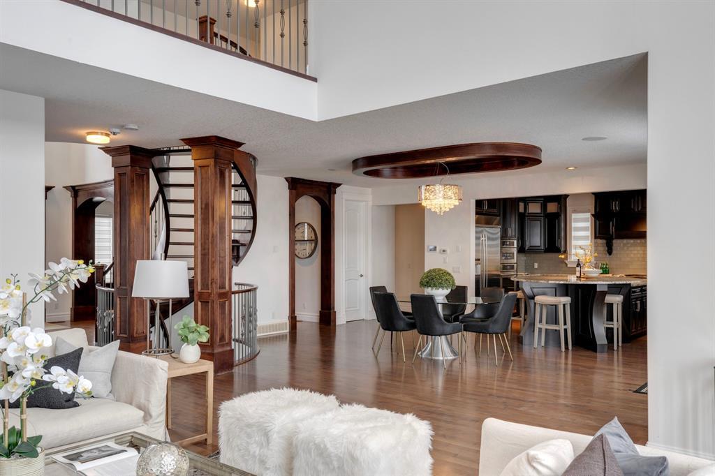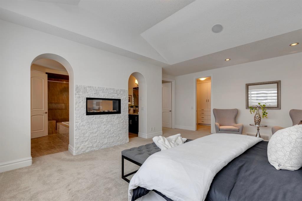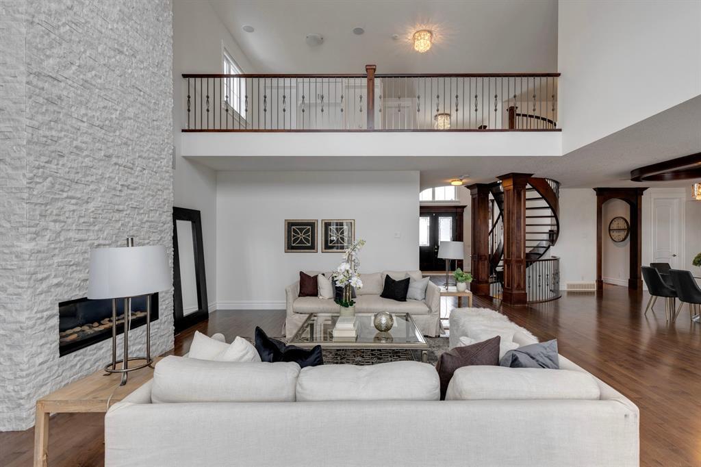 Located on one of the most desirable cul-de-sacs in the district, this grand, custom built home is ideal for a large family or someone who loves to entertain. Step inside and be wowed by the curved staircase, the two storey foyer and rich wood arches and wainscotting. Entertain friends in the front facing formal living room before serving dinner in the elegant dining room. A butler’s pantry with a sink and bar fridge connects into the large kitchen. Home chef’s will love all the counters and cabinets as well as the 6-burner gas cooktop, double wall ovens and warming drawer, beverage fridge, and stainless fridge/freezer. Imagine cooking together for family celebrations at one end of the kitchen while your guests nibble appetizers at the one-of-a-kind, circular island eating bar. Additional features making this kitchen extra special are the caterer’s kitchen (spice kitchen) containing a range, microwave and sink, as well as a large walk-in pantry for Costco supplies. Adjacent to the kitchen is a casual dining nook and a spacious family room with soaring ceilings, a gas fireplace and and a double height curved bay window bathing the room in sunlight. Double doors lead into the home office with built-in desk and bookcases. Upstairs a loft area with a built-in desk overlooks the family room and foyer. The primary bedroom features a barrel vaulted ceiling, a double sided fireplace, and two arches opening into an ensuite with a jetted tub and large shower. There are three additional bedrooms each with their own walk-in-closets and ensuites, and a laundry room on this level. The fully developed walk-out basement includes a games area, wet bar with lots of wine storage, a recreation room with a fireplace, gym, media room, two bedrooms and two bathrooms. A triple garage has lots of storage space and a staircase down to the basement level. Outside, the yard faces west and the deck off the kitchen has a gas fireplace to warm you on chilly nights as you watch the sunset. Mature trees and a landscaped retaining wall offer privacy. Down the street is a playground, and Rundle College and Strathcona Square Shopping Center are a short walk away. This home has plenty of room for everyone in the family! (id:22211)