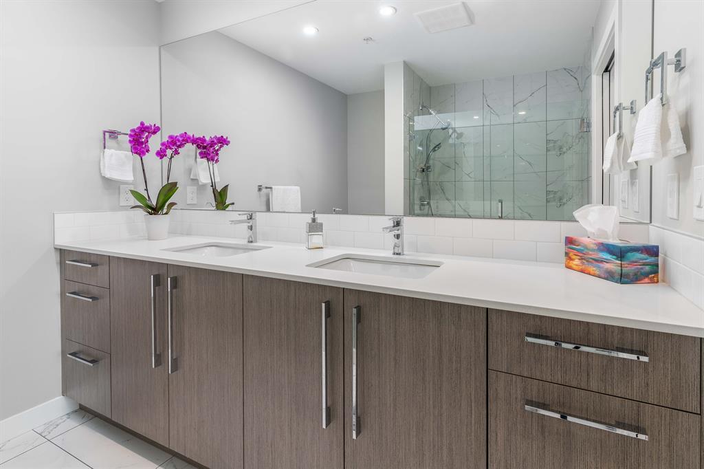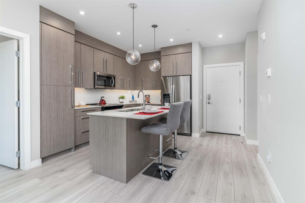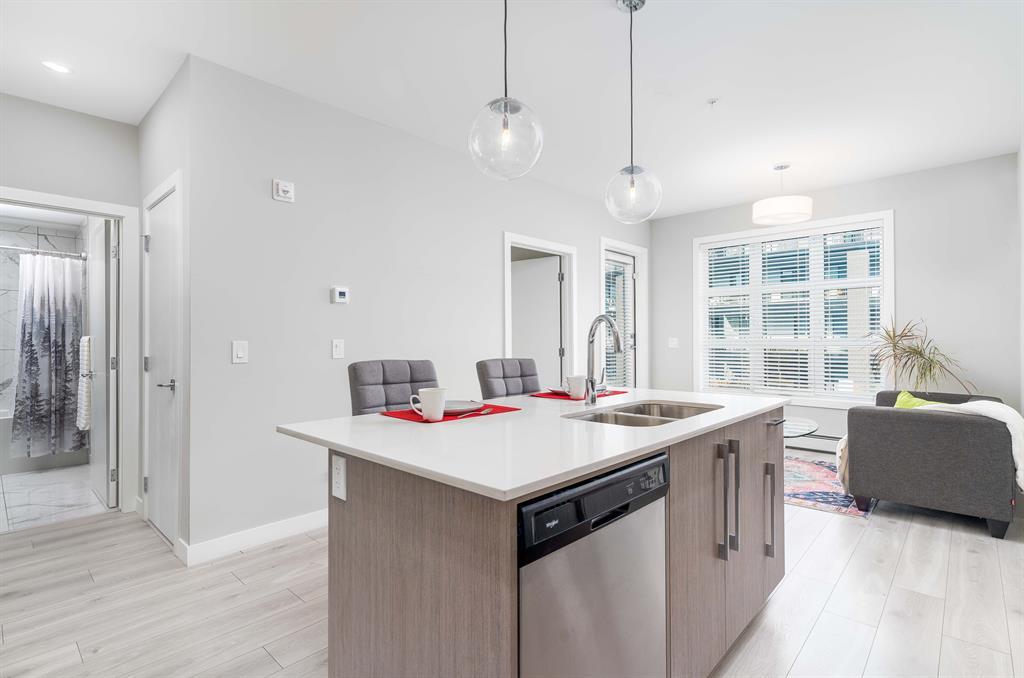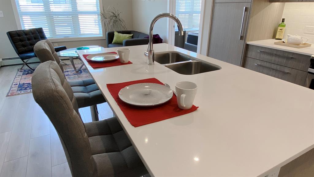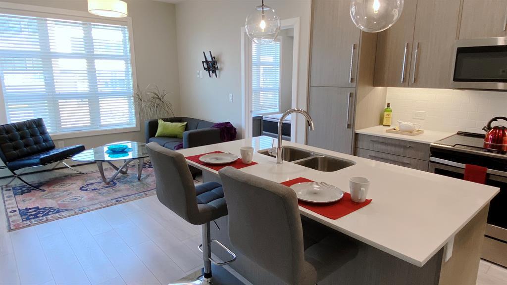PRICE REDUCED! Welcome to Suite 205 at Maple. Contemporary independent living for residents aged 55+ This is a pristine 2 bedroom condo with 2 full bathrooms. The open concept design creates a natural flow from kitchen to living room, bathed in sunlight. The gorgeous kitchen features full height cabinetry, quartz countertops, a generous island, stainless steel appliances including built-in Microwave, and French door style refrigerator with water and ice dispenser making dining and entertaining a delight. The Primary Bedroom is a welcome retreat with a walk through closet that leads to the Ensuite bathroom. A full sized walk-in shower, with glass enclosure is sure to please, including an extra handheld shower head for easy accessibility. Dual Sinks with ample countertop and storage space complete this spa-like package.The second bedroom is also a good size, large enough for bedroom furniture, and versatile enough to use any way you wish… perhaps a home office? The bedroom window overlooks a spacious balcony to enjoy those summer evenings, or morning coffee. A second full bathroom, with soaker tub/shower combination and in-suite laundry round out this lovely condo. Residents of Maple may obtain access to additional services such as dining, special events, drop-in fitness, group programs, health and wellness seminars, salon and barber services, and more thanks to a partnership with The Brenda Strafford Foundation Cambridge Manor. When it comes to parking in the winter, you're covered… there's a storage room for bicycles, plus there’s one Titled Indoor stall in the heated parkade. (id:22211)