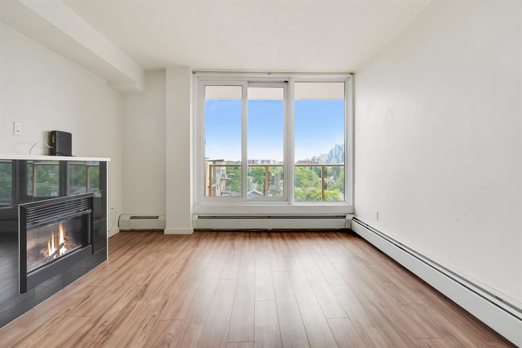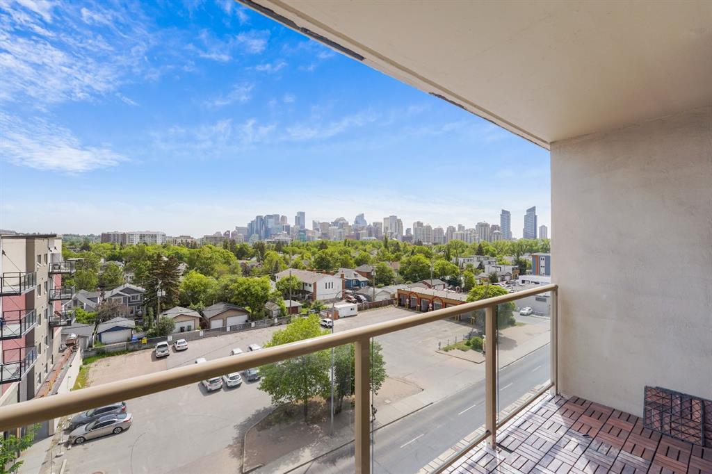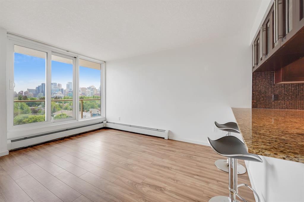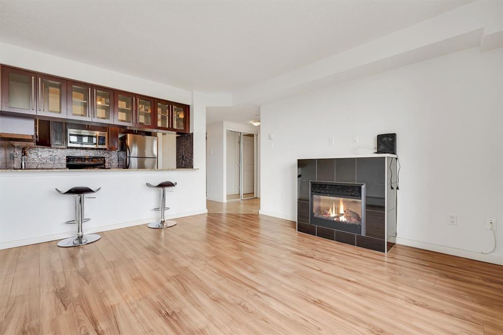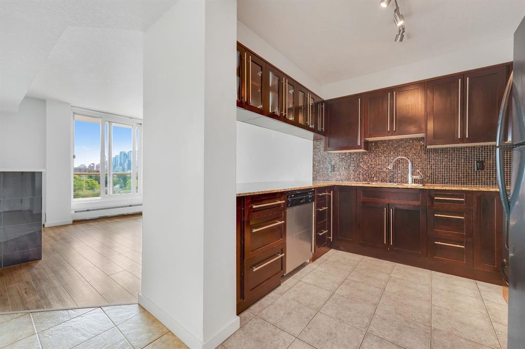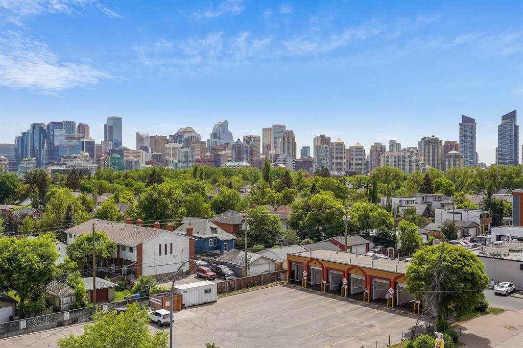 This immaculate TOP FLOOR unit showcases fantastic CITY SKYLINE VIEWS and must be seen. Very close to the downtown core in the heart of Hillhurst, and walking distance to the pubs, restaurants, and shops of Kensington. Stroll to the walking paths along the River, beautiful Riley Park and the Sunnyside LRT station and very close to SAIT! In a concrete building, this remodelled 1 bedroom condo features an amazing kitchen perfect for entertaining with eating bar, stainless steel appliances, granite countertops, mosaic tile backsplash, and darker stained cabinetry, a 5 piece bath with jetted tub, granite counters and Grohe fixtures, cozy living room with fireplace, IN-SUITE laundry, parking stall (#40) and separate private storage area (#66) . The building offers a fully equipped exercise room with newer equipment and bike storage! The very low condo fee ($315/month) includes heat and water and sewer. Experience the great location, style and convenience of this condo and the Kensington area. (id:22211)