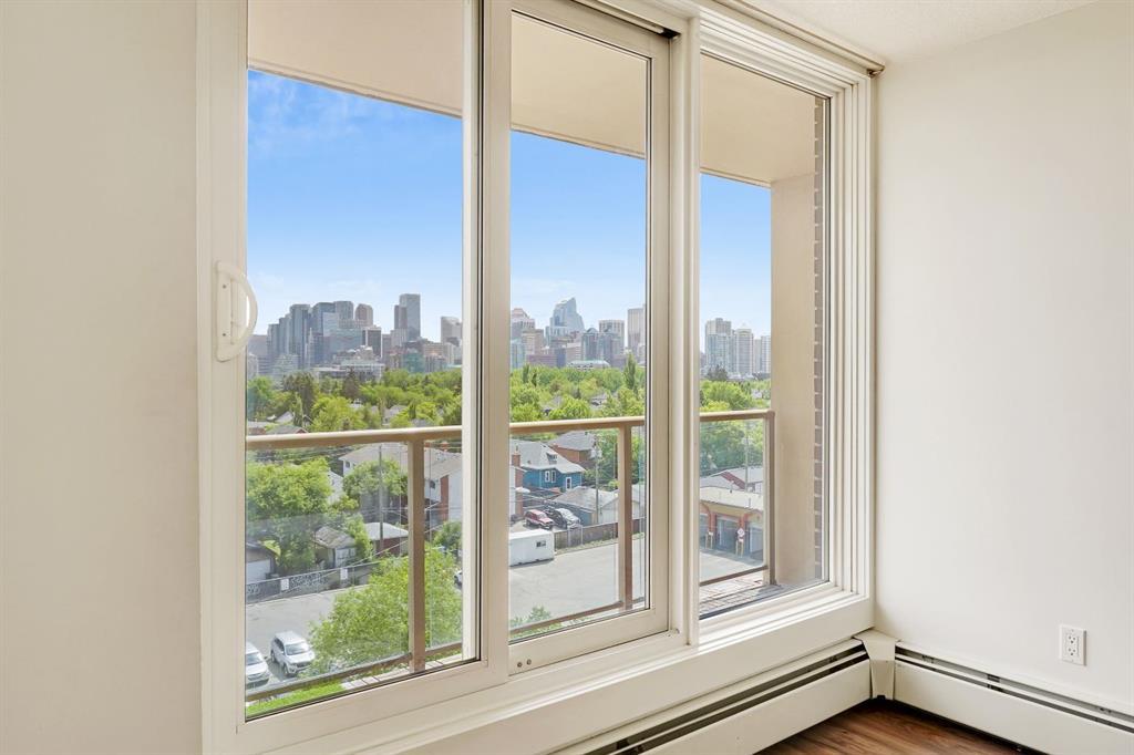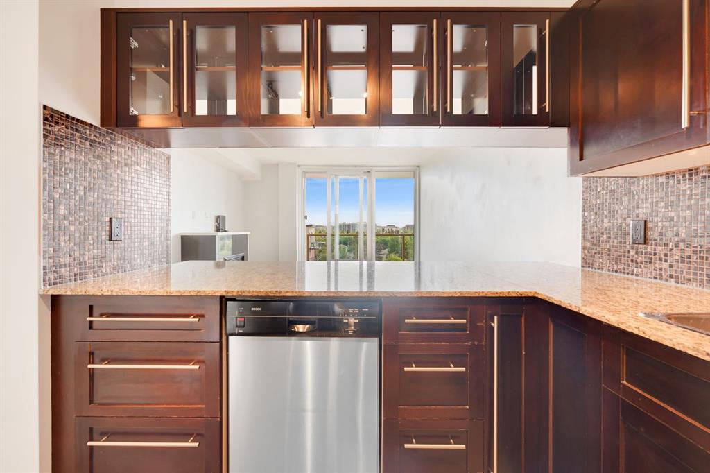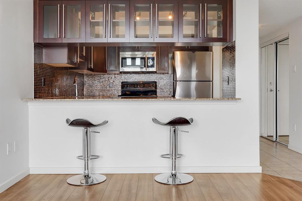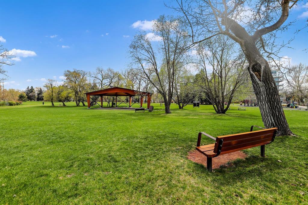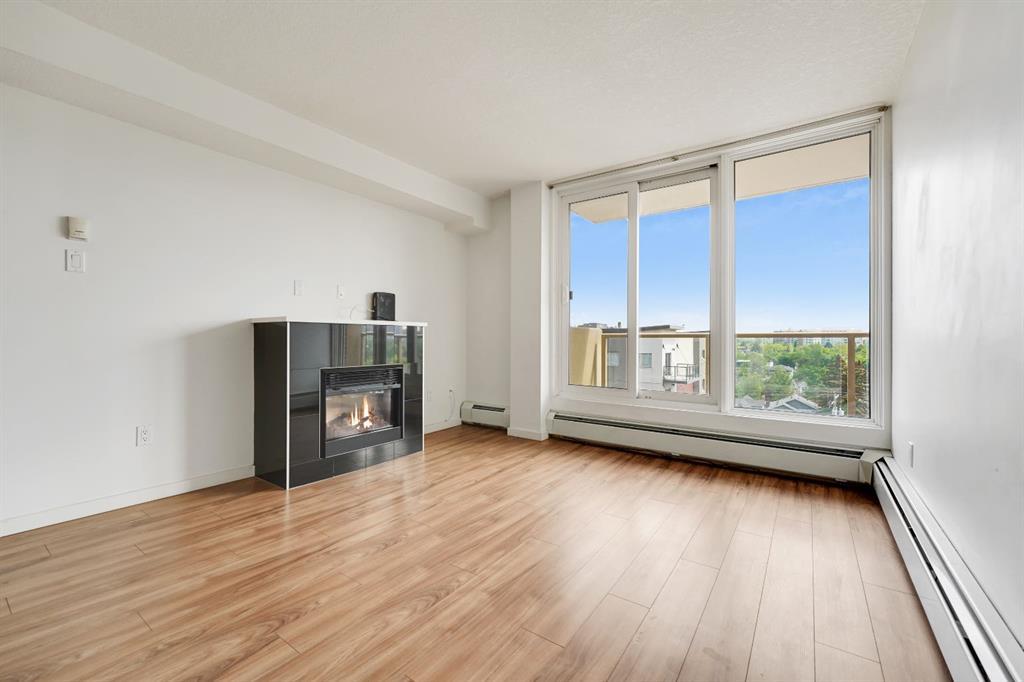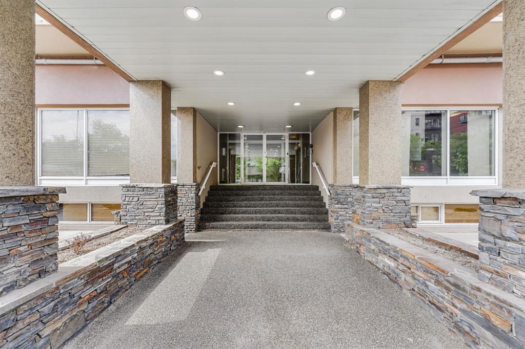 This immaculate TOP FLOOR unit showcases fantastic CITY SKYLINE VIEWS and must be seen. Very close to the downtown core in the heart of Hillhurst, and walking distance to the pubs, restaurants, and shops of Kensington. Stroll to the walking paths along the River, beautiful Riley Park and the Sunnyside LRT station and very close to SAIT! In a concrete building, this remodelled 1 bedroom condo features an amazing kitchen perfect for entertaining with eating bar, stainless steel appliances, granite countertops, mosaic tile backsplash, and darker stained cabinetry, a 5 piece bath with jetted tub, granite counters and Grohe fixtures, cozy living room with fireplace, IN-SUITE laundry, parking stall (#40) and separate private storage area (#66) . The building offers a fully equipped exercise room with newer equipment and bike storage! The very low condo fee ($315/month) includes heat and water and sewer. Experience the great location, style and convenience of this condo and the Kensington area. (id:22211)