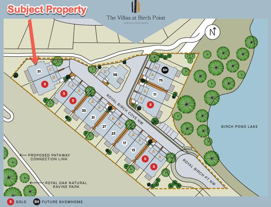 The Villas at Birch Point gives you the opportunity to live in an exclusive project in one of NW Calgary’s most beloved communities—Royal Oak. Overlooking the Royal Oak Natural Ravine Park, this 3-Bedroom, 2.5-bath, 2,866 sq. ft. (1,440 sq.ft. RMS) Villa with a double attached garage and a fully developed walk-out basement are sure to fit your lifestyle perfectly. The main floor open-concept layout features 10’ high main floor ceilings, a chef-inspired kitchen with an upgraded appliance package, quartz countertops throughout and custom full-height cabinetry opening onto the dining room. The spacious living room is completed with a gas fireplace and access to an expansive 27’ x 10’ vinyl balcony overlooking the scenic, natural surroundings. A spacious primary bedroom with 11-foot decorative tray ceiling detail complete with a 5-piece ensuite with a luxurious curbless full tiled walk-in shower, walk-in closet and in-suite laundry for added convenience along with front den completes the main floor. Downstairs, you’ll find two generously sized bedrooms, exercise room, a full bathroom and additional living space with a wet bar that is perfect for entertaining. Walk-out access to a lower-level concrete patio with professionally designed landscaping included. The Villas at Birch Point have been crafted for better living with no detail overlooked. The high-quality, low-maintenance materials ensure long-term, worry-free living. Condo fees include building insurance, exterior building maintenance and long-term reserve/replacement fund, landscape maintenance, snow removal service, and garbage/recycling/organics service so you can enjoy the Royal Oak lifestyle. With Country Hills Blvd and Stoney Trail just moments away and local shopping and amenities steps from your doorstep, you’re never too far from your favourite places in the NW. Possession estimated August to October 2023—make this exclusive opportunity yours today! RMS measurements taken from plan as home is under constr uction. (id:22211)