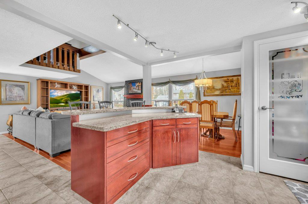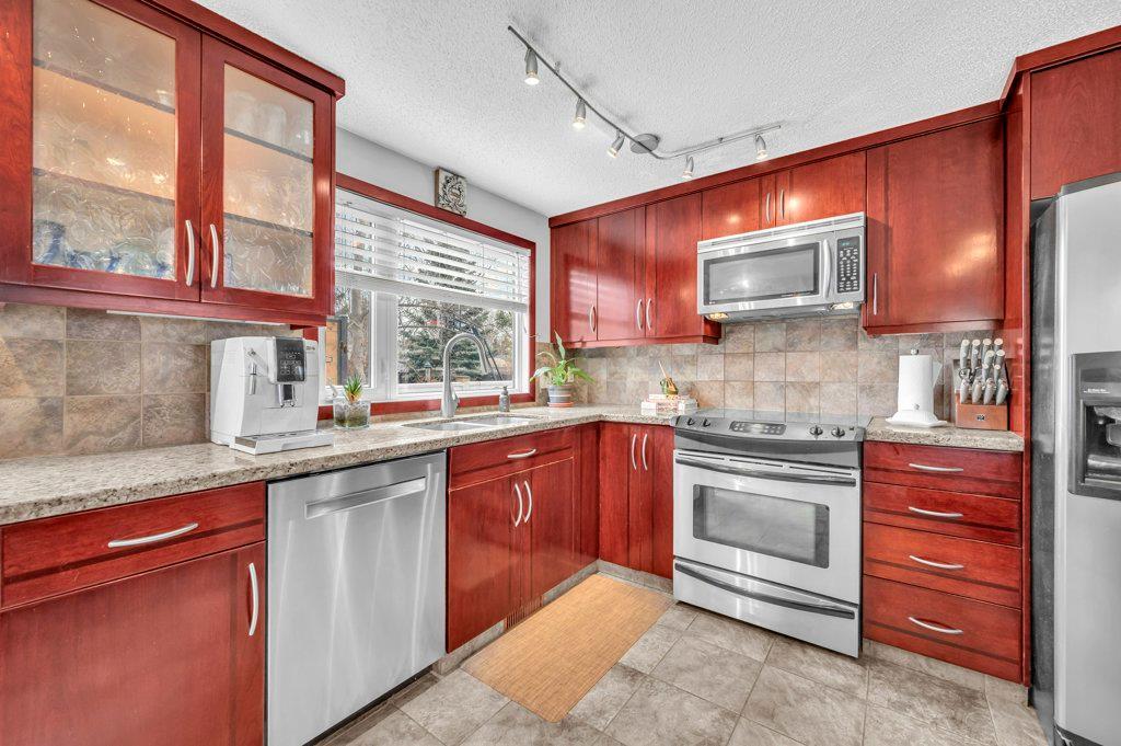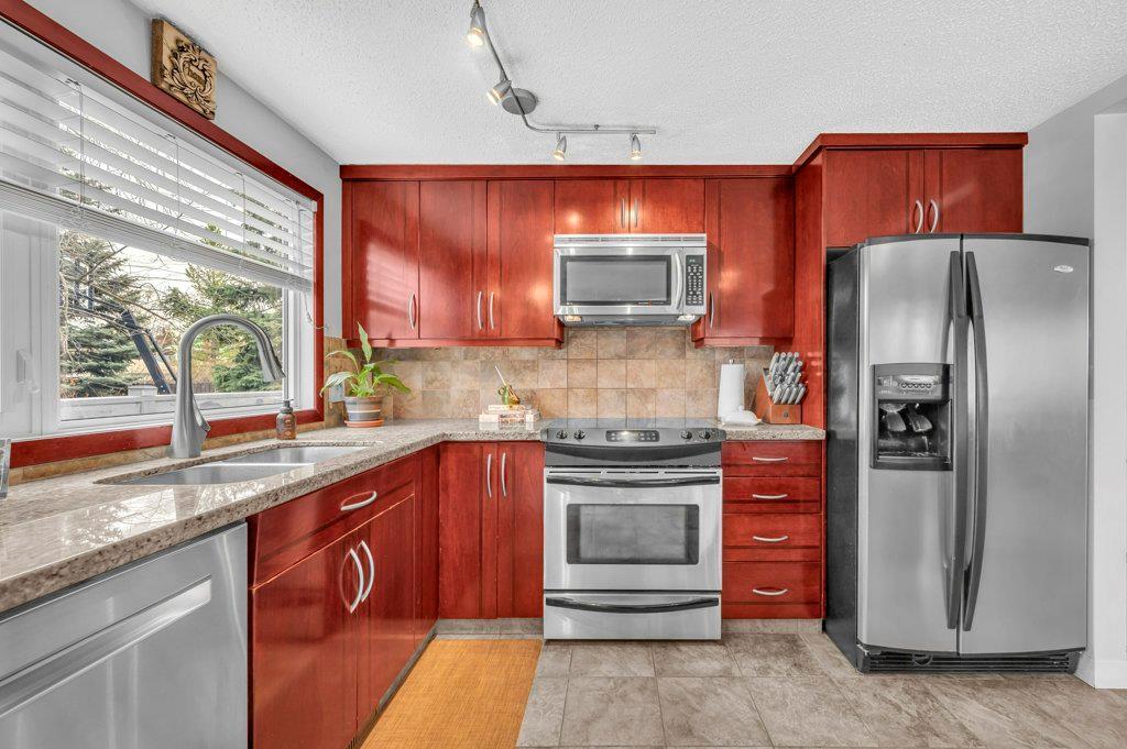 Welcome Home to this beautifully updated and immaculately maintained split level property in the desirable community of Oakridge. Tucked away on a quiet cul-de-sac and backing the greenbelt, this home offers over 2,500 square feet of finished living space including 5 huge bedrooms and 3 bathrooms! As you enter this home, you are welcomed by the abundance of natural light and soaring vaulted ceiling, offering a large front living room complete with a wood burning fireplace. The large and functional kitchen has been completely updated with stainless steel appliances, including a brand new dishwasher, granite countertops and custom built cherry wood extended height cabinetry. Upstairs you will find 2 large bedrooms, including a newly updated 4-piece bathroom and 2-piece ensuite in the primary. This unique floor-plan features a loft which offers a 3rd large bedroom and a perfect space for an office or reading nook. The cozy second family room located on the lower level, features a second wood-burning fireplace, 4th large bedroom and a 3-piece bathroom. Lastly, a 5th bedroom, huge storage room and laundry complete the basement. Outside, this south facing backyard oasis has been gorgeously landscaped with established trees, flowers and gardens and is complete with a large concrete patio space, including an awning. This property also highlights a private gazebo featuring a hot tub, a fire pit and storage shed, making it easy to enjoy the summer evenings with friends and family. Lastly, this home comes complete with a double attached garage which is heated and insulated, in addition to the large driveway for an abundance of parking! Additional upgrades include new vinyl windows (2017), New Hot Water Tank (2023), New Interior Doors (2023) and Roof (2020). You cannot beat the blissful location of this one of a kind property (id:22211)